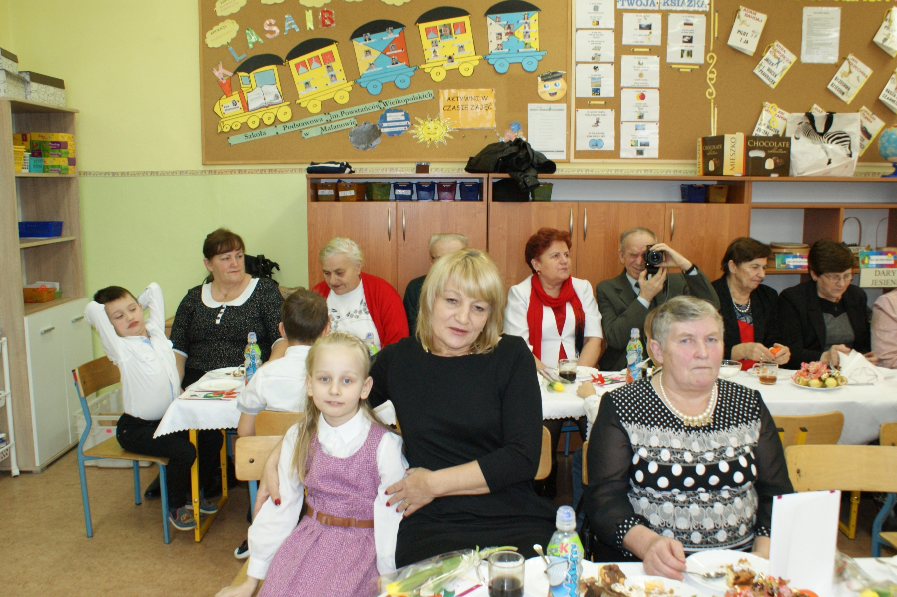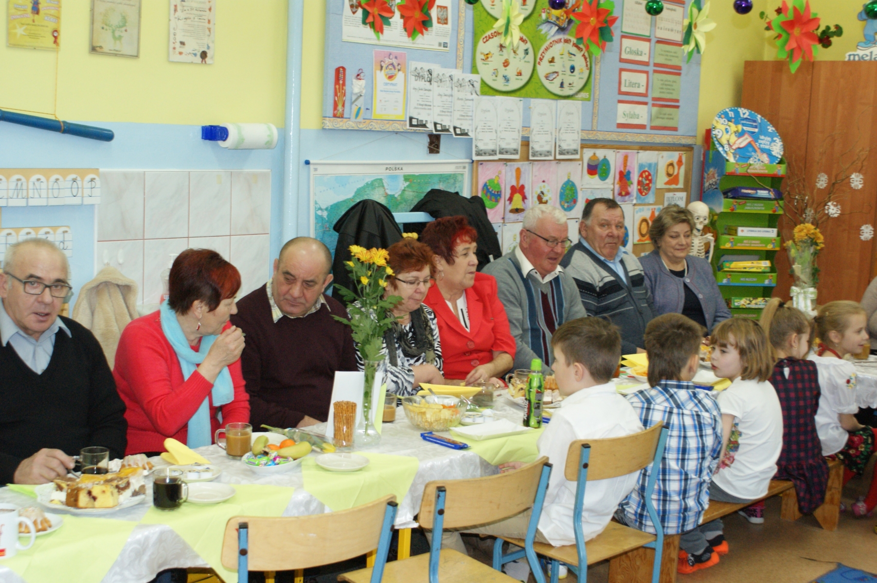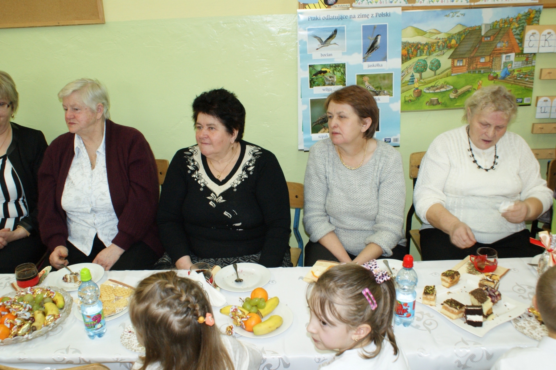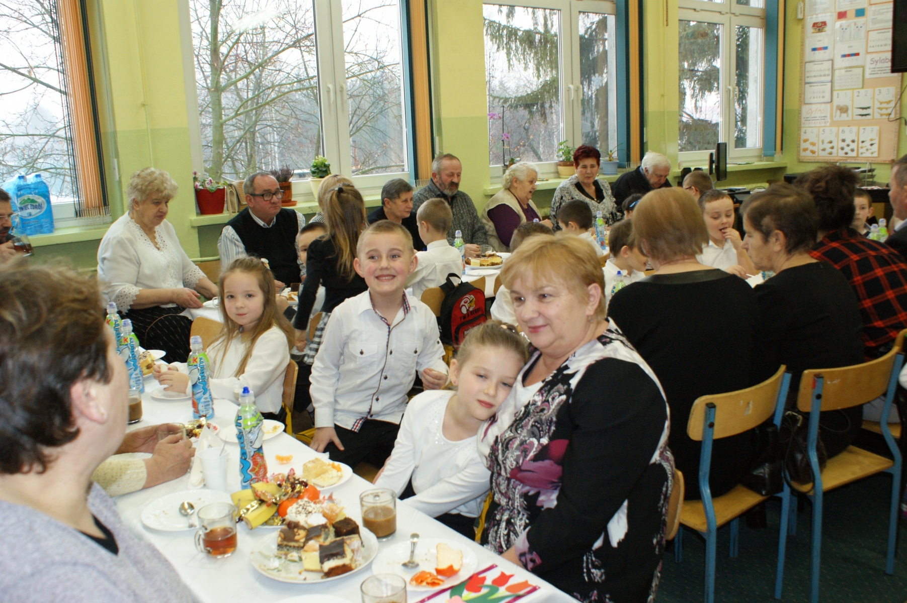 Po uroczystości na sali gimnastycznej goście zostali zaproszeni przez swoje wnuczęta do klas na słodki poczęstunek. Tam też zostali obdarowani kwiatami i laurkami, nie zabrakło też wspólnej zabawy.