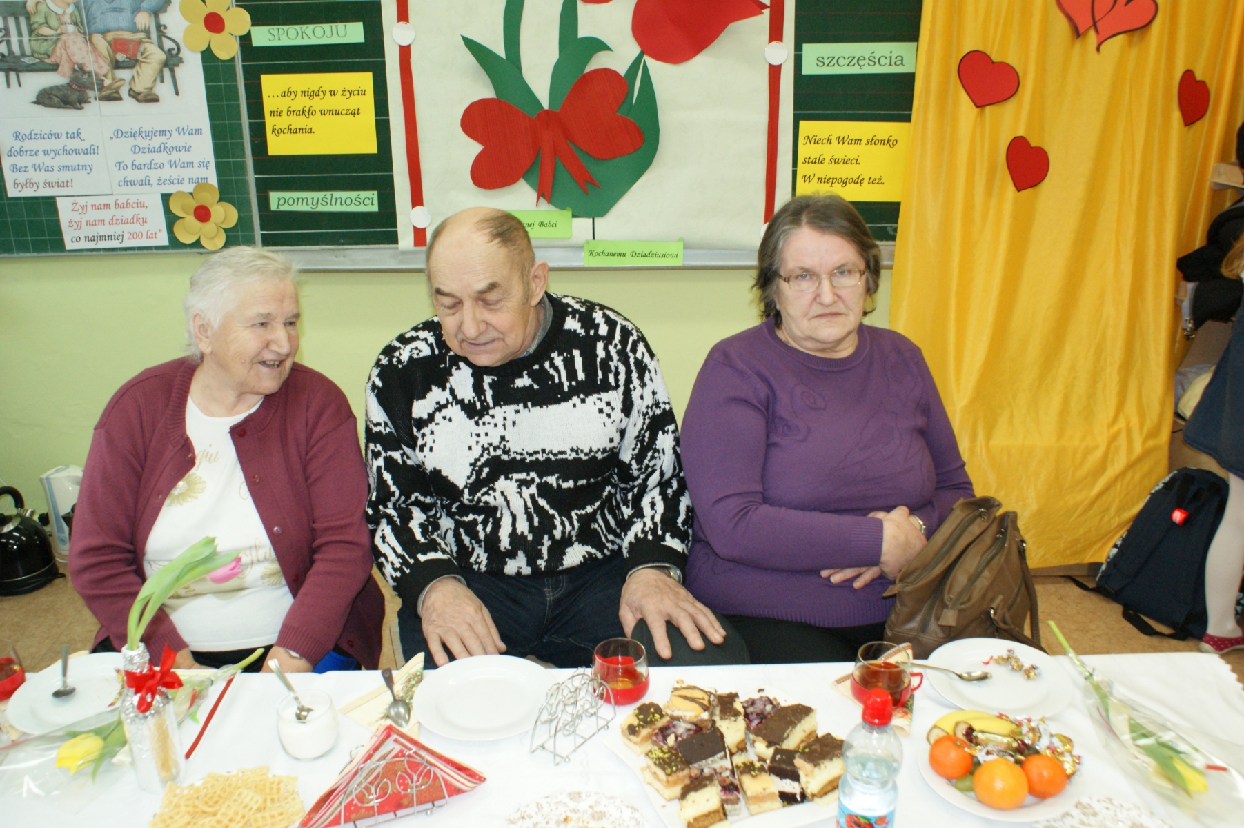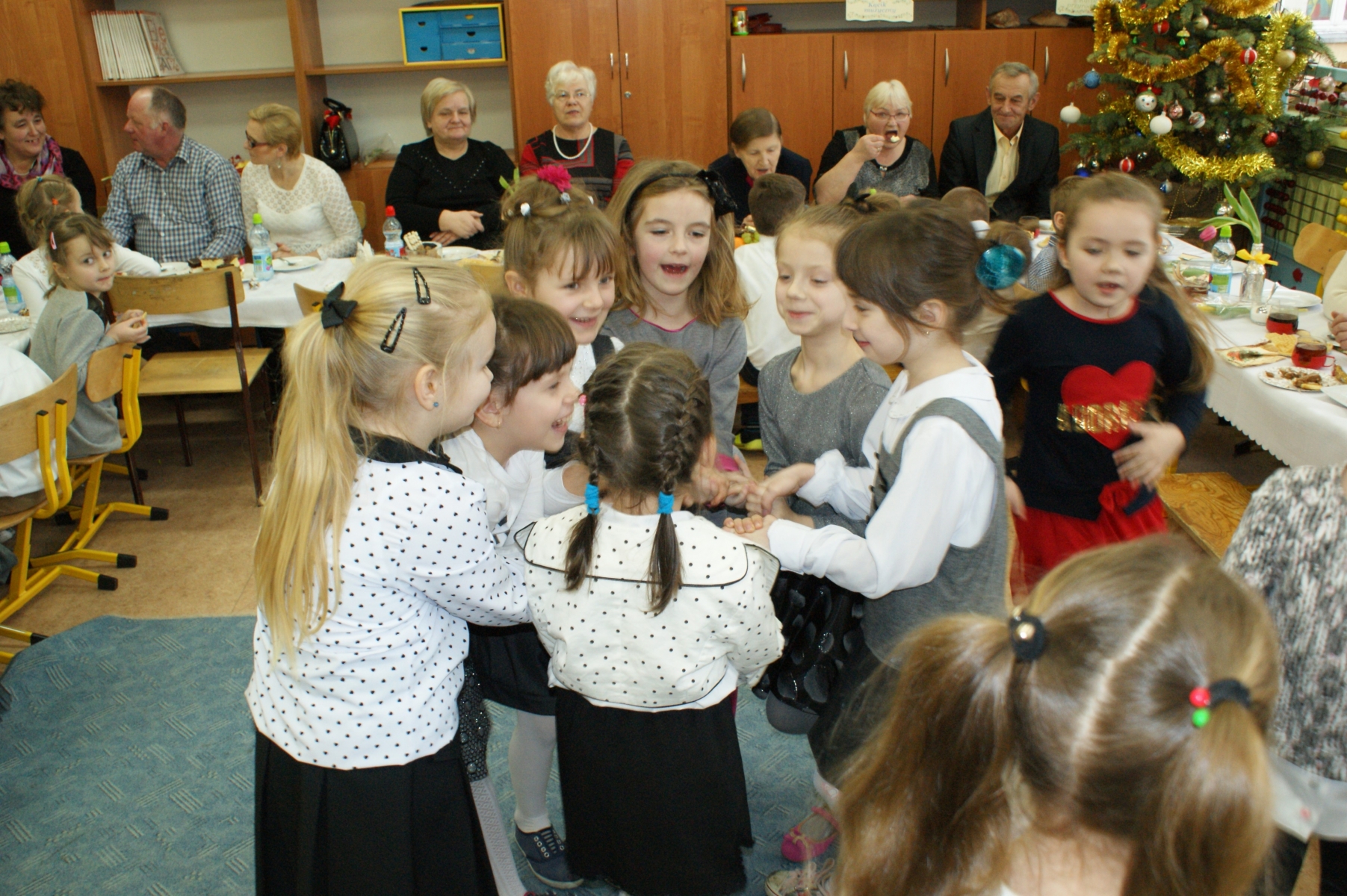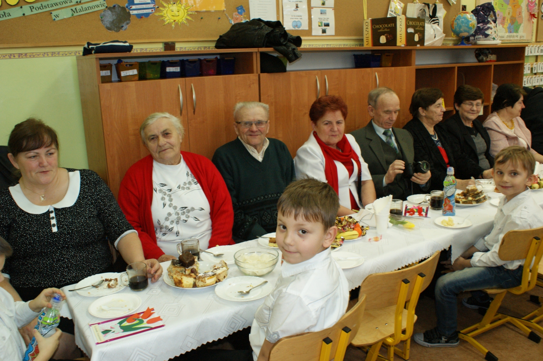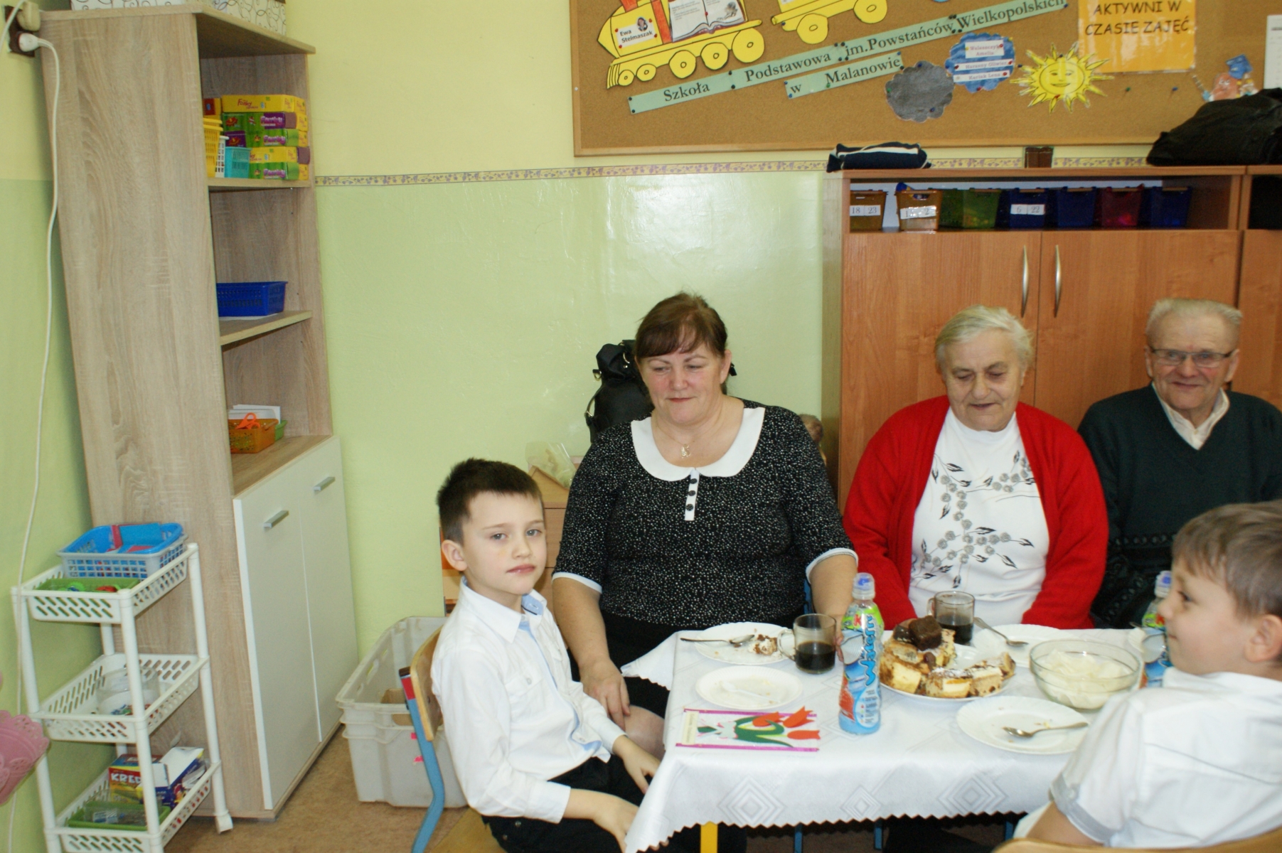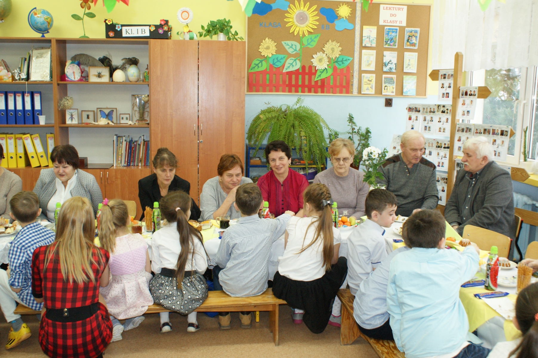 Po uroczystości na sali gimnastycznej goście zostali zaproszeni przez swoje wnuczęta do klas na słodki poczęstunek. Tam też zostali obdarowani kwiatami i laurkami, nie zabrakło też wspólnej zabawy.