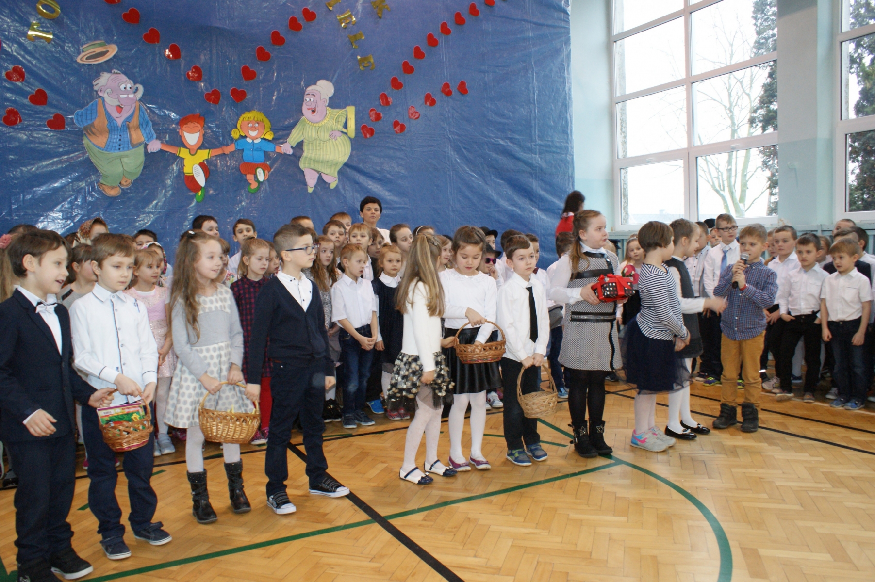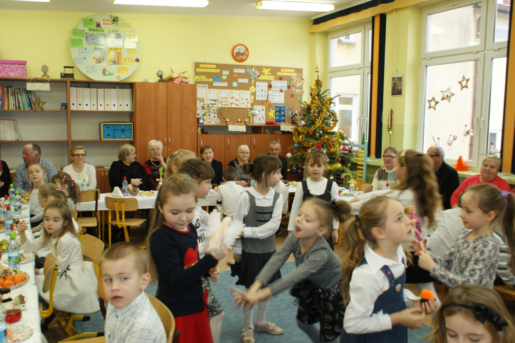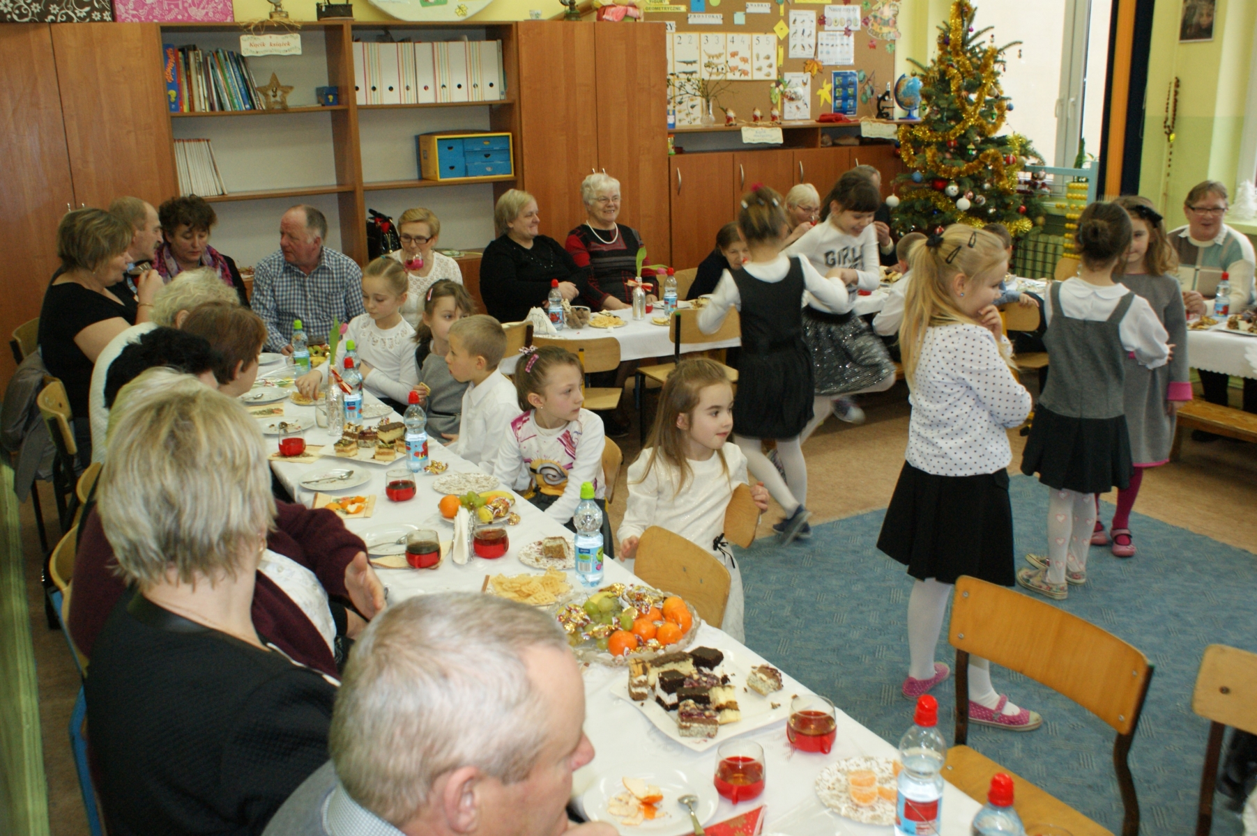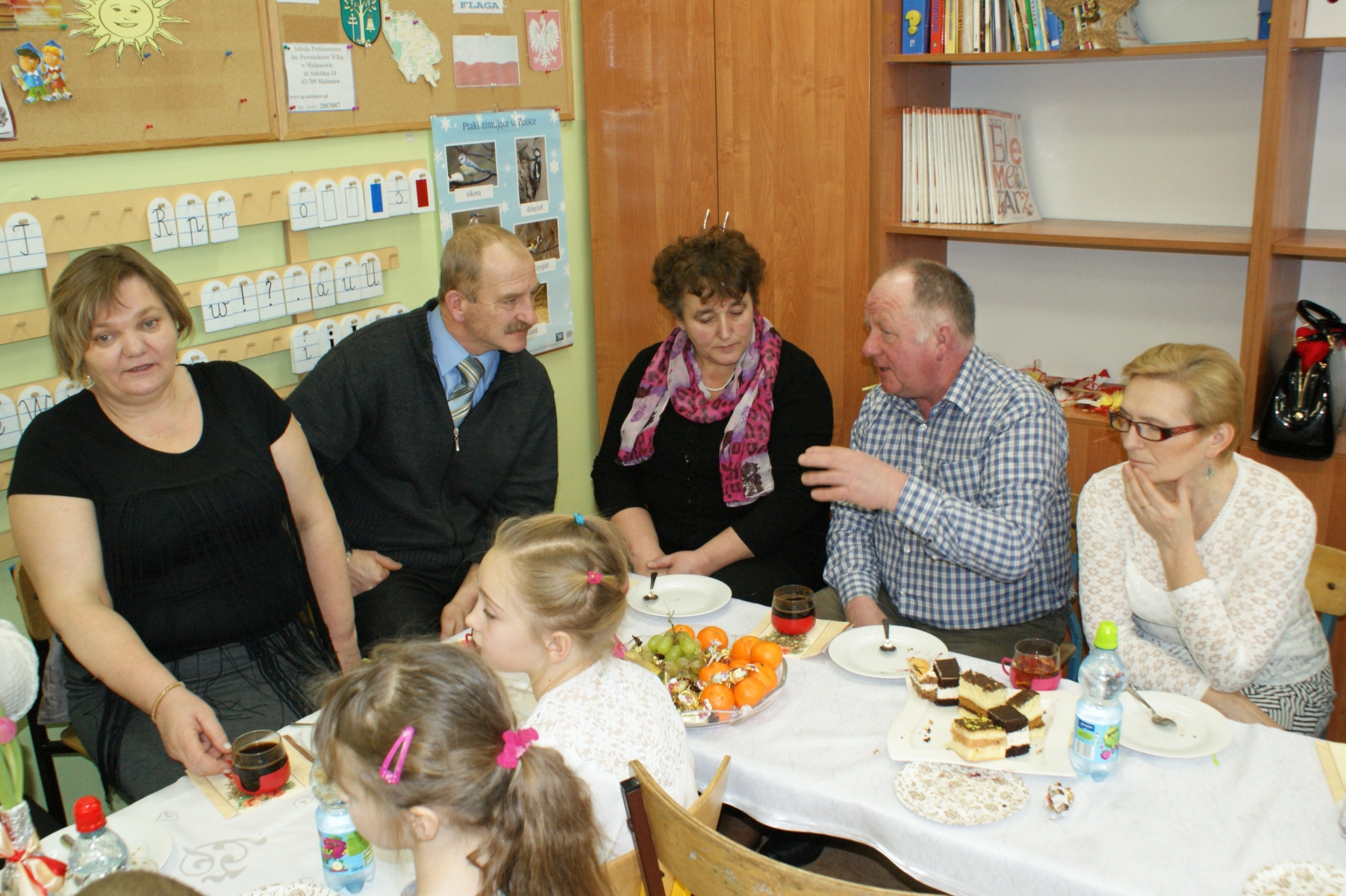 Po uroczystości na sali gimnastycznej goście zostali zaproszeni przez swoje wnuczęta do klas na słodki poczęstunek. Tam też zostali obdarowani kwiatami i laurkami, nie zabrakło też wspólnej zabawy.