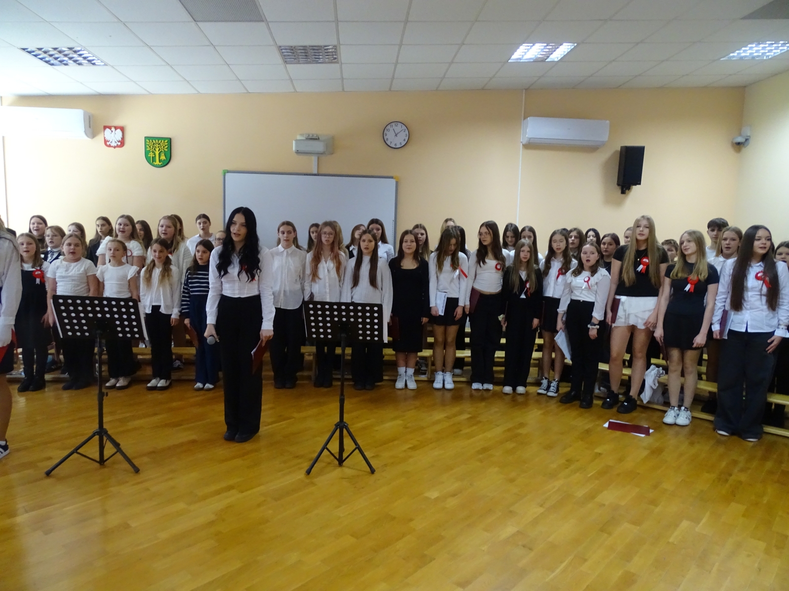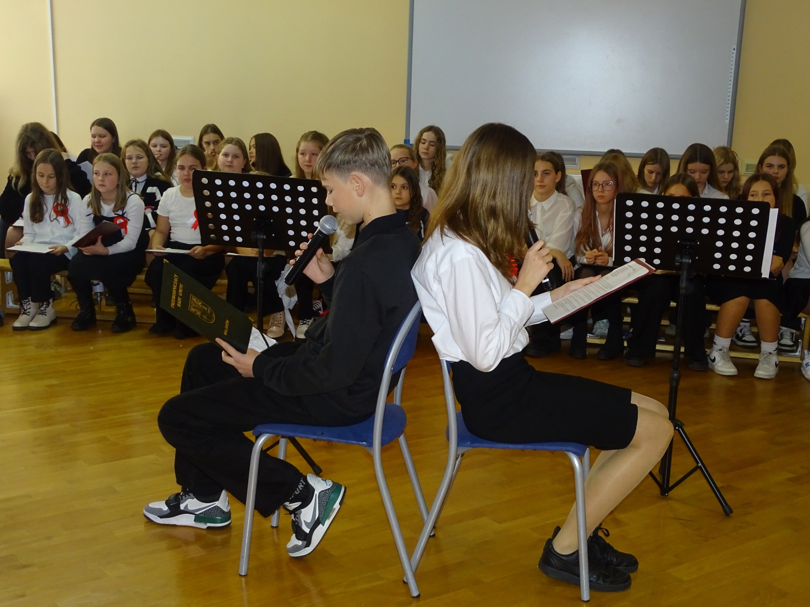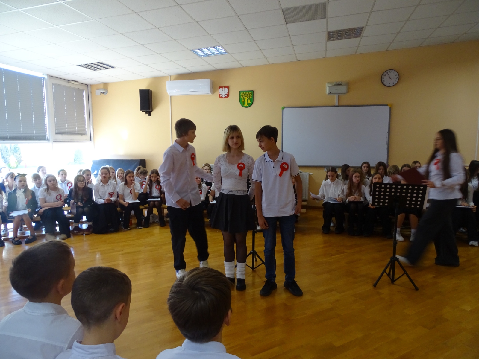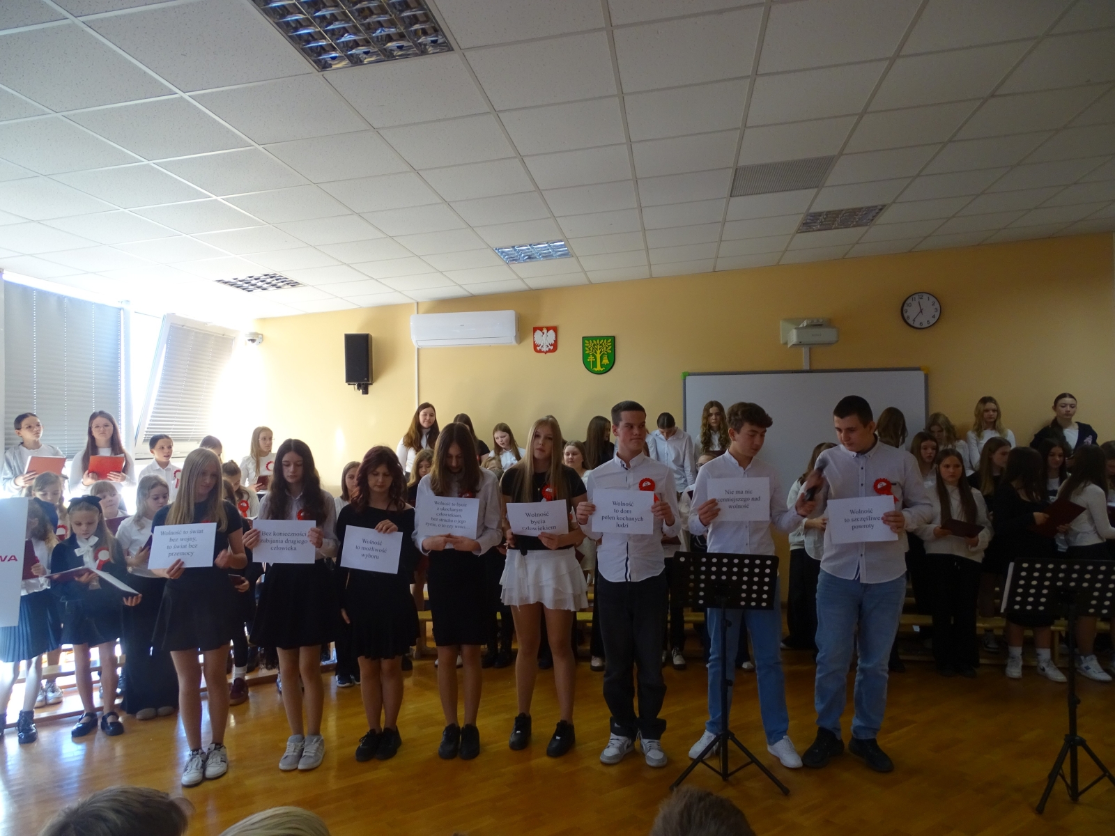 Uczniowie klasy VIIIB podczas uroczystego apelu przypomnieli okoliczności utraty wolności, życie pod zaborami i drogę Polski do odzyskania niepodległości. W swoim występie podkreślili, iż data 11 listopada to symbol walki o wolność, symbol wiary, miłości i symbol zwycięstwa. Pamiętajmy w tym dniu o tych, którzy przez ponad wiek nie porzucili wiary w odzyskanie wolności Polski.
