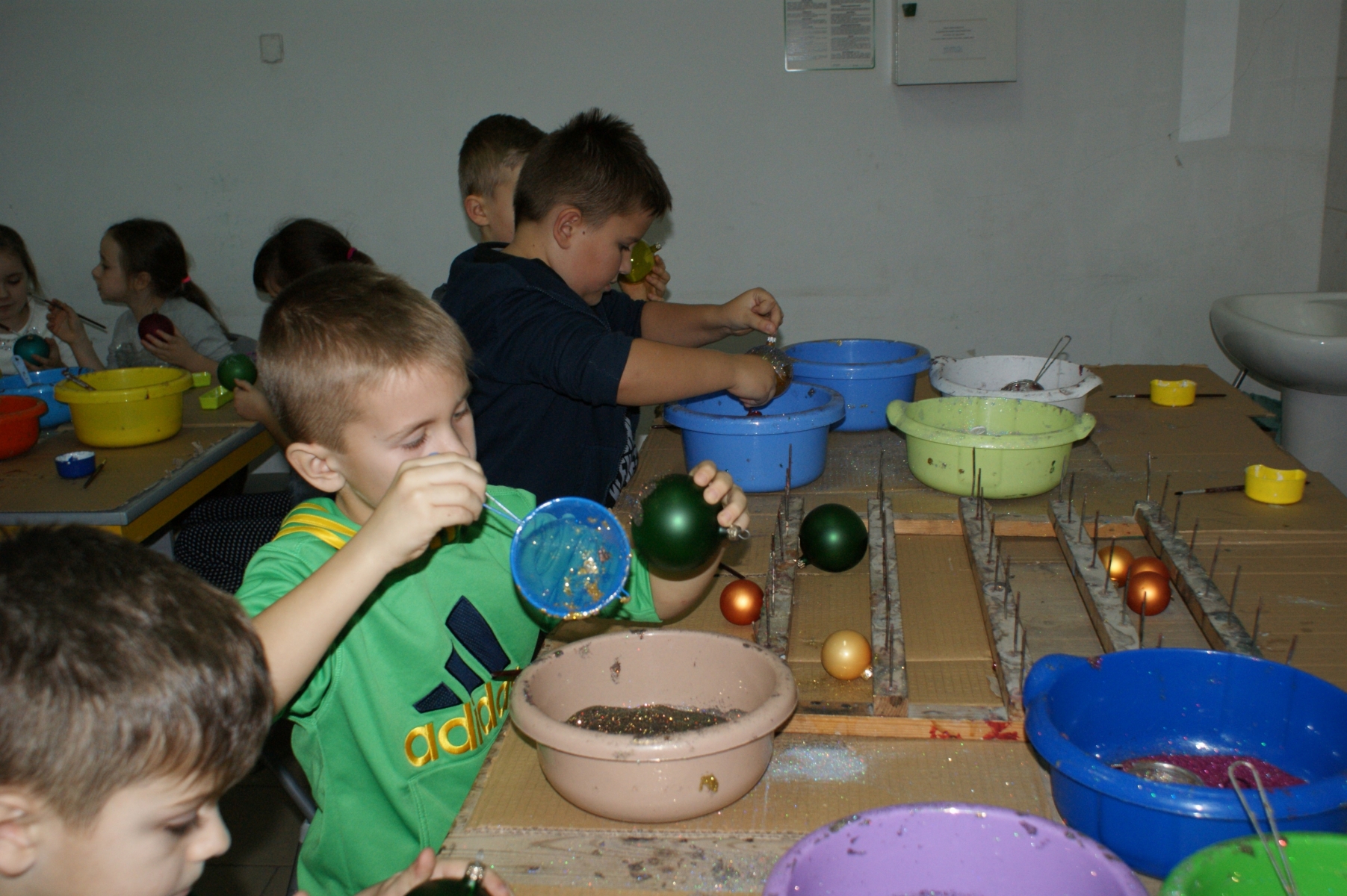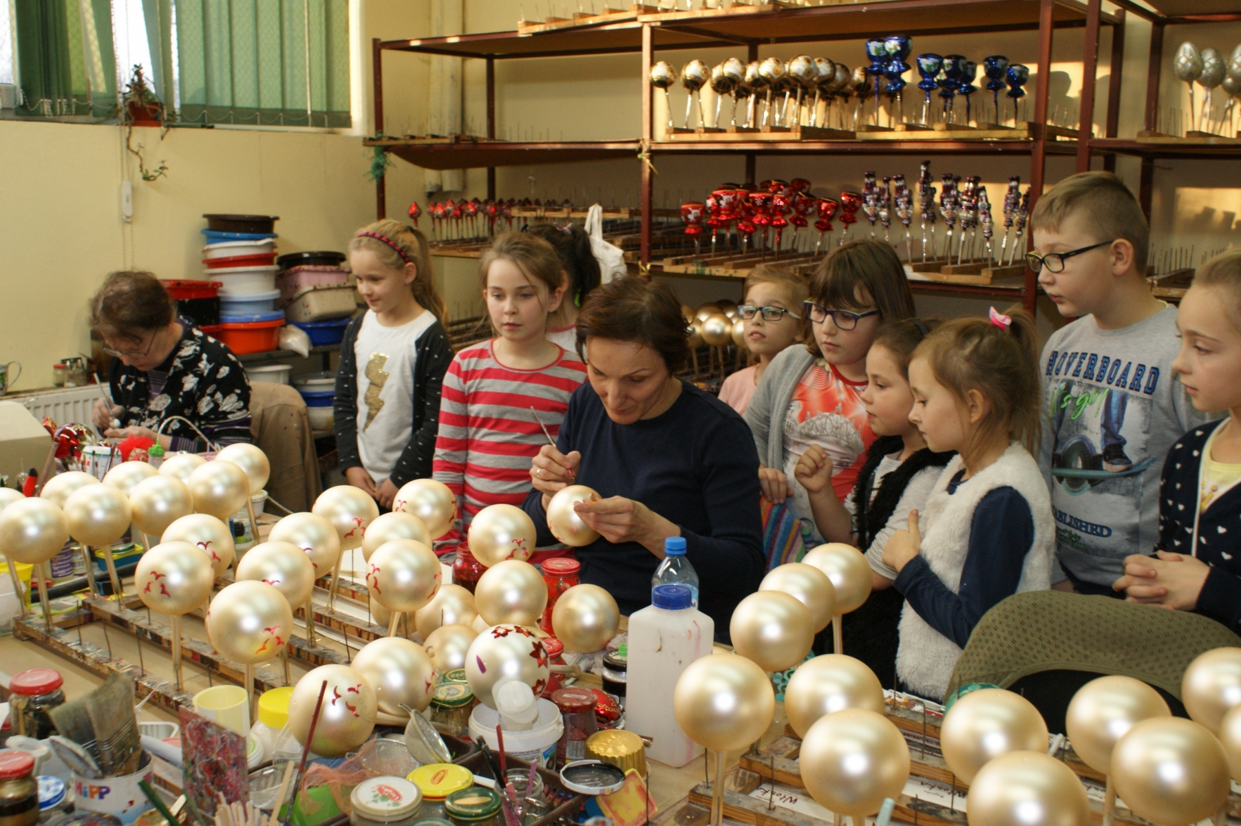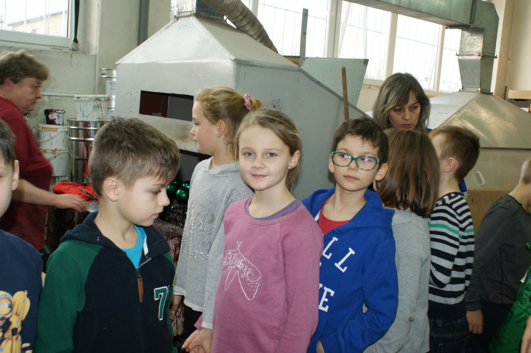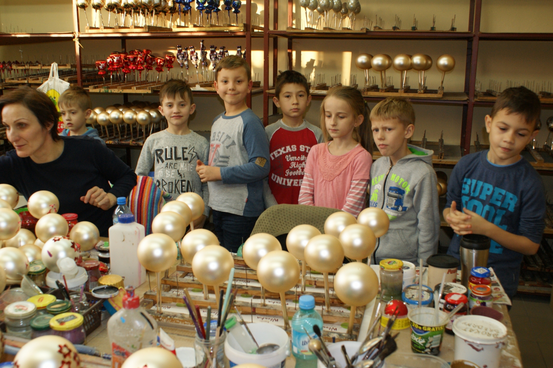 Ten mały zakład zrobił na nas ogromne wrażenie. Poznaliśmy tajniki tworzenia tych pięknych ozdób, które co roku sprawiają, że nasze choinki urzekająco lśnią i błyszczą. Z zapartym tchem śledziliśmy kolejne etapy powstawania bajecznie kolorowych bombek: dmuchanie szkła, srebrzenie, lakierownie, zdobienie. Sami także dostaliśmy po dwie „szklane bombki”, które mogliśmy ozdobić według własnego pomysłu. Każdy z nas starał się wyczarować najróżniejsze wzory, aby jego bombka prezentowała się okazale i wspaniale. Nasze bombki mieniły się różnymi kolorami tęczy. Zabraliśmy je do domów by zdobiły nasze „drzewka” podczas świąt.