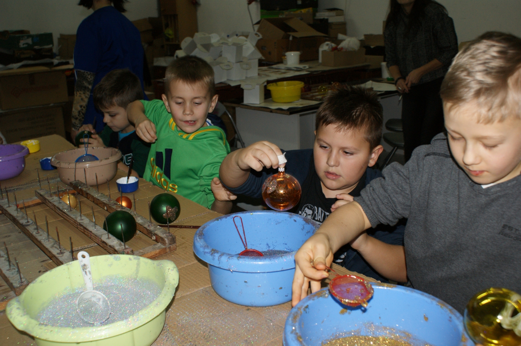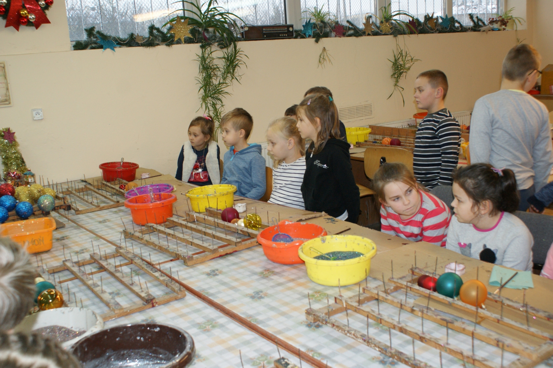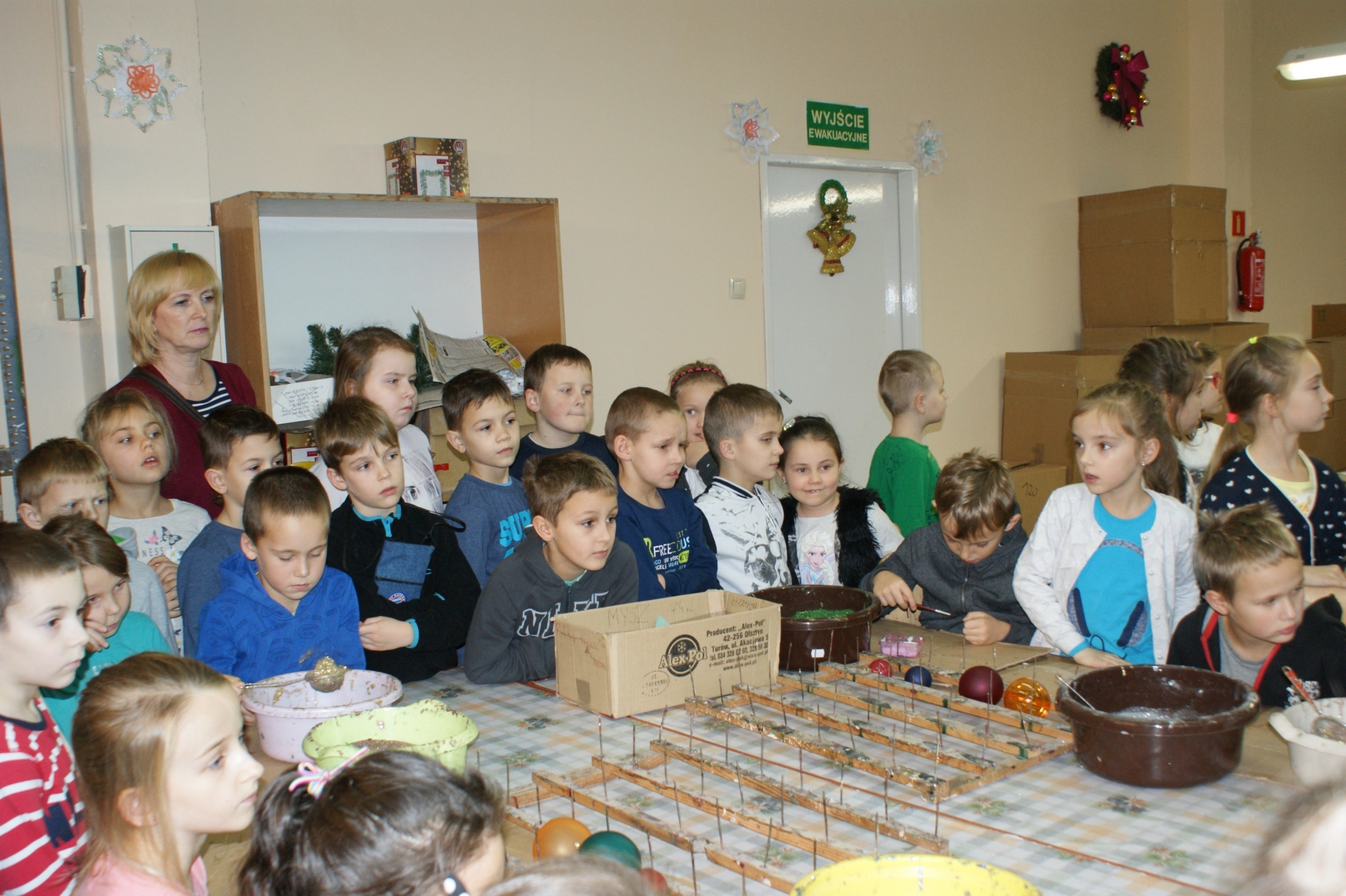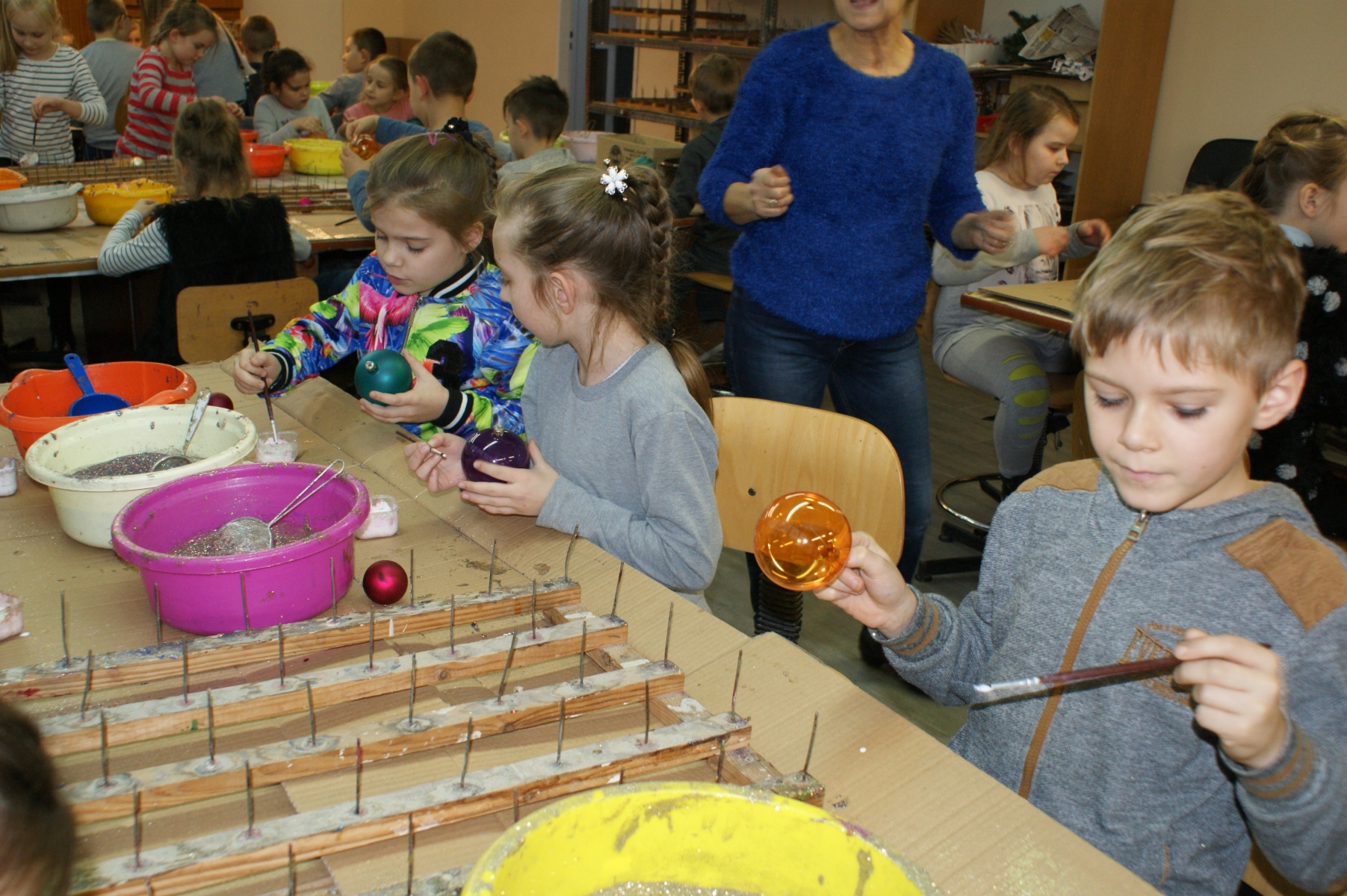 Ten mały zakład zrobił na nas ogromne wrażenie. Poznaliśmy tajniki tworzenia tych pięknych ozdób, które co roku sprawiają, że nasze choinki urzekająco lśnią i błyszczą. Z zapartym tchem śledziliśmy kolejne etapy powstawania bajecznie kolorowych bombek: dmuchanie szkła, srebrzenie, lakierownie, zdobienie. Sami także dostaliśmy po dwie „szklane bombki”, które mogliśmy ozdobić według własnego pomysłu. Każdy z nas starał się wyczarować najróżniejsze wzory, aby jego bombka prezentowała się okazale i wspaniale. Nasze bombki mieniły się różnymi kolorami tęczy. Zabraliśmy je do domów by zdobiły nasze „drzewka” podczas świąt.