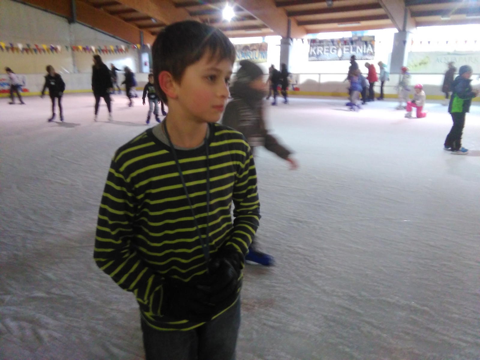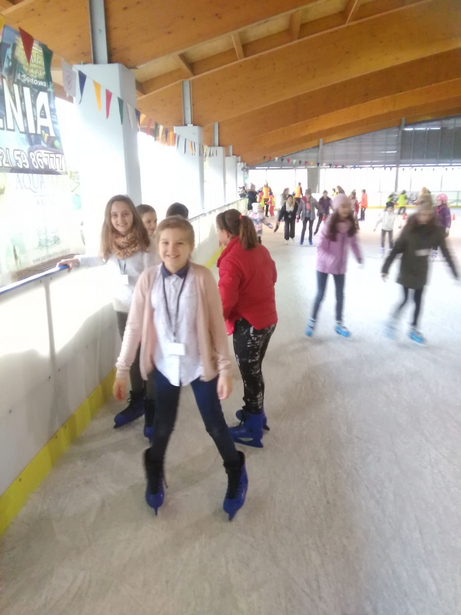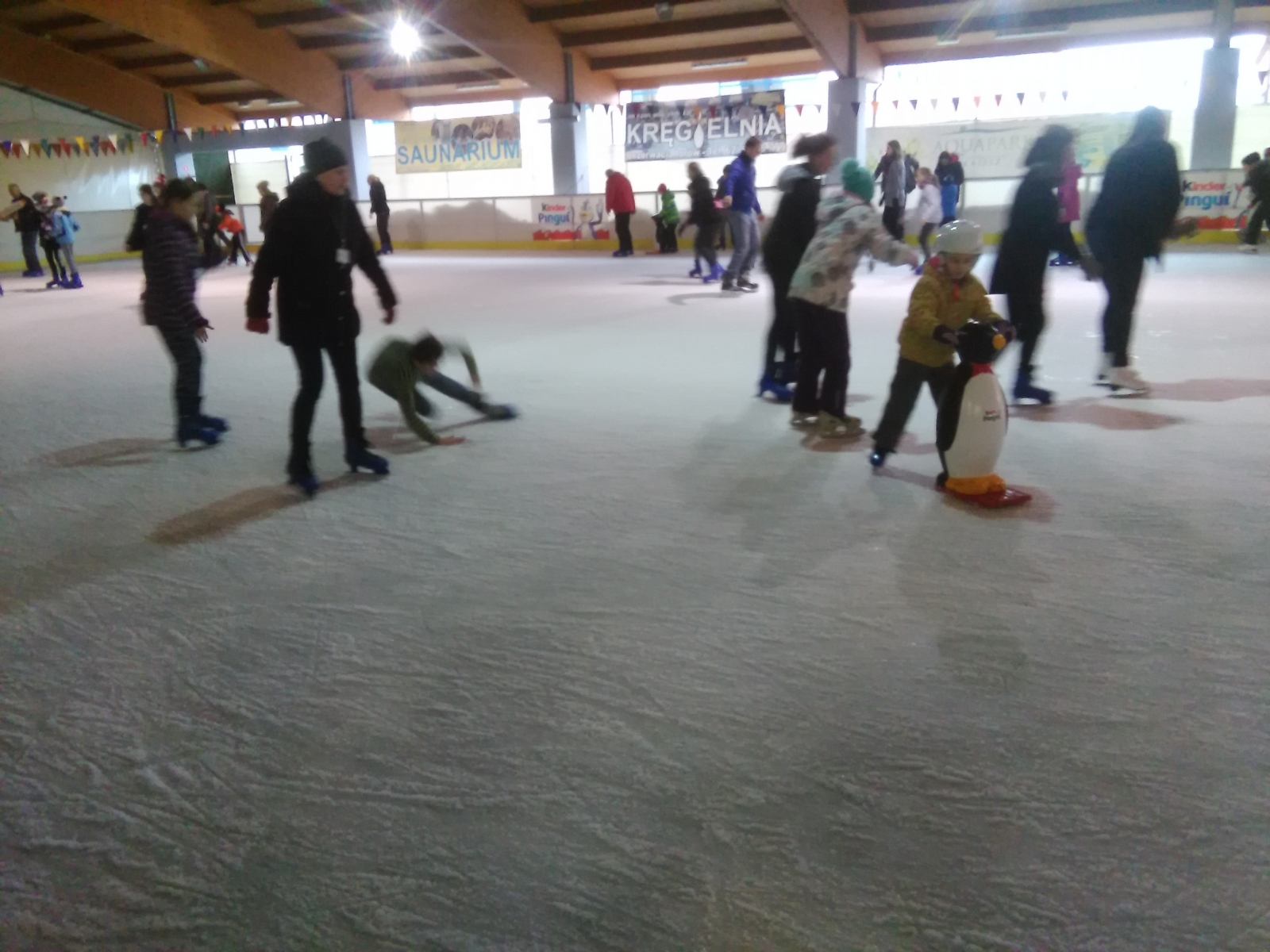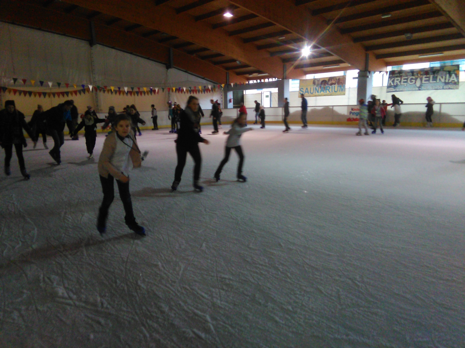 W czwartek 28 stycznia grupa uczniów wraz z opiekunami udała się na lodowisko w Kaliszu. Młodzi adepci zimowego szaleństwa podczas dwóch godzin na lodowisku poznali atrakcję łyżew. Uczniowie zaawansowani rozwijali swoje umiejętności jazdy na lodzie, natomiast początkujący poznali technikę utrzymania się na lodzie, odpychania oraz "miękkiego lądowania". Wszystkie potknięcia, niekontrolowane obroty przyśpieszenia, oraz próby szaleństwa były szybko weryfikowane przez śliskie podłoże. Wszystkim upadkom towarzyszył śmiech i zabawa. Jazda na łyżwach była świetną formą aktywnego odpoczynku w ferie zimowe.