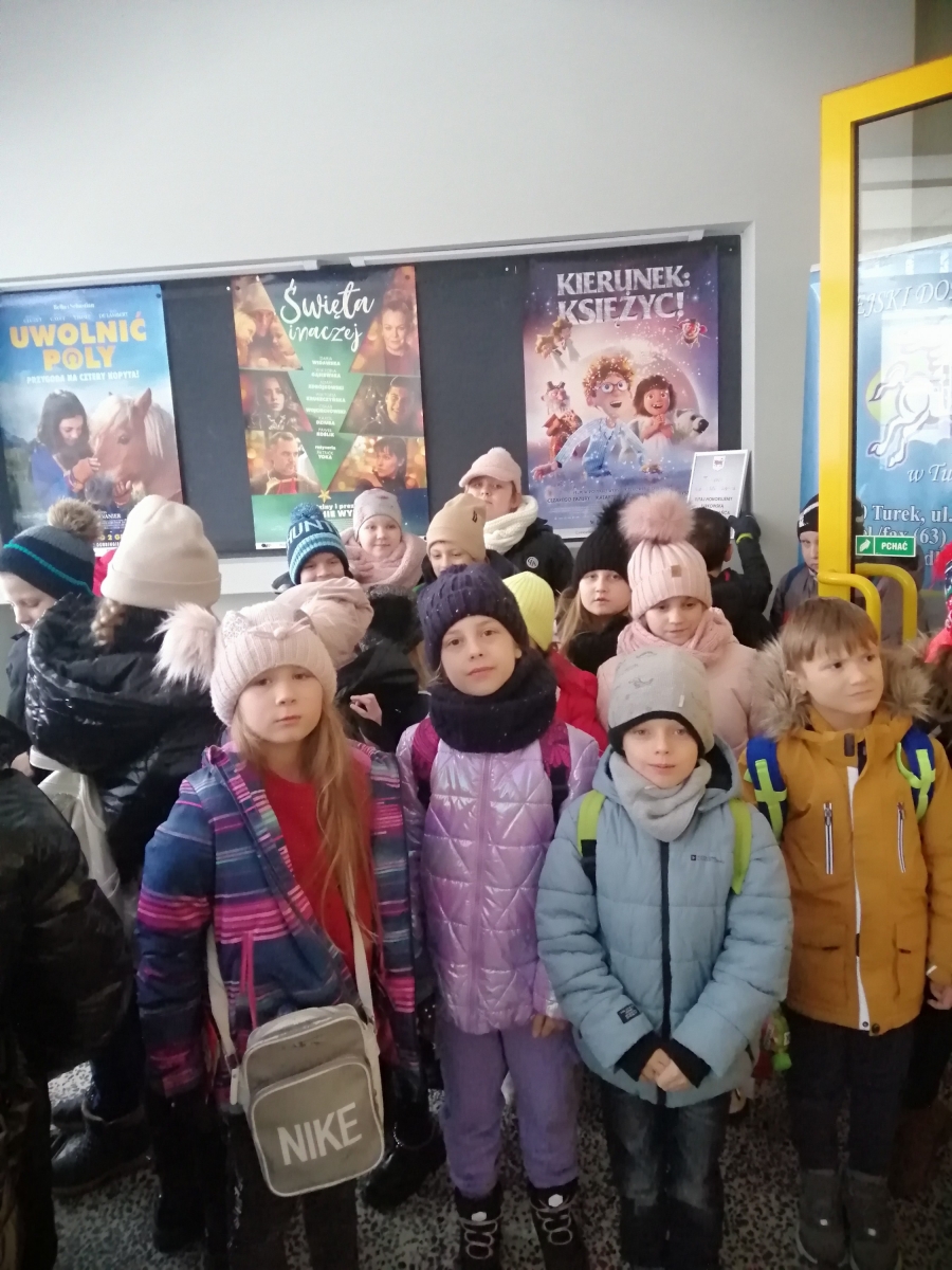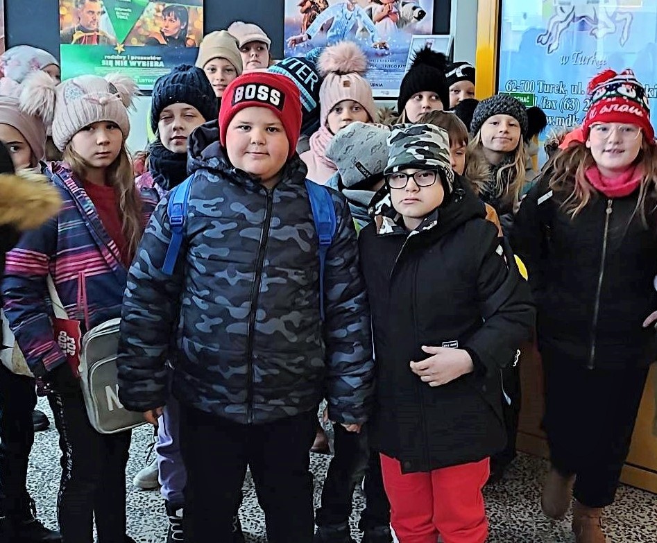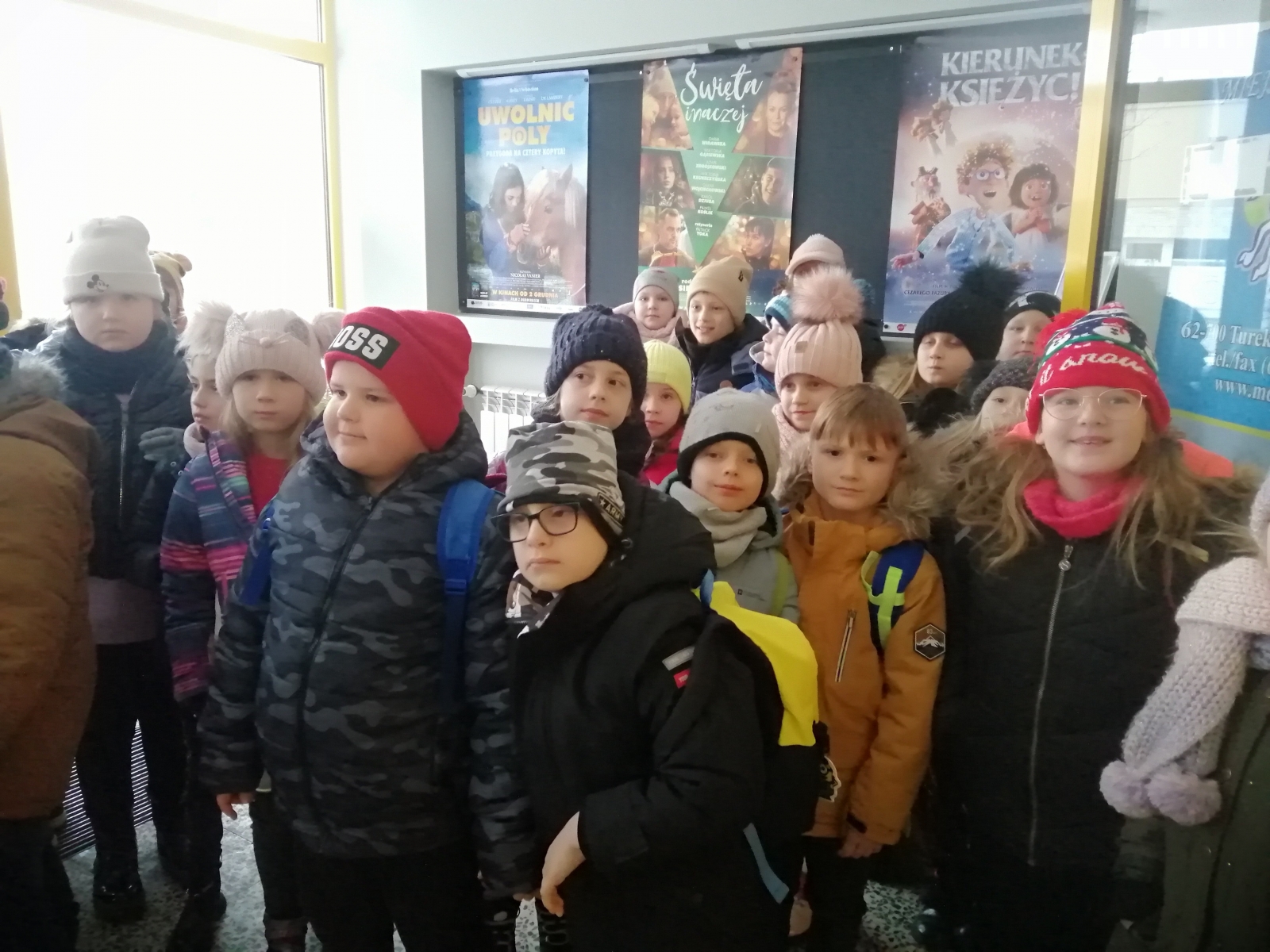 W ten mroźny piątkowy poranek wszyscy uczniowie klas I-III wspólnie z panem Wójtem Ireneuszem Augustyniakiem- Mikołajem i pracownikami Urzędu Gminy- Śnieżynkami zrobili najpierw pamiątkowe zdjęcie obok choinki, a następnie ruszyli do kina. Na drogę dzieciaki otrzymały także słodki upominek. Fabuła filmu wpisuje się w magiczny, świąteczny czas. Nawiązuje do idei dzielenie się tym co mamy z potrzebującymi. Uczy przyjaźni, szacunku i dobroci. Bohater filmu młody, nastoletni Karl wzorem swojego idola Robin Hooda – bohatera średniowiecznych angielskich legend ludowych, uwalnia bogatych od niechcianych prezentów, a obdarowuje nimi potrzebujących. Historia kończy się szczęśliwie, Karl za swoje zachowanie zdobywa uznanie, podziw oraz to na czym zależało mu najbardziej, przyjaźń. Uczniowie zadowoleni i szczęśliwi, wrócili do szkoły.