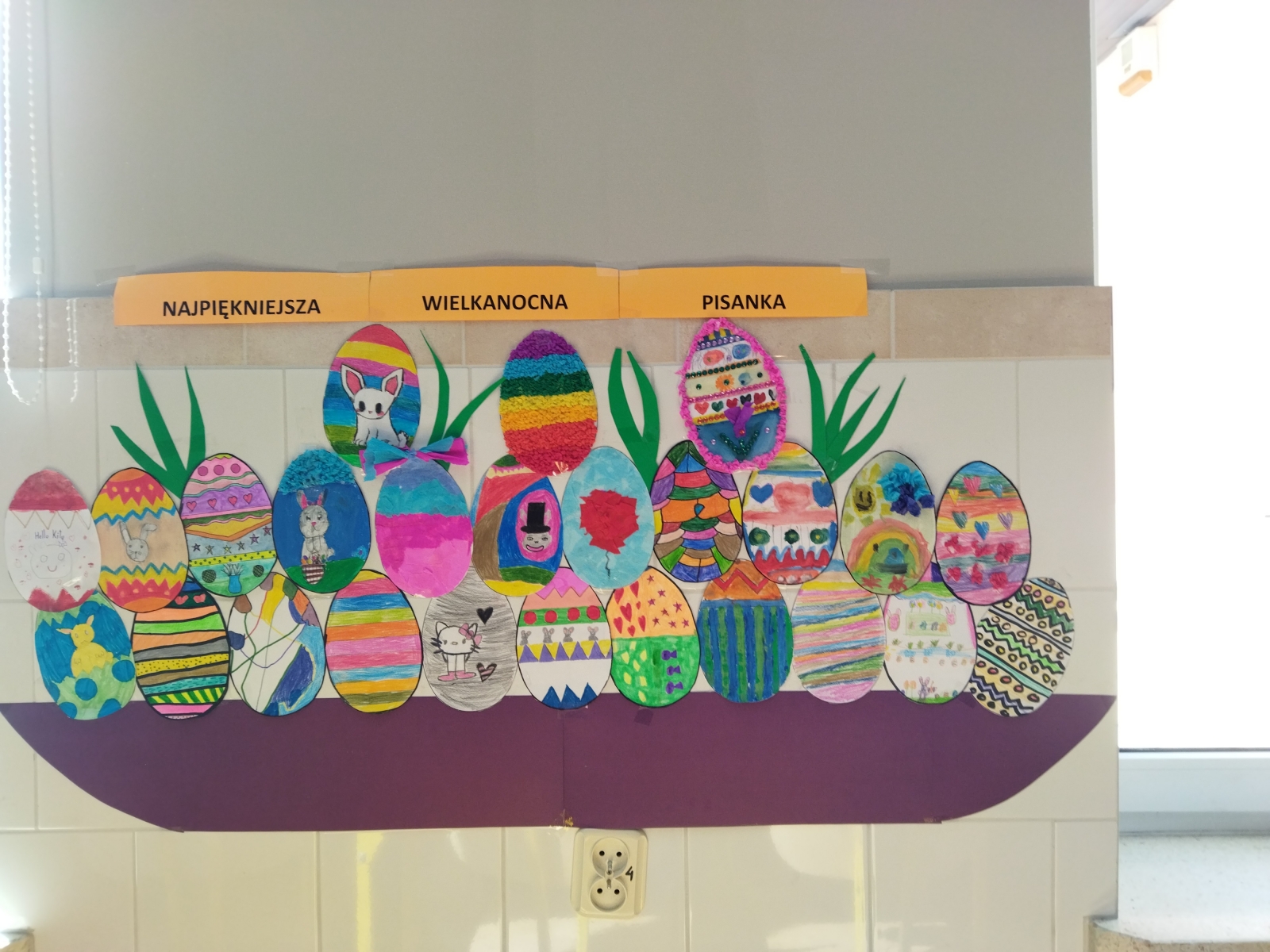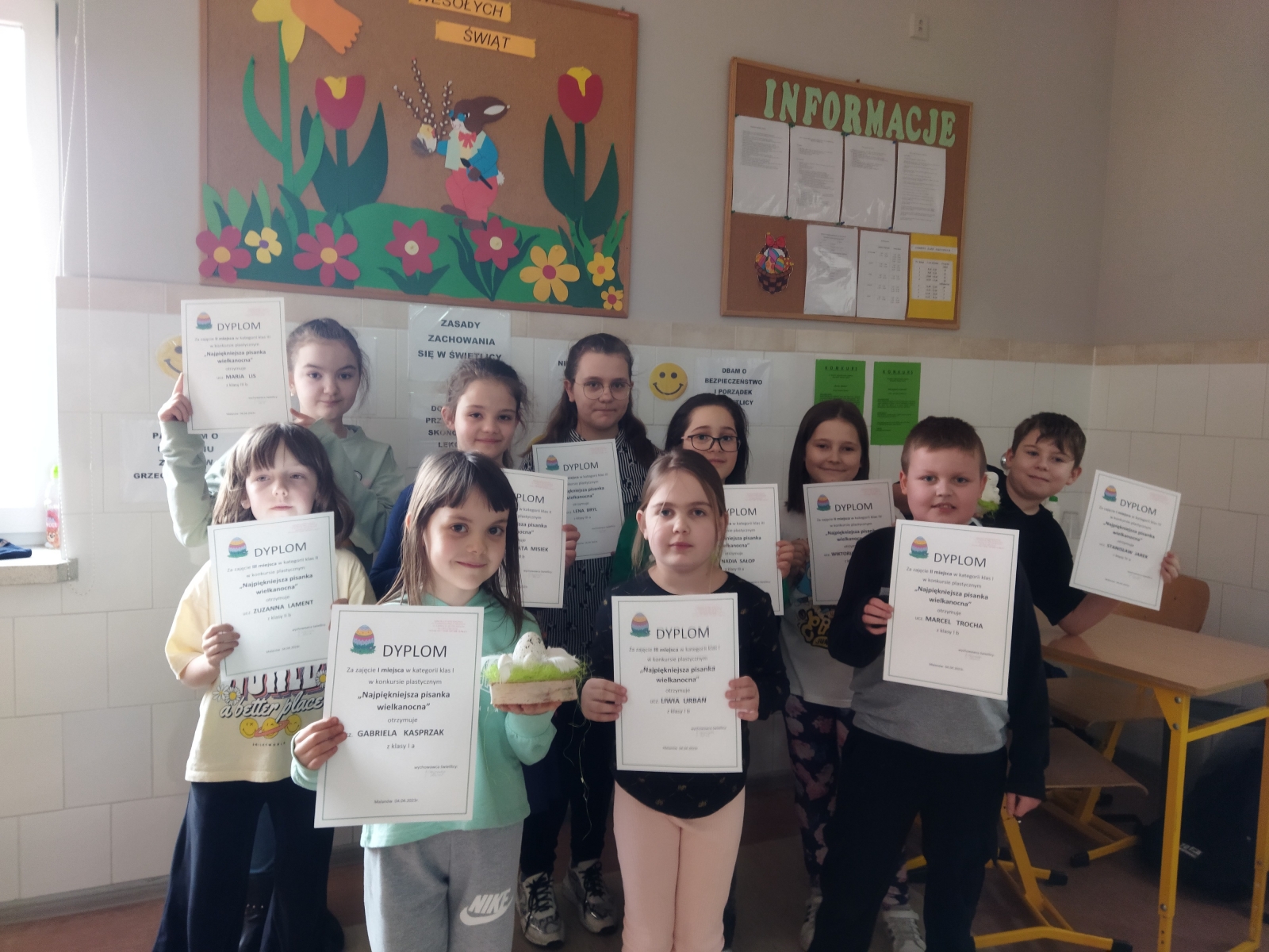 W dniach 27 – 31 marca 2023r. przeprowadzono w świetlicy szkolnej konkurs plastyczny pod hasłem „Najpiękniejsza pisanka wielkanocna”. Chętne dzieci otrzymały kontur jajka, który musiały samodzielnie udekorować. Do konkursu przystąpiło 25 uczniów z klas I – IV. W poniedziałek -3 kwietnia 2023r. nastąpiło podsumowanie. Prace były oceniane w ramach poszczególnych kategorii wiekowych. Przy wyborze pisanek kierowano się pomysłowością i starannością wykonania pracy. Natomiast we wtorek 4 kwietnia 2023r. wyniki konkursu zostały przedstawione jego uczestnikom. Uczniowie za zajęcie I,II, III miejsca otrzymali pamiątkowe dyplomy a dodatkowo laureaci I miejsc nagrody rzeczowe w postaci świątecznych stroików. A tak prezentuje się lista zwycięzców: