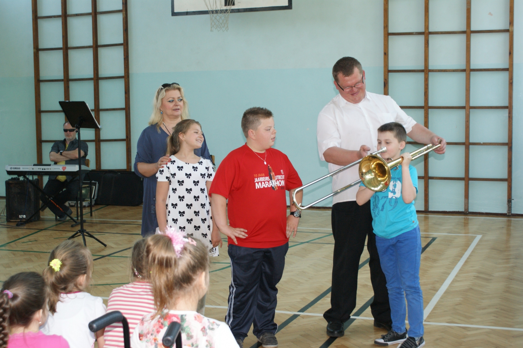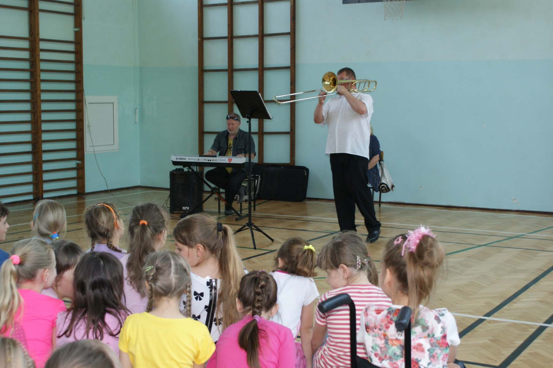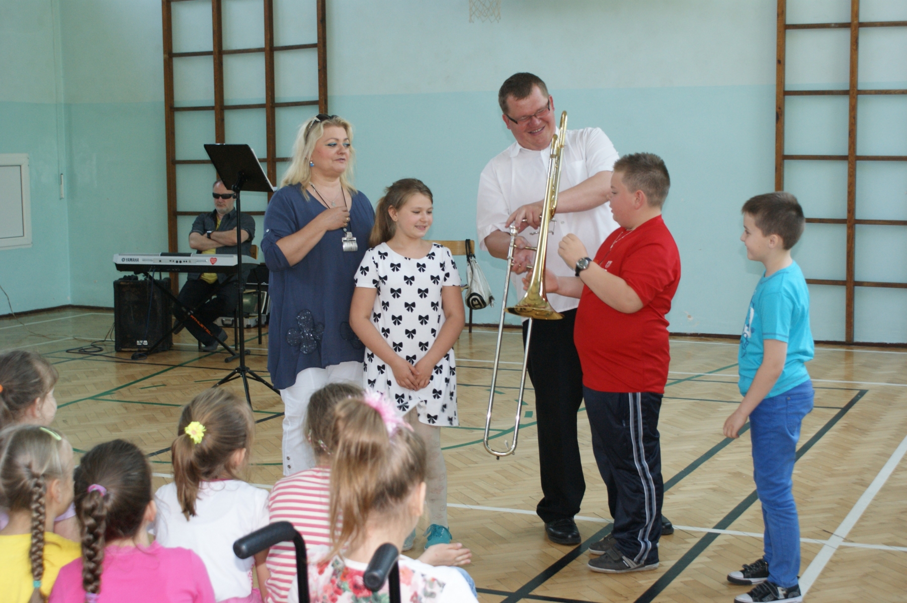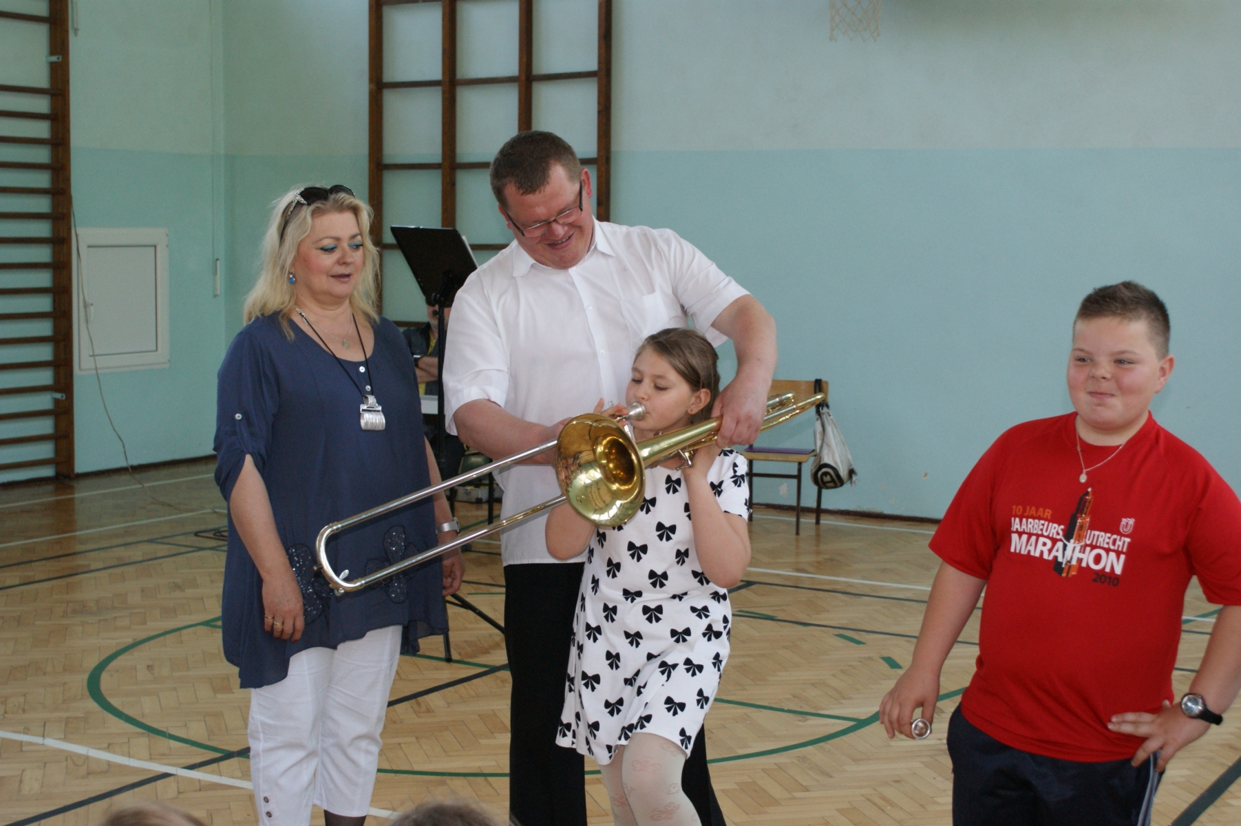 Pan Marcin zapoznał dzieci ze swoim instrumentem, przypomniał że puzon jest zaliczany do grupy instrumentów dętych blaszanych. Ale różni się pod względem budowy od innych instrumentów dętych blaszanych. Zamiast wentyli ma suwak, którym zmienia się wysokość dźwięku. Zbudowany jest z dwóch długich metalowych rurek w kształcie litery U, które połączone są ze sobą, tworząc literę S. Jedna z nich zakończona jest kociołkowatym ustnikiem, a druga czarą głosową. Poprzez wsuwanie i wysuwanie suwaka można zmieniać wysokość dźwięku. Pierwszym kompozytorem, który wykorzystał puzon w symfonii był Ludwig van Beethoven. W orkiestrze symfonicznej grają zwykle 3 puzony. Wykorzystywany jest także w orkiestrach dętych i wojskowych.