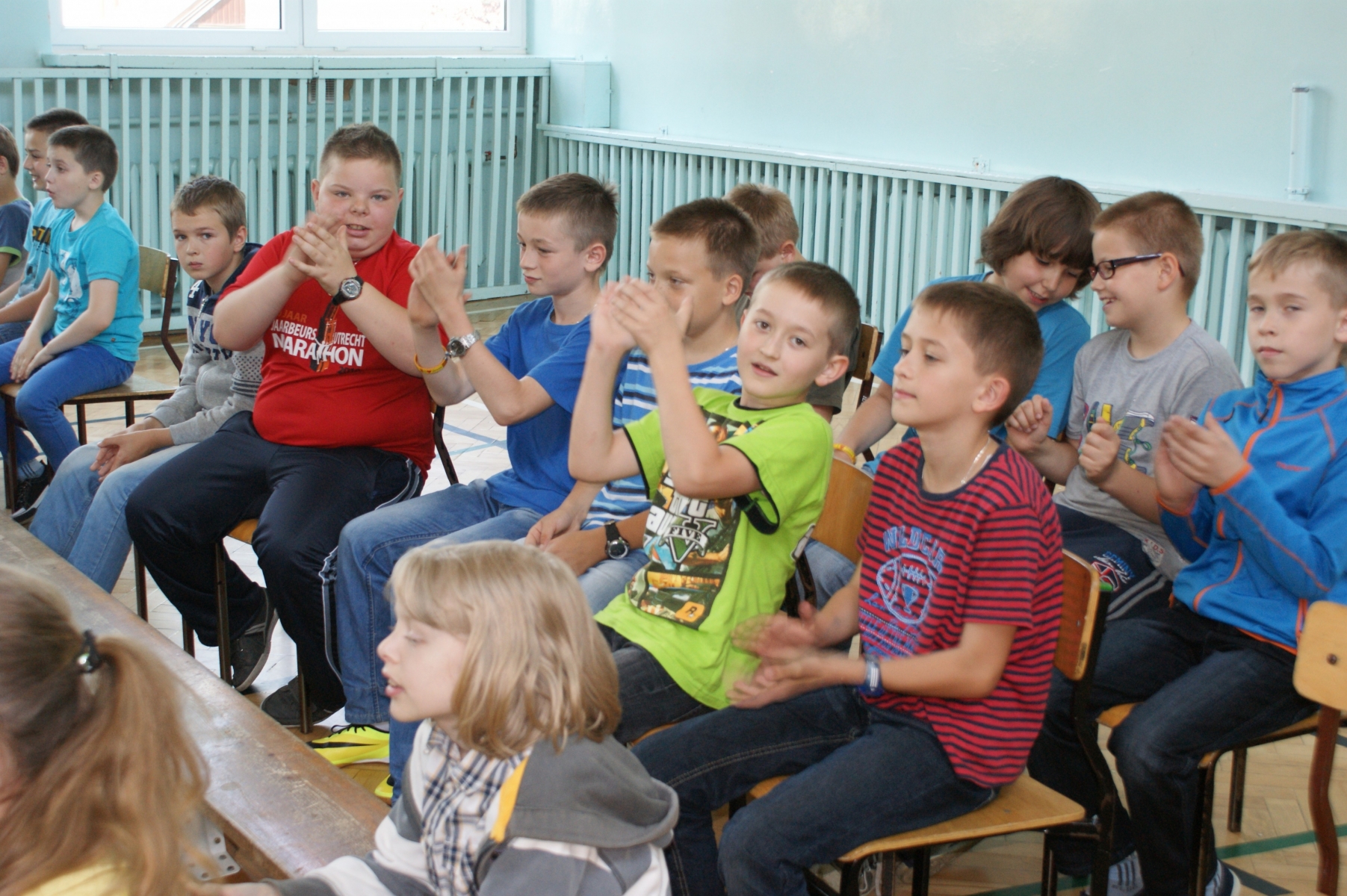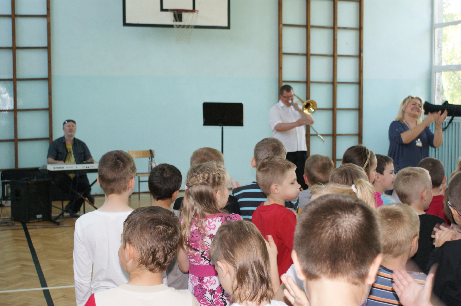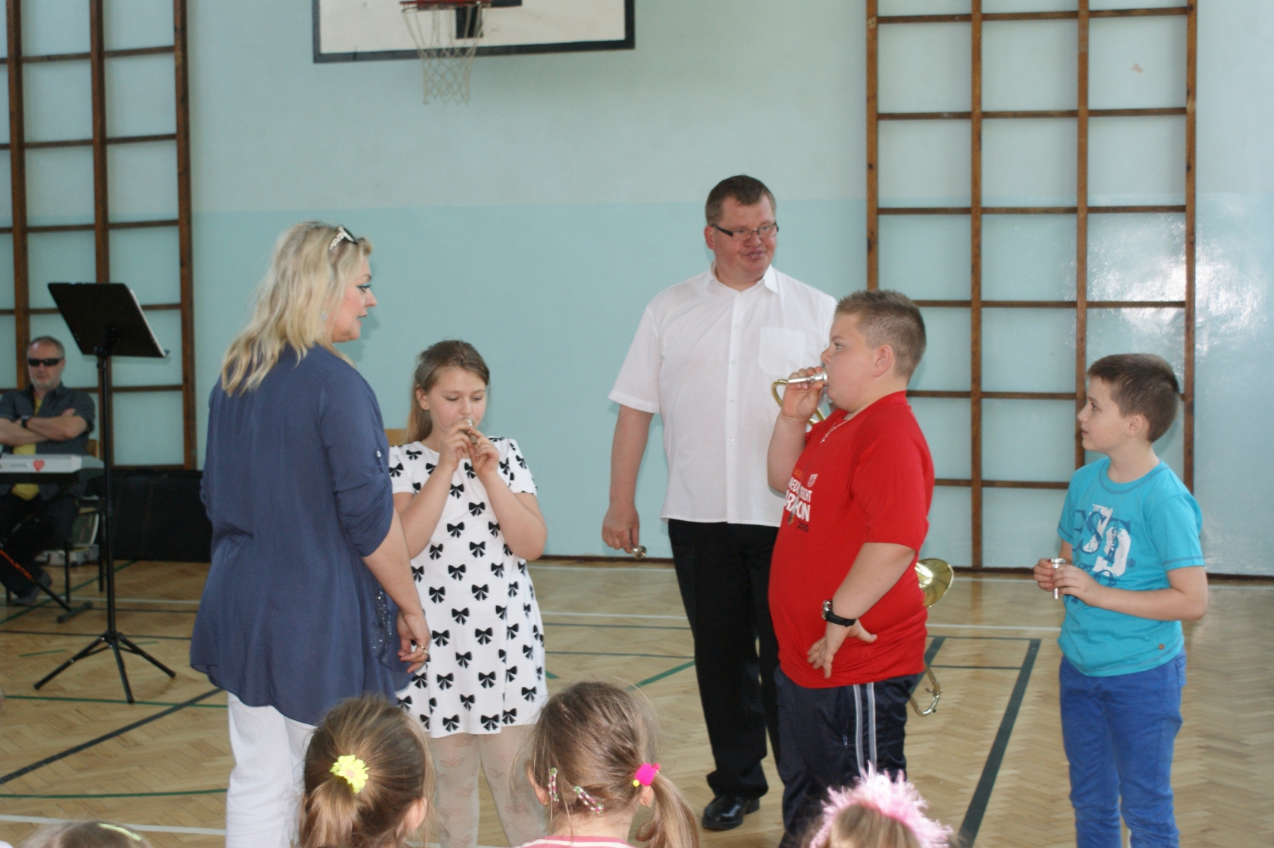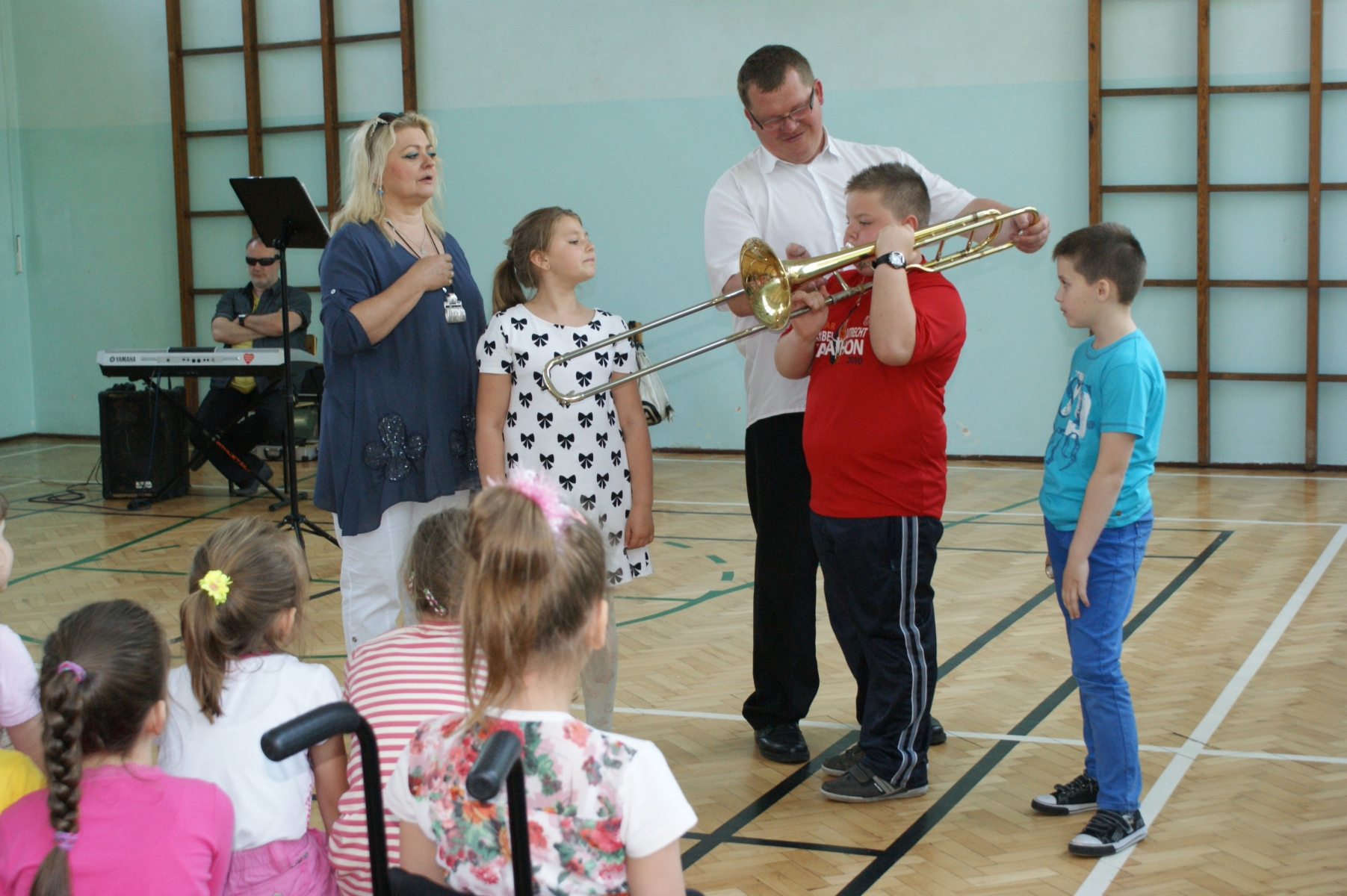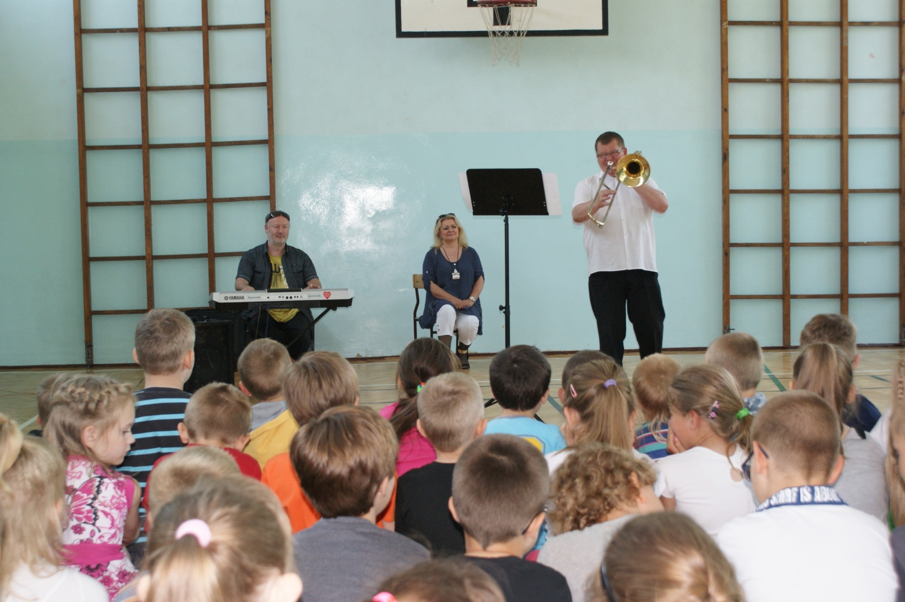 Pan Marcin zapoznał dzieci ze swoim instrumentem, przypomniał że puzon jest zaliczany do grupy instrumentów dętych blaszanych. Ale różni się pod względem budowy od innych instrumentów dętych blaszanych. Zamiast wentyli ma suwak, którym zmienia się wysokość dźwięku. Zbudowany jest z dwóch długich metalowych rurek w kształcie litery U, które połączone są ze sobą, tworząc literę S. Jedna z nich zakończona jest kociołkowatym ustnikiem, a druga czarą głosową. Poprzez wsuwanie i wysuwanie suwaka można zmieniać wysokość dźwięku. Pierwszym kompozytorem, który wykorzystał puzon w symfonii był Ludwig van Beethoven. W orkiestrze symfonicznej grają zwykle 3 puzony. Wykorzystywany jest także w orkiestrach dętych i wojskowych.