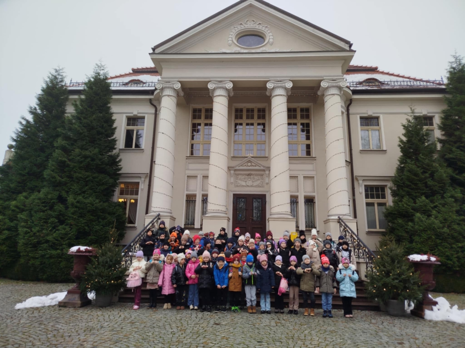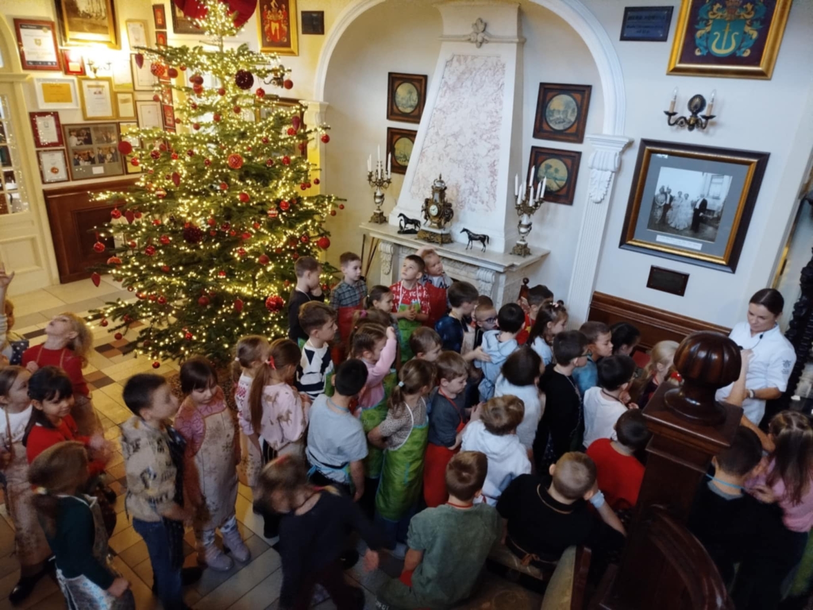 Na początku dzieci dowiedziały się, jaka jest historia wypieku pierników. Poznały recepturę tradycyjnych wypieków – wąchały różne przyprawy i uczyły się ich nazw. Pod czujnym okiem kucharzy mali „piernikarze” wyrabiali ciasto, formowali je oraz wycinali z niego różnorodne kształty. Gdy pierniki były już ułożone na tacach, uczniowie zwiedzili kuchnię, w której wypieki trafiły do pieca. Podczas pieczenia ciastek dzieci zwiedzały przepiękny pałac. Podziwiały pałacowe sale i z zaciekawieniem słuchały opowieści o szlacheckiej rodzinie Zofii i Ignacego Chrystowskich – dawnych właścicielach pałacu. Uwagę uczniów przyciągały wyjątkowe wnętrza, obrazy, lampy, dawna broń, poroża oraz niepowtarzalne antyki. Wszyscy czuli się jak w bajkowej rezydencji. Gdy pierniki były już upieczone, rozpoczęła się najbardziej wyczekiwana przez dzieci część – dekorowanie lukrem i kolorowymi posypkami. Powstały ciekawe i pomysłowe wzory, a udekorowane pierniki dzieci zabrały do domu. Spotkanie zakończyło się pamiątkowym zdjęciem w świątecznej scenerii pałacu. Każdy uczestnik otrzymał pamiątkowy dyplom. Były to wyjątkowe warsztaty, które z pewnością na długo pozostaną w pamięci dzieci. Organizatorkami wycieczki były wychowawczynie klas pierwszych: Emilia Andrzejczak, Joanna Nowakowska i Agnieszka Dewicka–Misiek. Opiekę nad dziećmi sprawowała również p. Karolina Gałężewska.