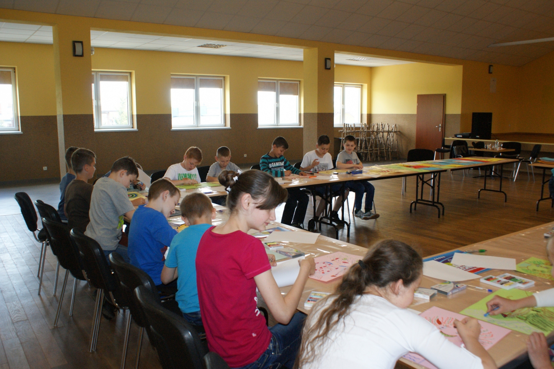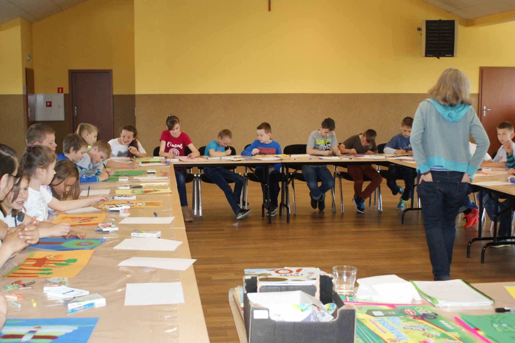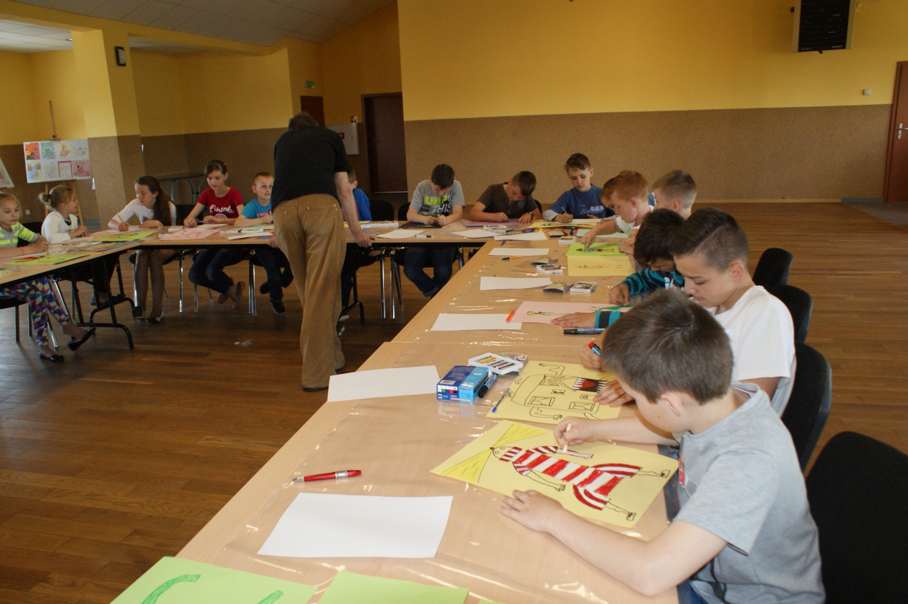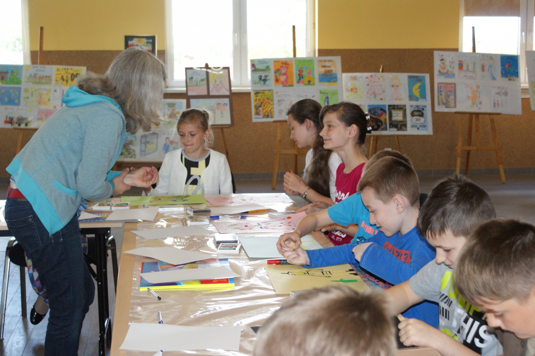 Na zakończenie warsztatów uczniowie zostali podzieleni na grupy i malowali bibliotekę marzeń. Pomysłów nie brakowało. Uczniowie zainspirowani przez instruktorów warsztatów „puścili wodzę fantazji”, dzięki czemu powstały bardzo interesujące prace.