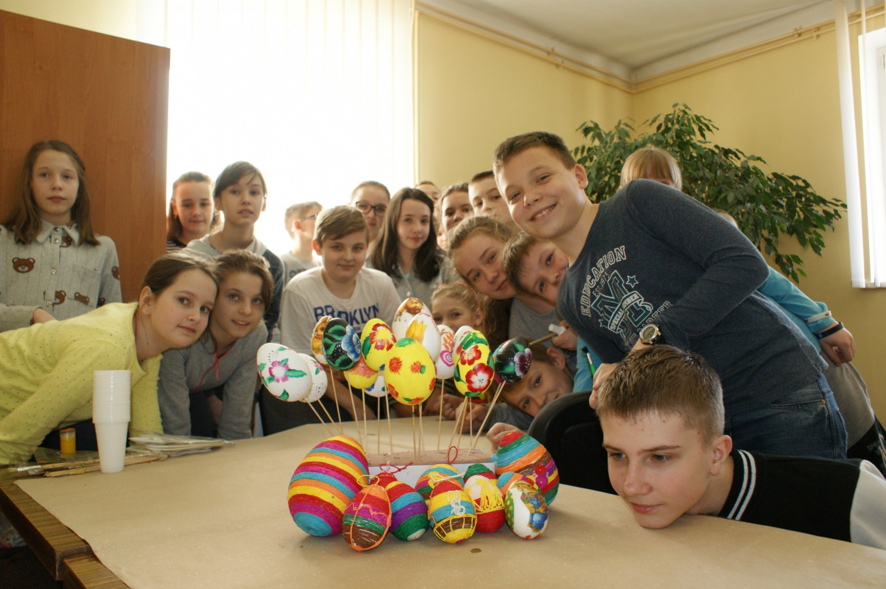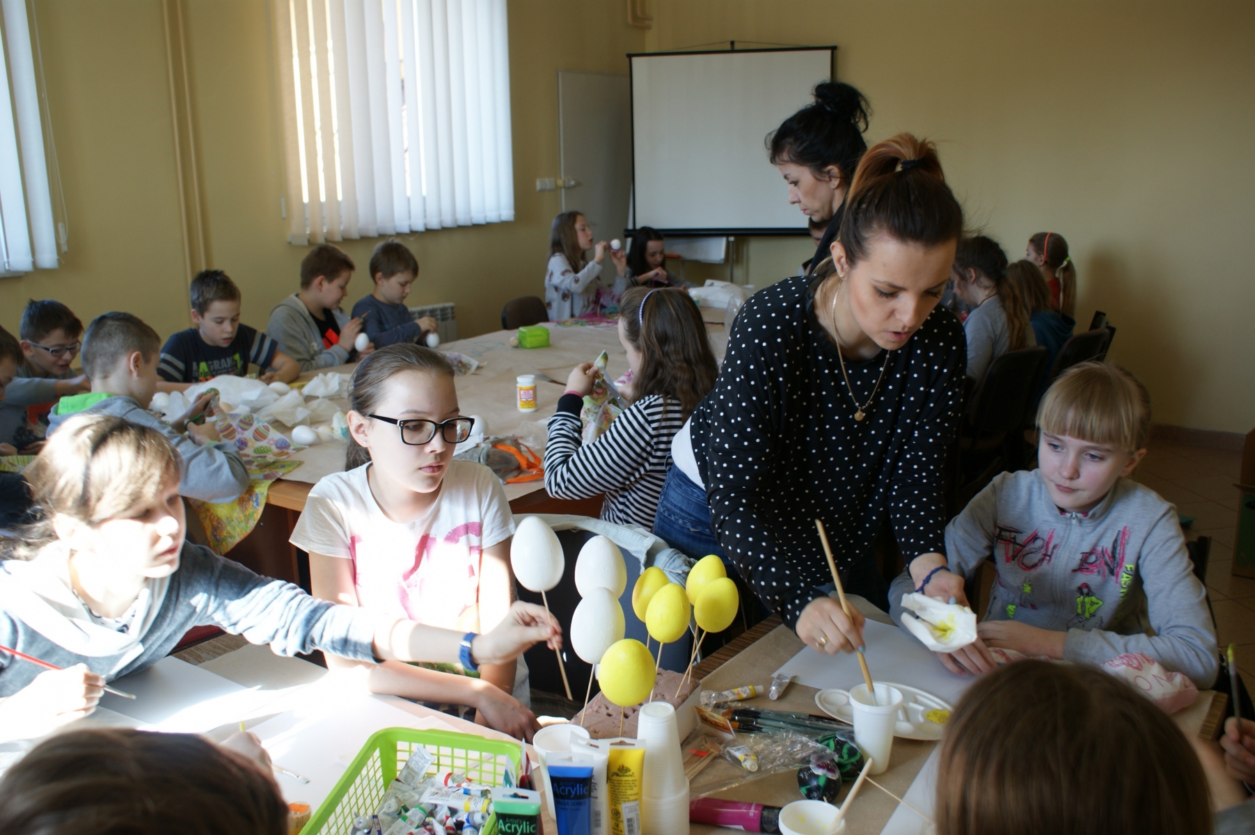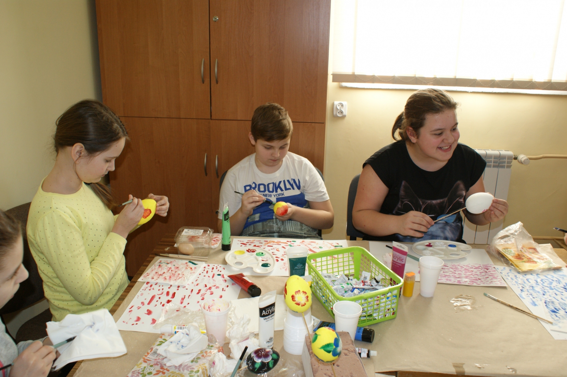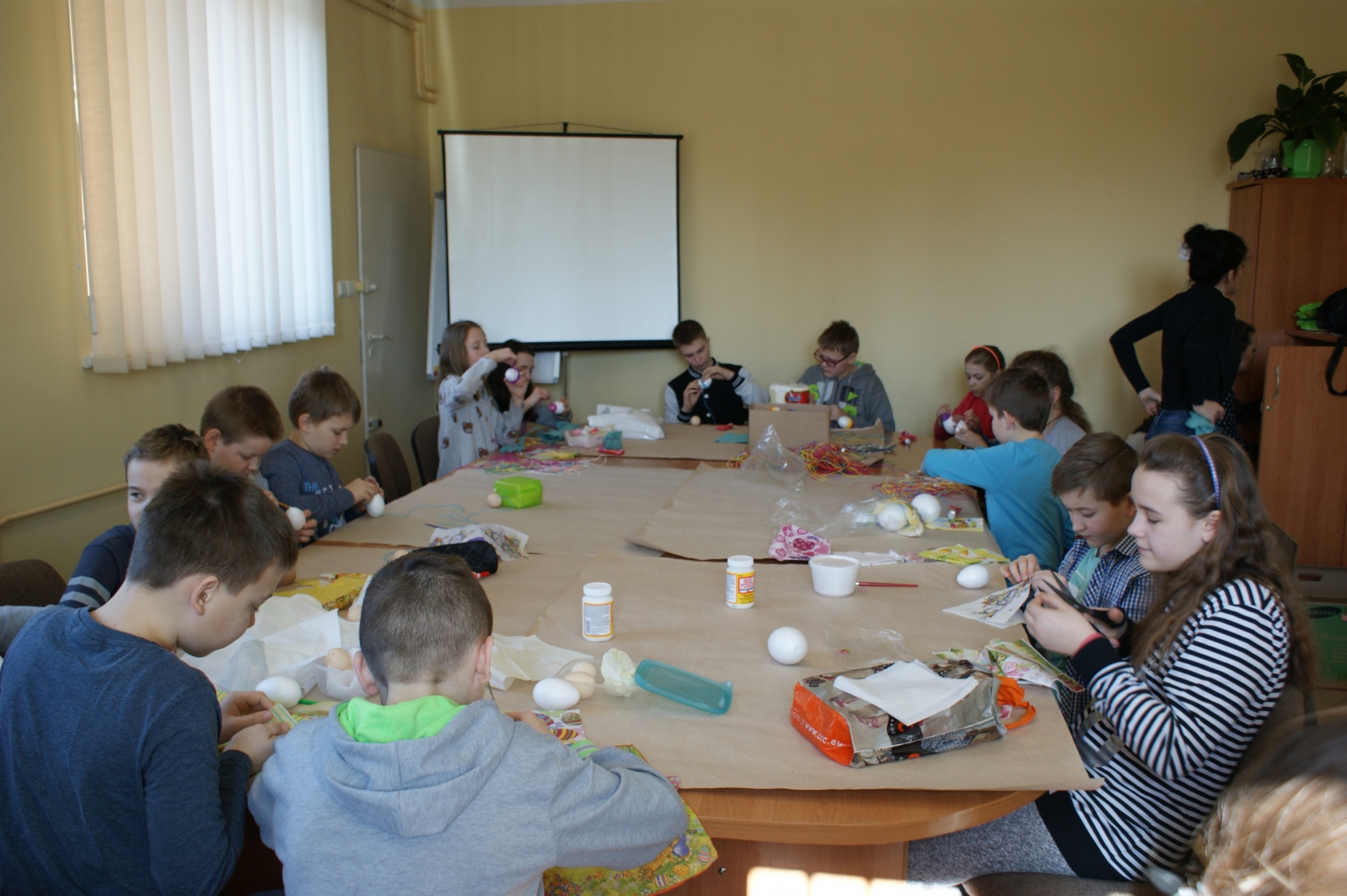 Uczniowie zostali podzieleni na trzy grupy a każda z nich pracowała inną techniką. Grupa pierwsza malowała pisanki farbami akrylowymi, po czy wykonywała na nich piękne wzory kwiatowe. Grupa druga wykonywała „decoupage” na pisance z serwetek z motywami wielkanocnymi, natomiast grupa trzecia owijała pisanki kolorową, skręconą bibuła, tworząc ciekawe kompozycje.