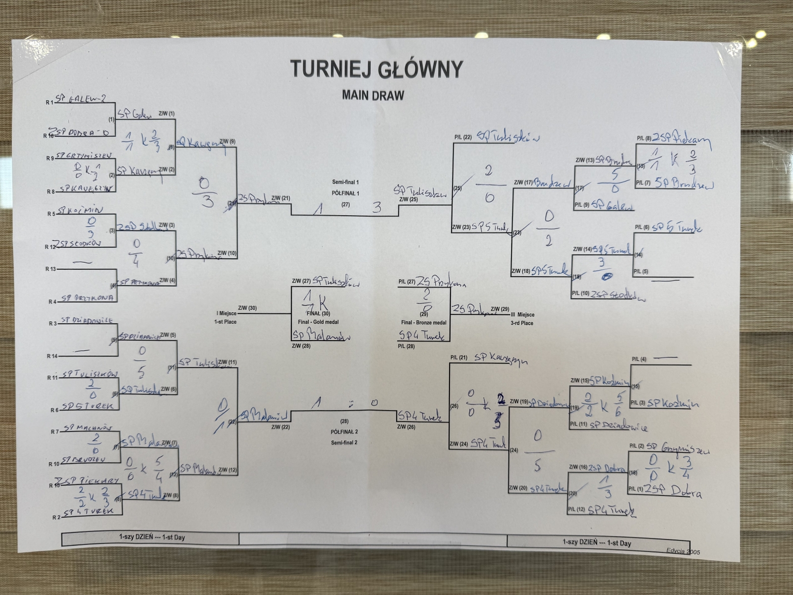 10 lutego w Brudzewie odbyły się Mistrzostwa Powiatu Tureckiego w Futsalu Chłopców. Naszą szkołę reprezentowali chłopcy z klas IV, V i VI w składzie: Ludwik Żurawik, Marcel Kokorzycki, Piotr Musidlak, Oskar Tyma, Łukasz Przygoński, Jakub Przygoński, Marcel Mikołajczyk, Kacper Ekiert, Adam Jarek oraz Wojtek Kaczorowski. Najwięcej trudności przyniosła rozgrywka z drużyną z Tuliszkowa. Przez cały mecz wygrywaliśmy 1:0, ale 8 sekund przed gwizdkiem sędziego udało im się wyrównać wynik, niestety przegraliśmy w rzutach karnych. W rezultacie chłopcy stanęli na II stopniu podium. W mistrzostwach brało udział aż 14 zespołów.
