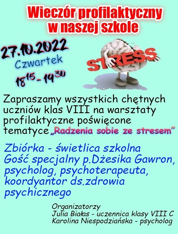 W ramach projektu Wieczory profilaktyczne zapraszamy wszystkich uczniów klas VIII, na cykliczne spotkania ze specjalistami, promujące zdrowie psychiczne uczniów. Już w ten czwartek pierwsze spotkanie poświęcone Radzeniu sobie ze stresem. Szczegóły na plakacie.