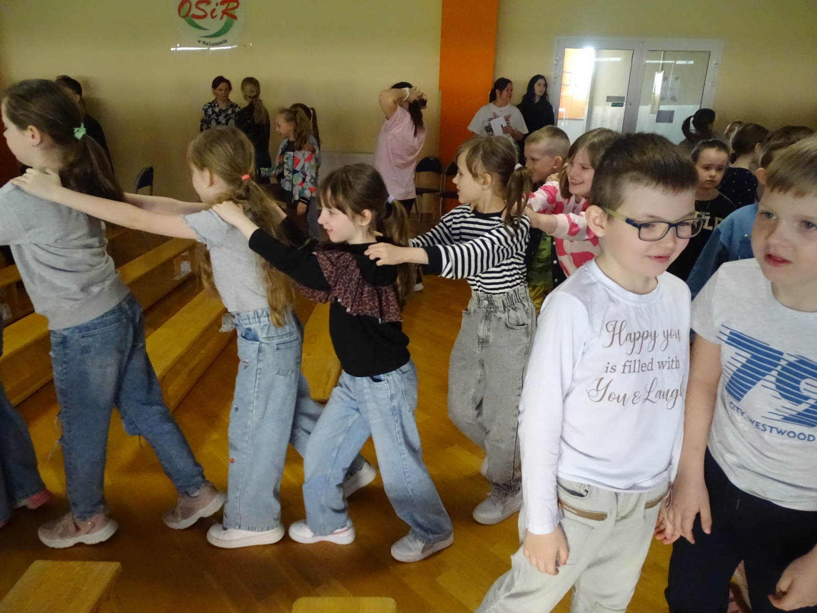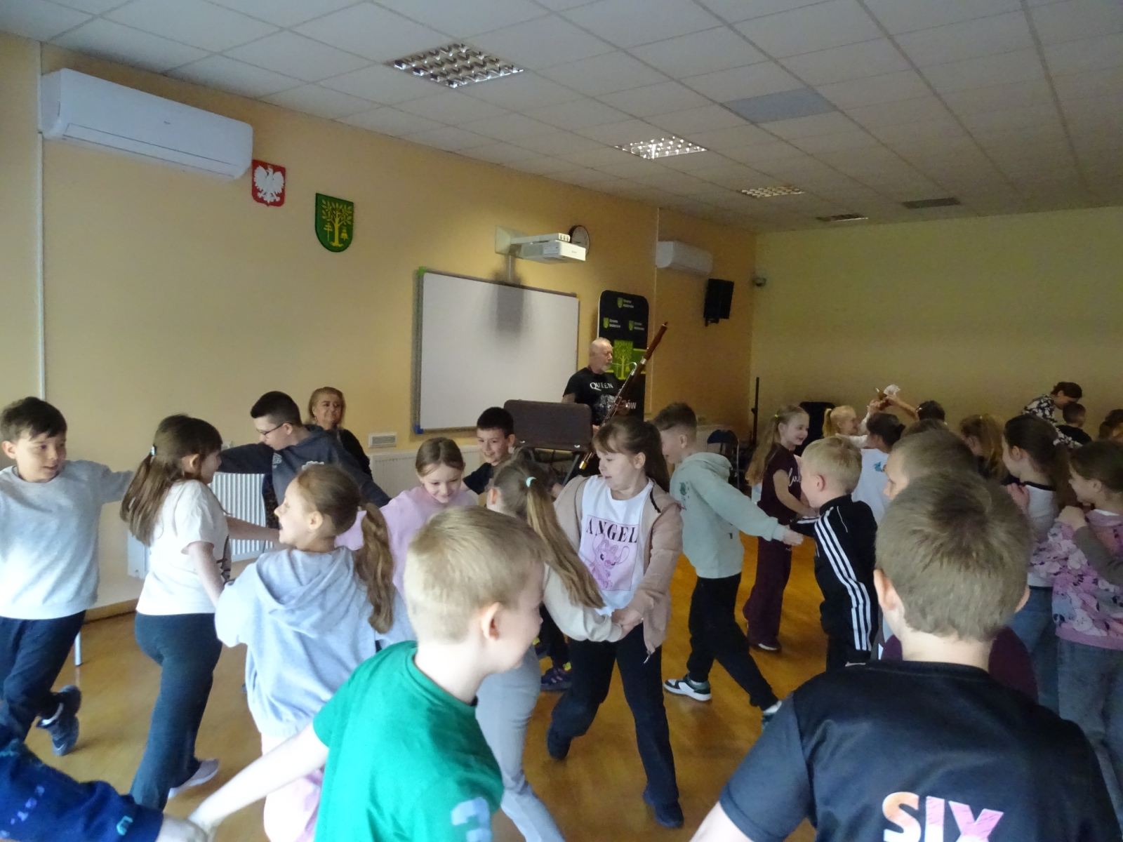 Potem przypomniał budowę instrumentu, omówił poszczególne jego części. W dalszej części koncertu uczniowie wysłuchali utworów: „Romans” i „Poleczka”. Na zakończenie audycji dzieci z opiekunami wysłuchały muzycznego utworu pochodzącego z dzikiego zachodu pt. „Moje małe buciki”, w rytmie cza – cza, przy którym wszyscy wesoło się bawili. To była bardzo ciekawa i skoczna audycja.