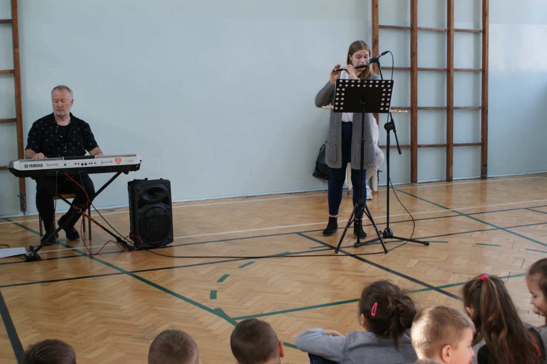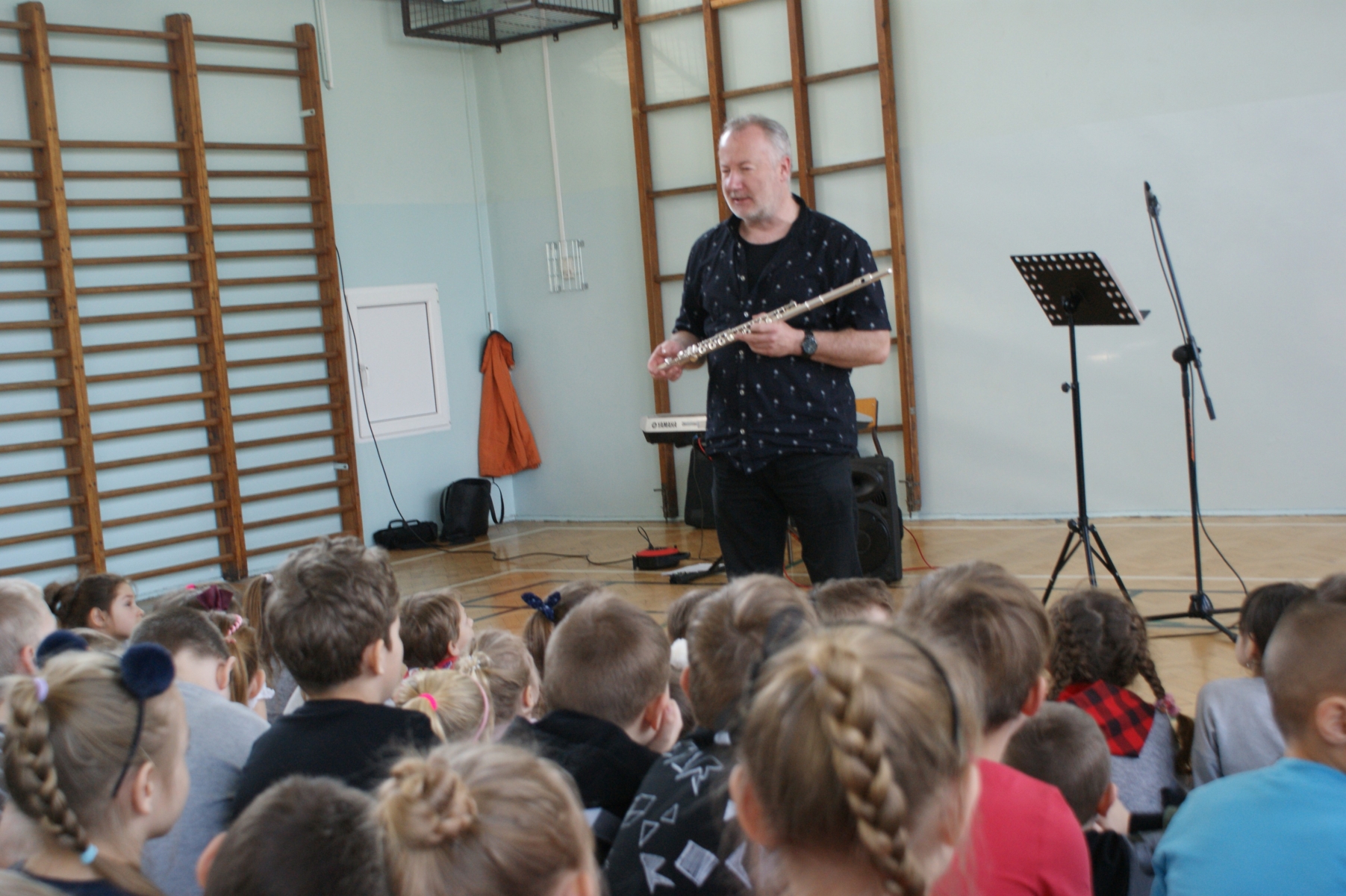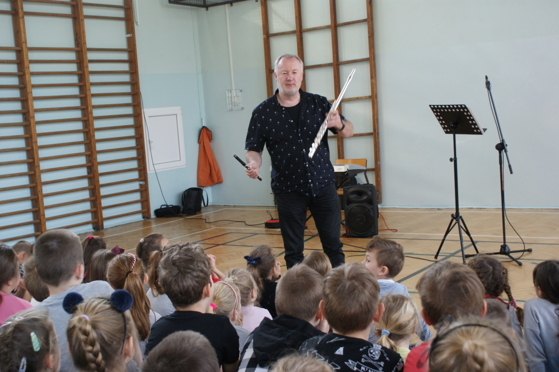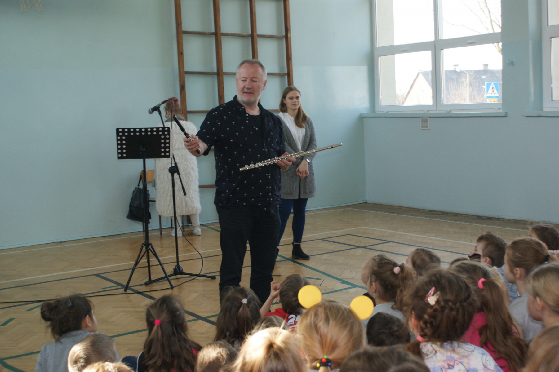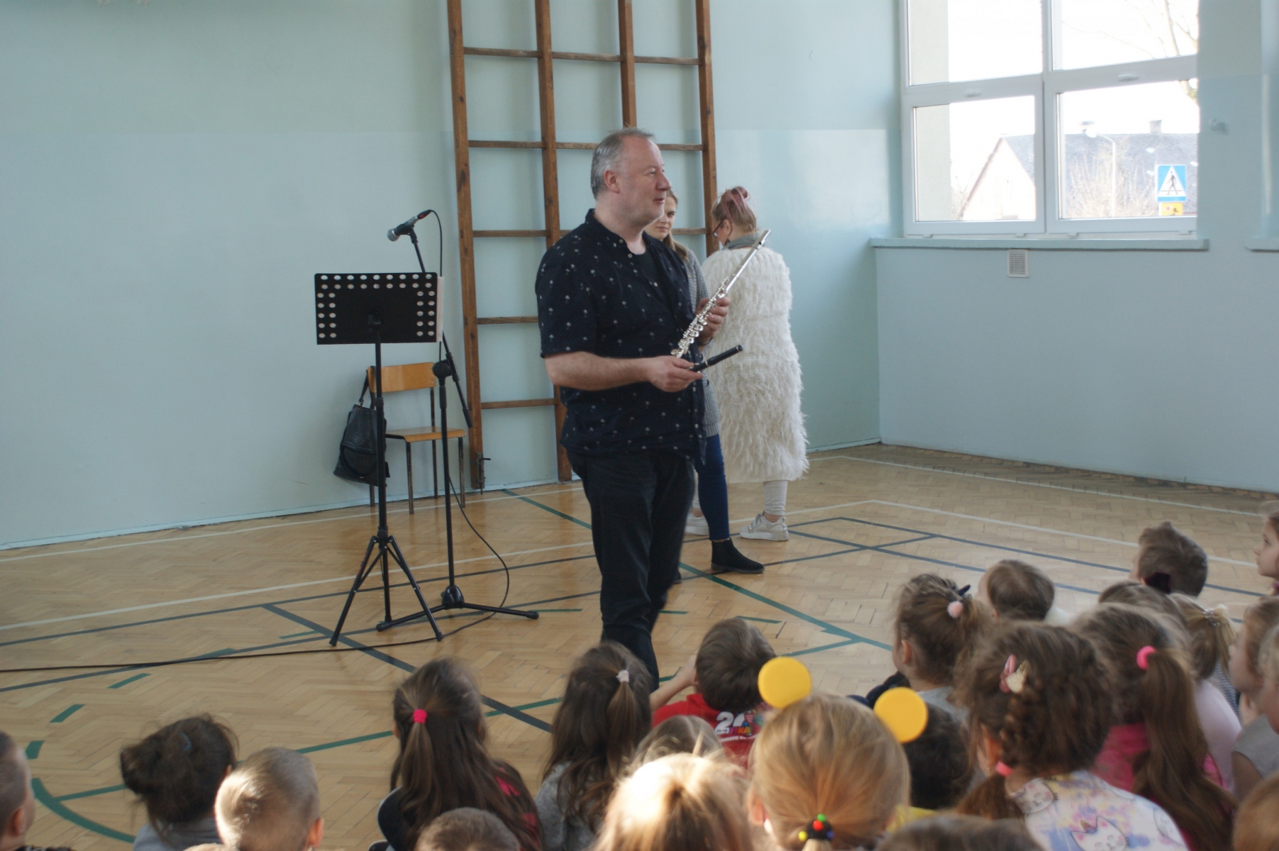 Prowadzący uporządkowali wiedzę uczniów na temat instrumentów dętych drewnianych i blaszanych. Opowiedzieli o budowie fletu małego i dużego i wspólnie ustalono do jakiej grupy instrumentów zaliczamy zaprezentowane na audycji flety. To była bardzo pouczająca, wiosenna lekcja muzyki.
