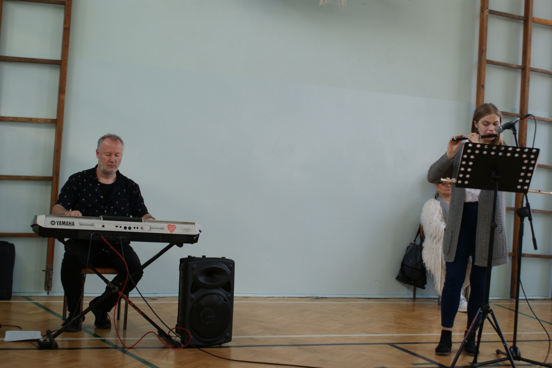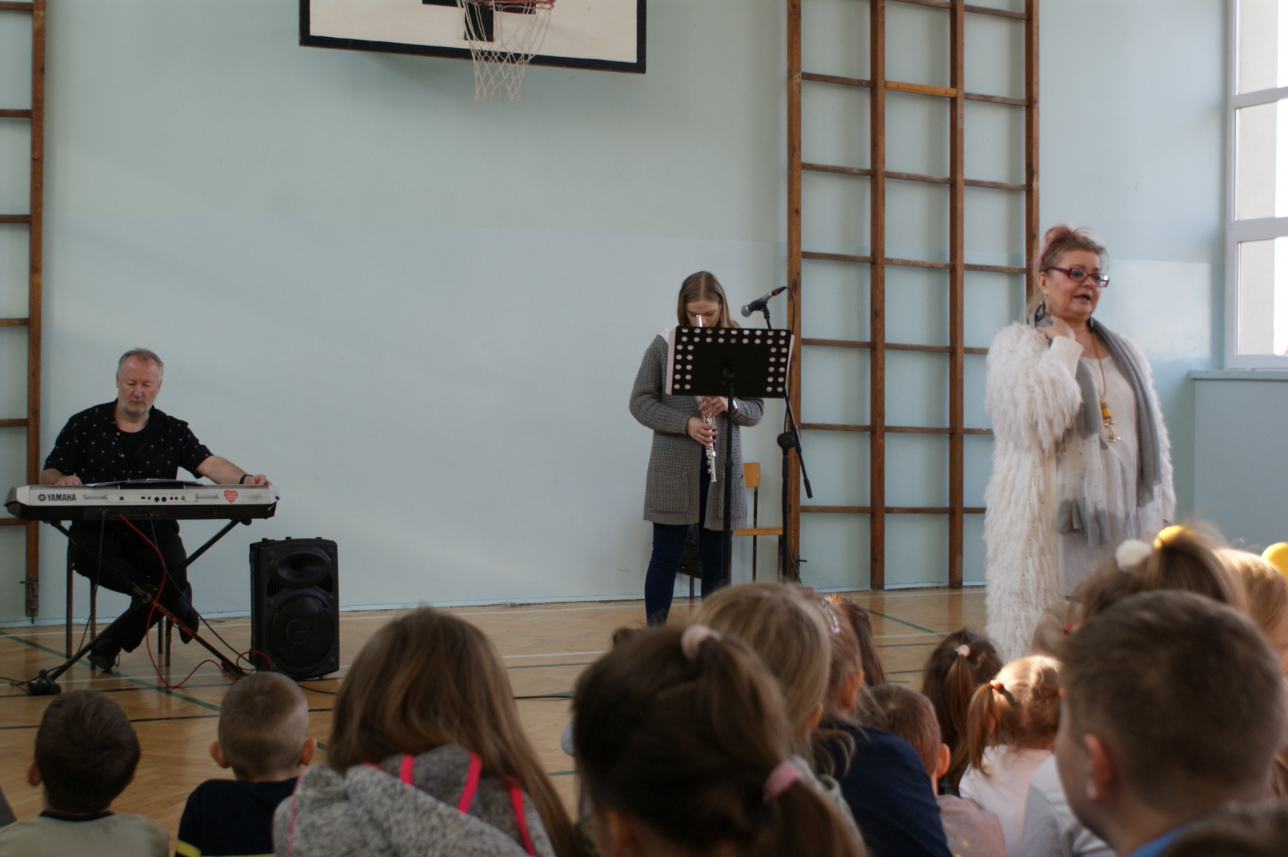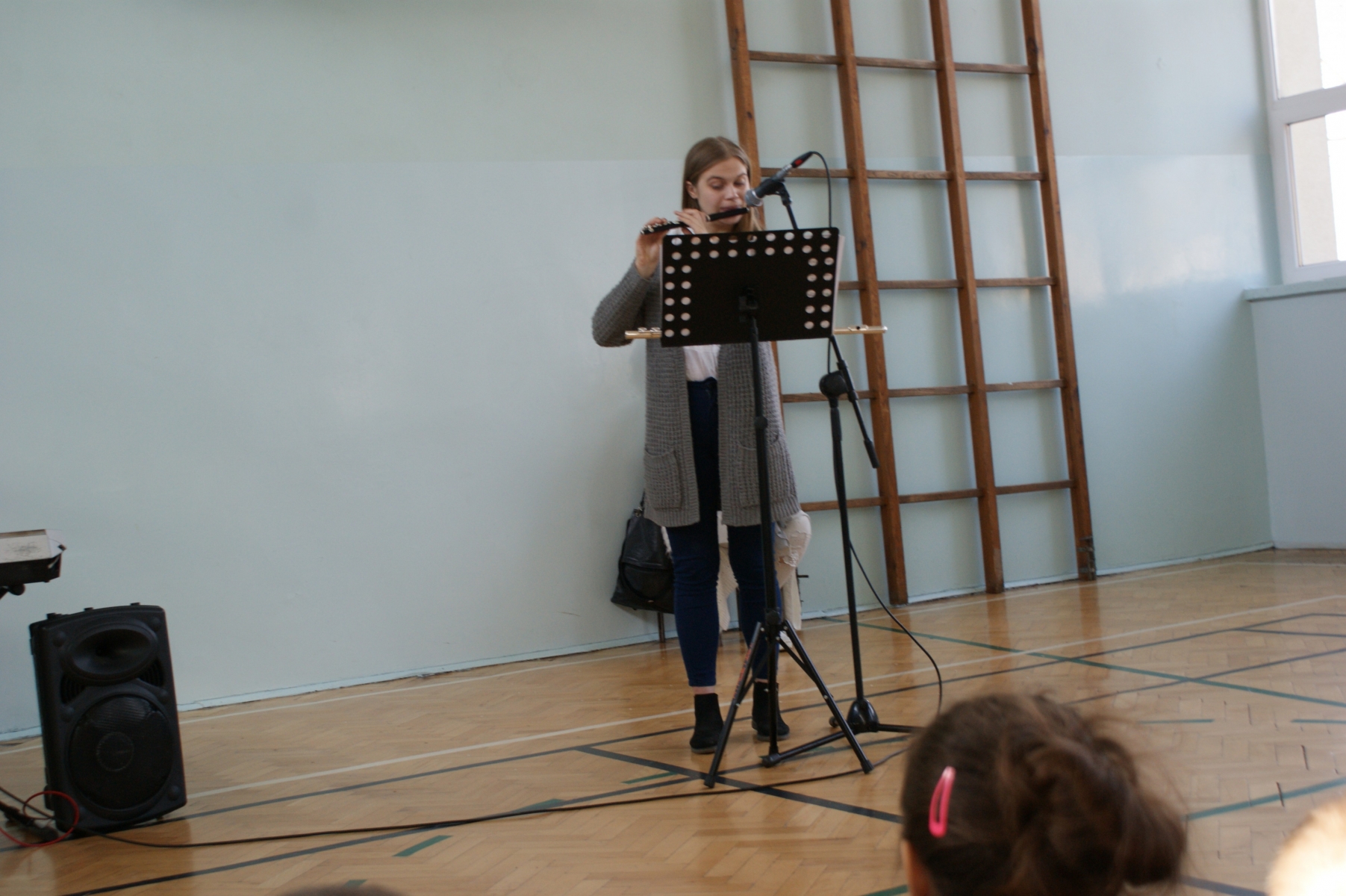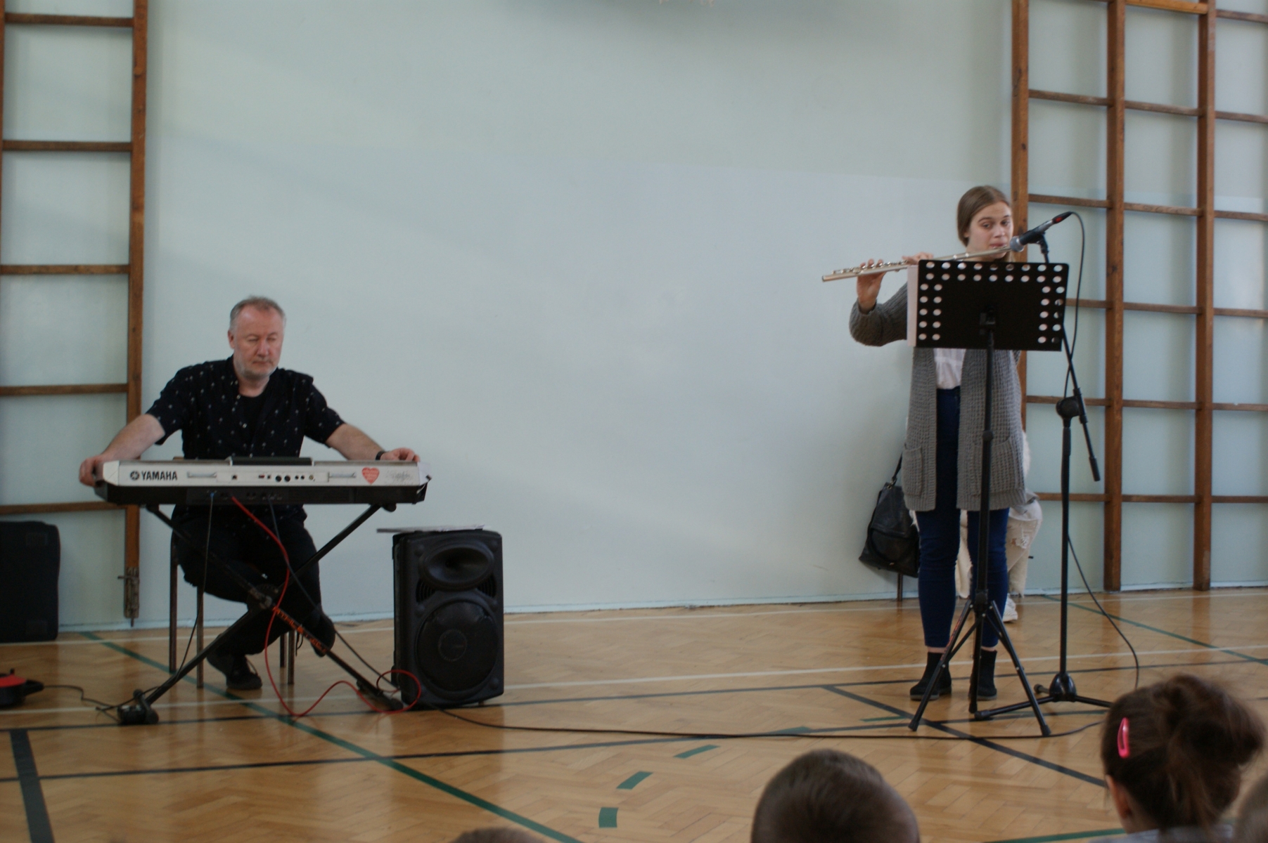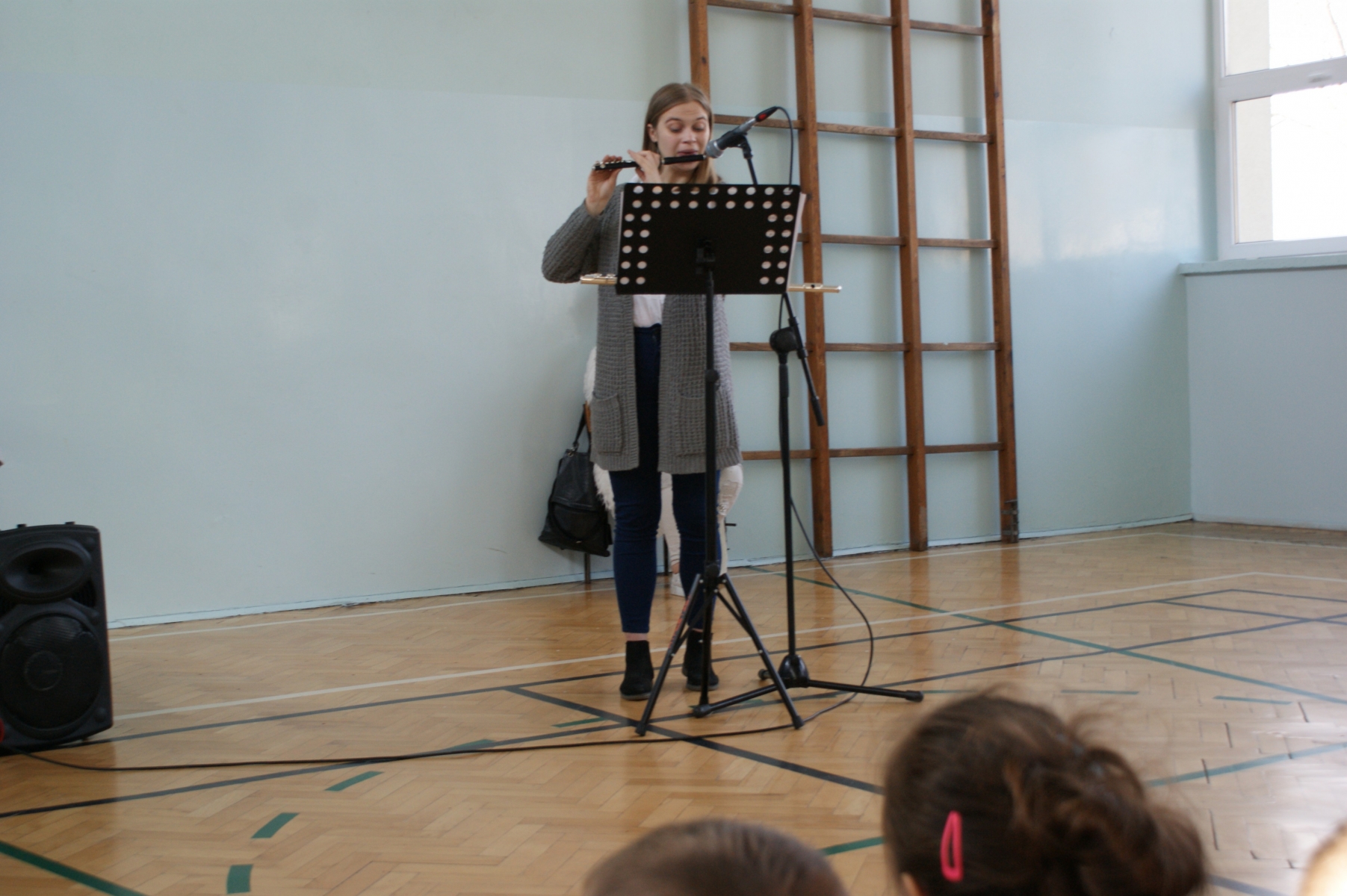 Prowadzący uporządkowali wiedzę uczniów na temat instrumentów dętych drewnianych i blaszanych. Opowiedzieli o budowie fletu małego i dużego i wspólnie ustalono do jakiej grupy instrumentów zaliczamy zaprezentowane na audycji flety. To była bardzo pouczająca, wiosenna lekcja muzyki.