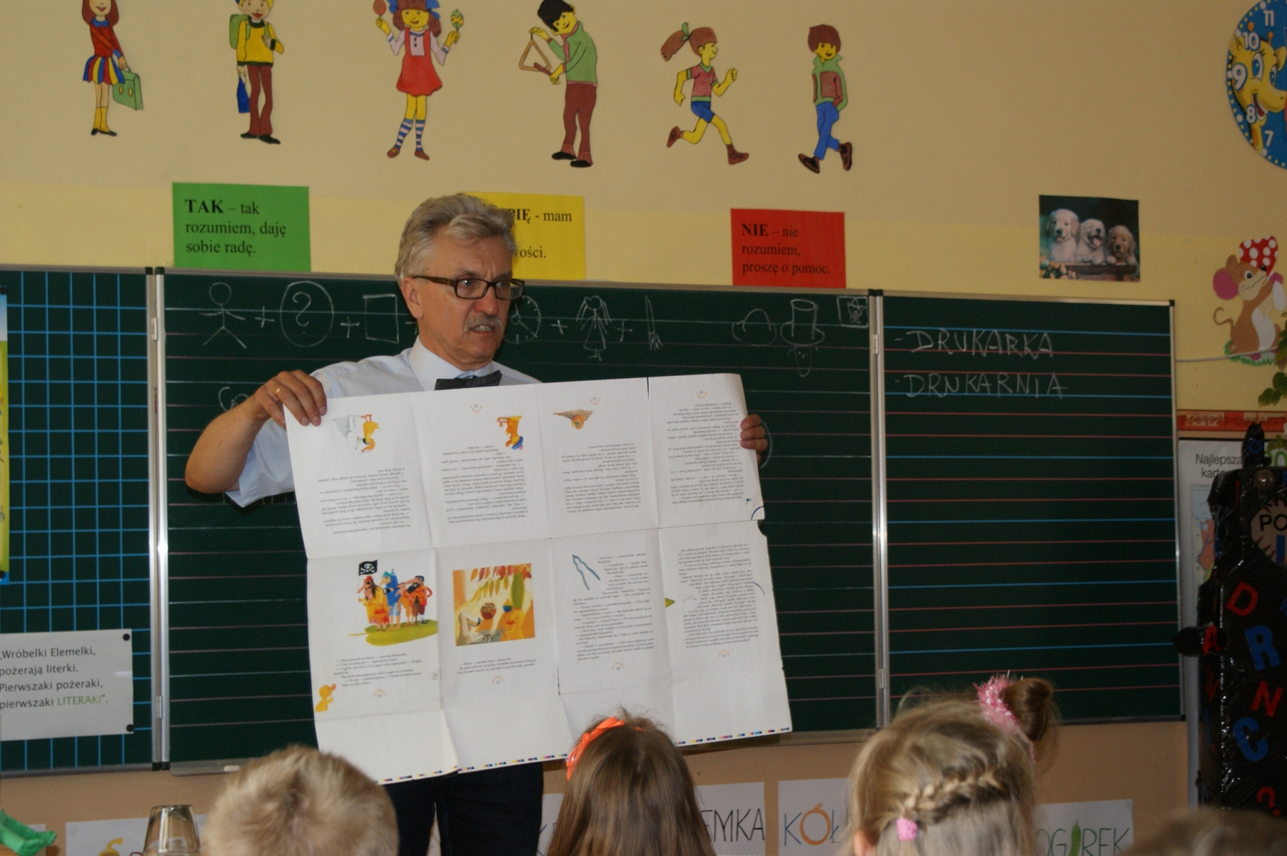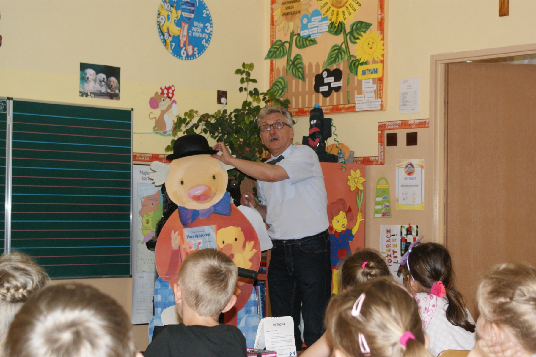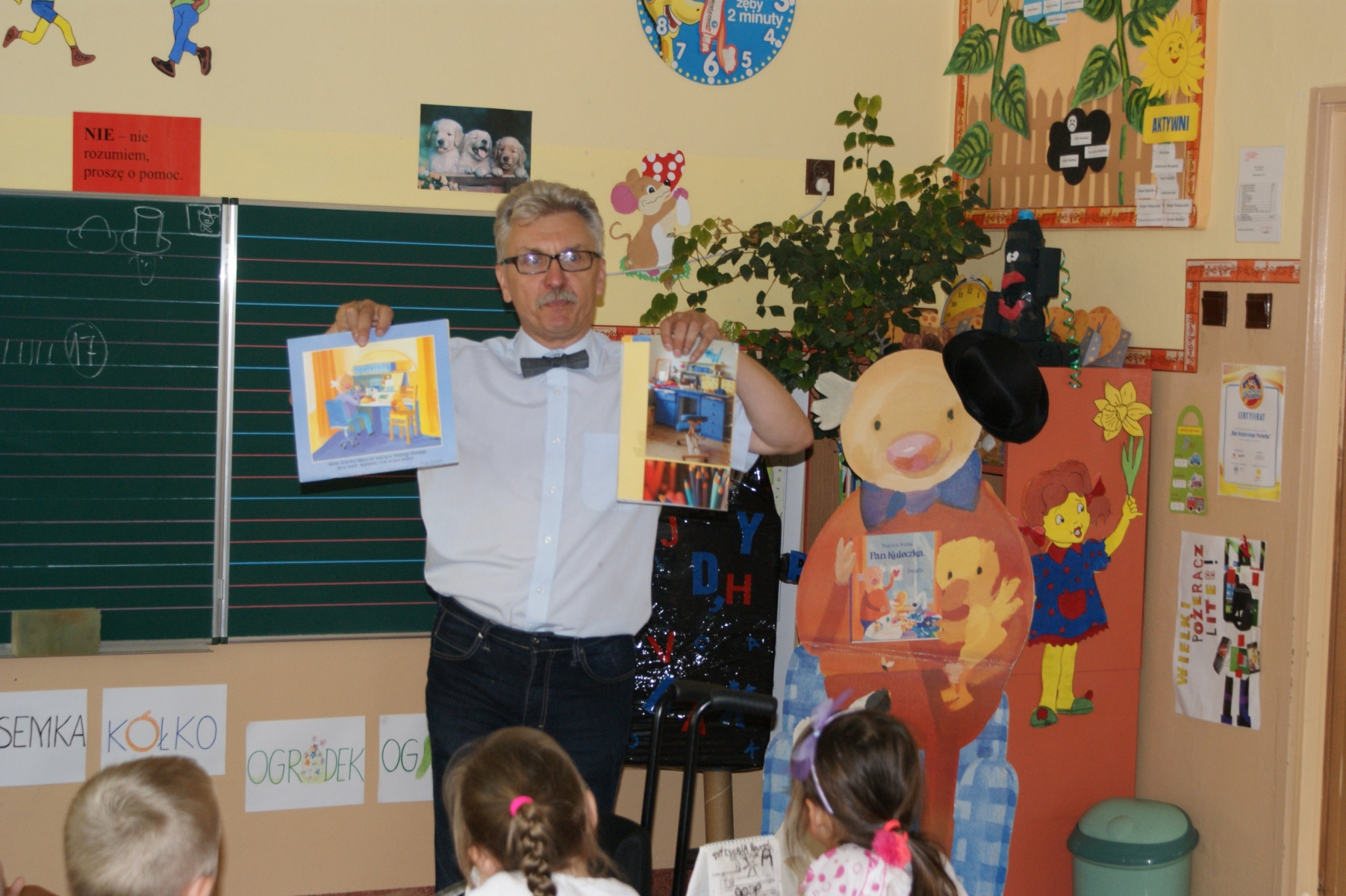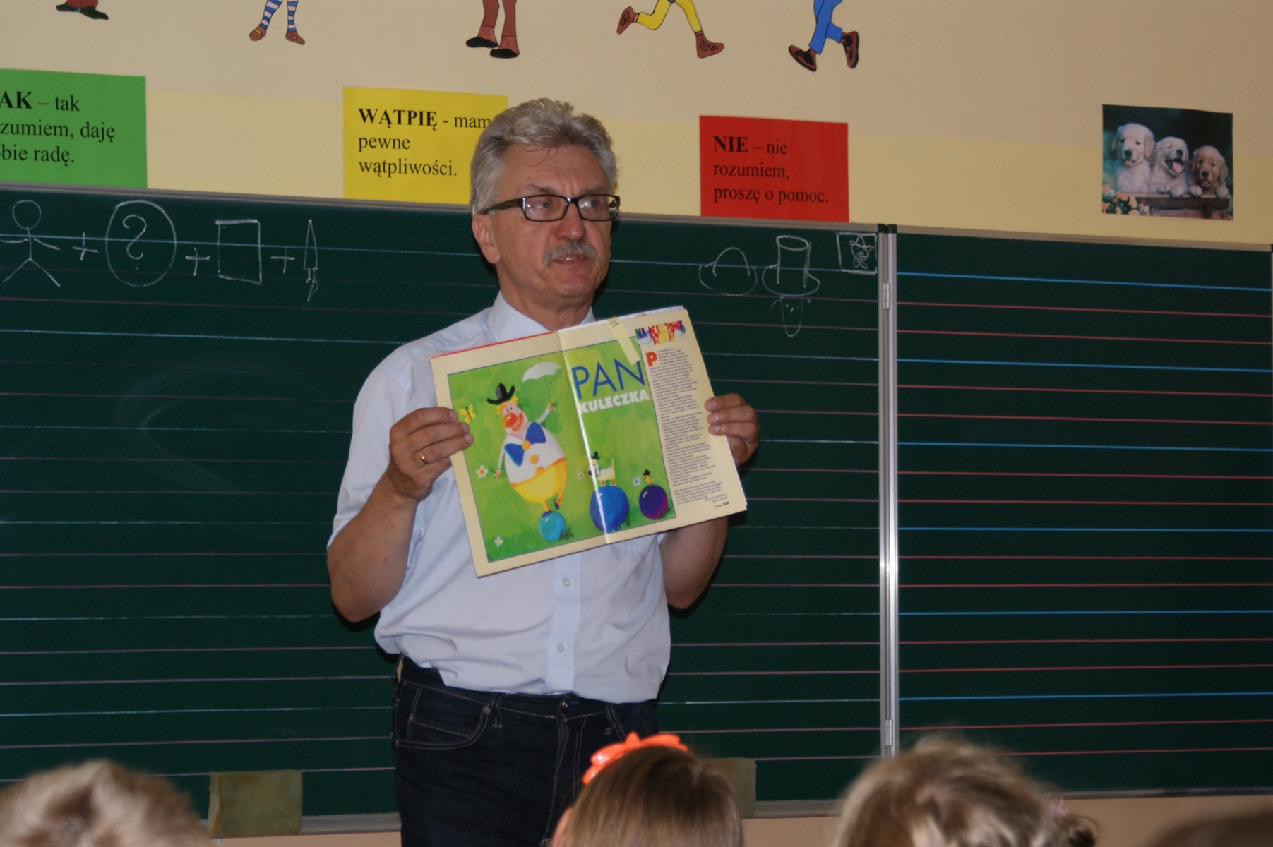 Uczniowie z niecierpliwością oczekiwali przyjazdu pisarza. Na początku spotkania dzieci mogły wysłuchać książki czytanej przez samego autora o Panu Kuleczce i jego zwierzątkach: kaczce Katastrofie, psu Pypciu i musze Bzyk-Bzyk, uczestnicząc w animacji bajki za pomocą pacynek. Dowiedziały się w jaki sposób powstawały książki pisarza „Od pomysłu do książki”, jakie są kolejne etapy ich powstawania i skąd autor czerpał pomysły oraz jak wyglądała współpraca pisarza z ilustratorką jego książek panią Elżbietą Wasiuczyńską. Bardzo spodobała się dzieciom zabawa pt. ”Co to może być?”. Zadaniem uczniów było odgadnąć ukryty w worku przedmiot za pomocą dotyku, a następnie powiedzieć co on może przedstawiać. Dzieci miały bardzo dużo ciekawych pomysłów na nazwanie skojarzeń związanych ze spinaczem