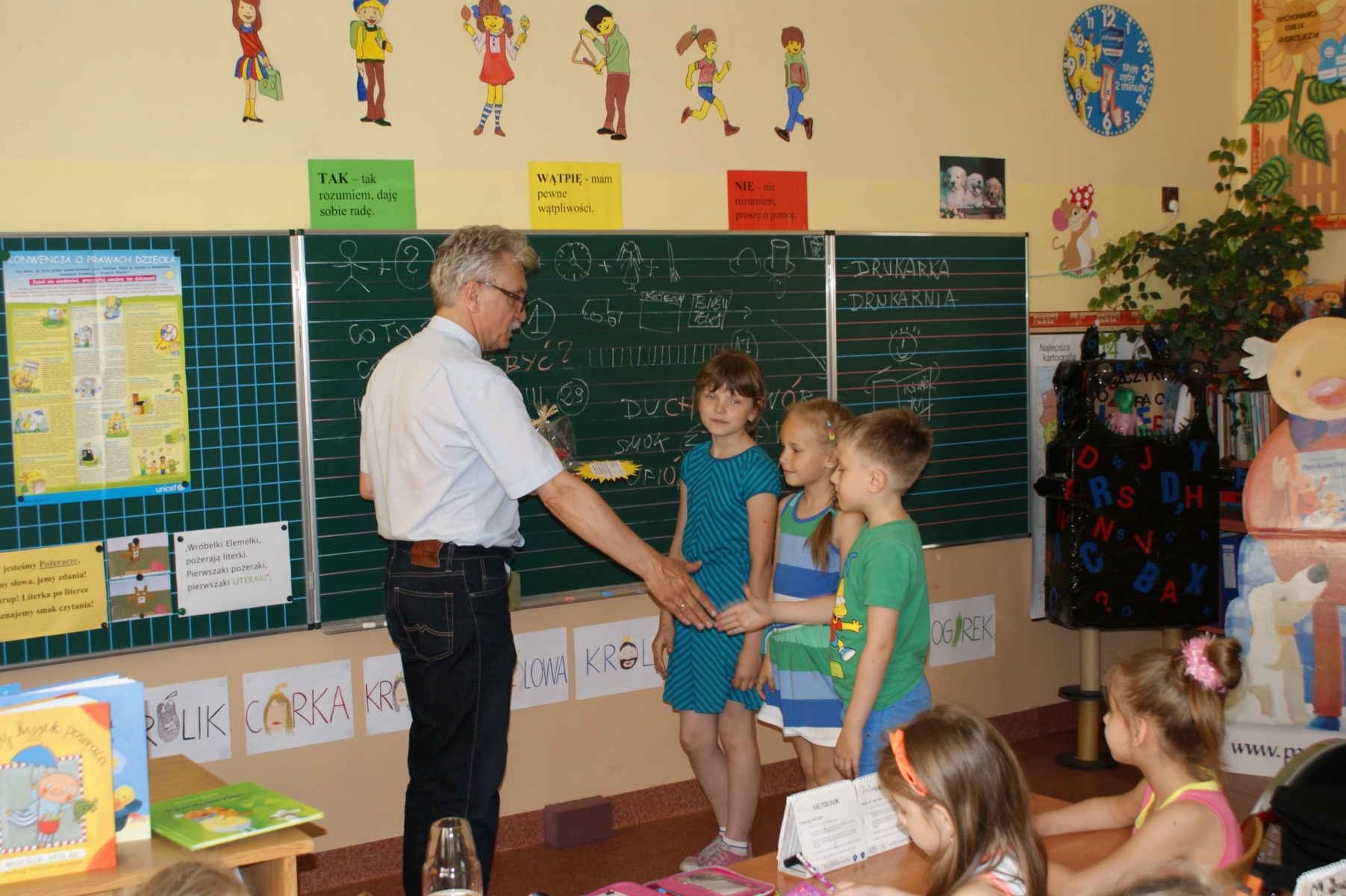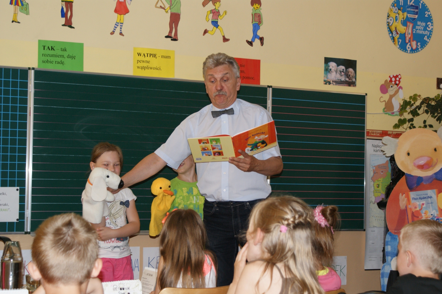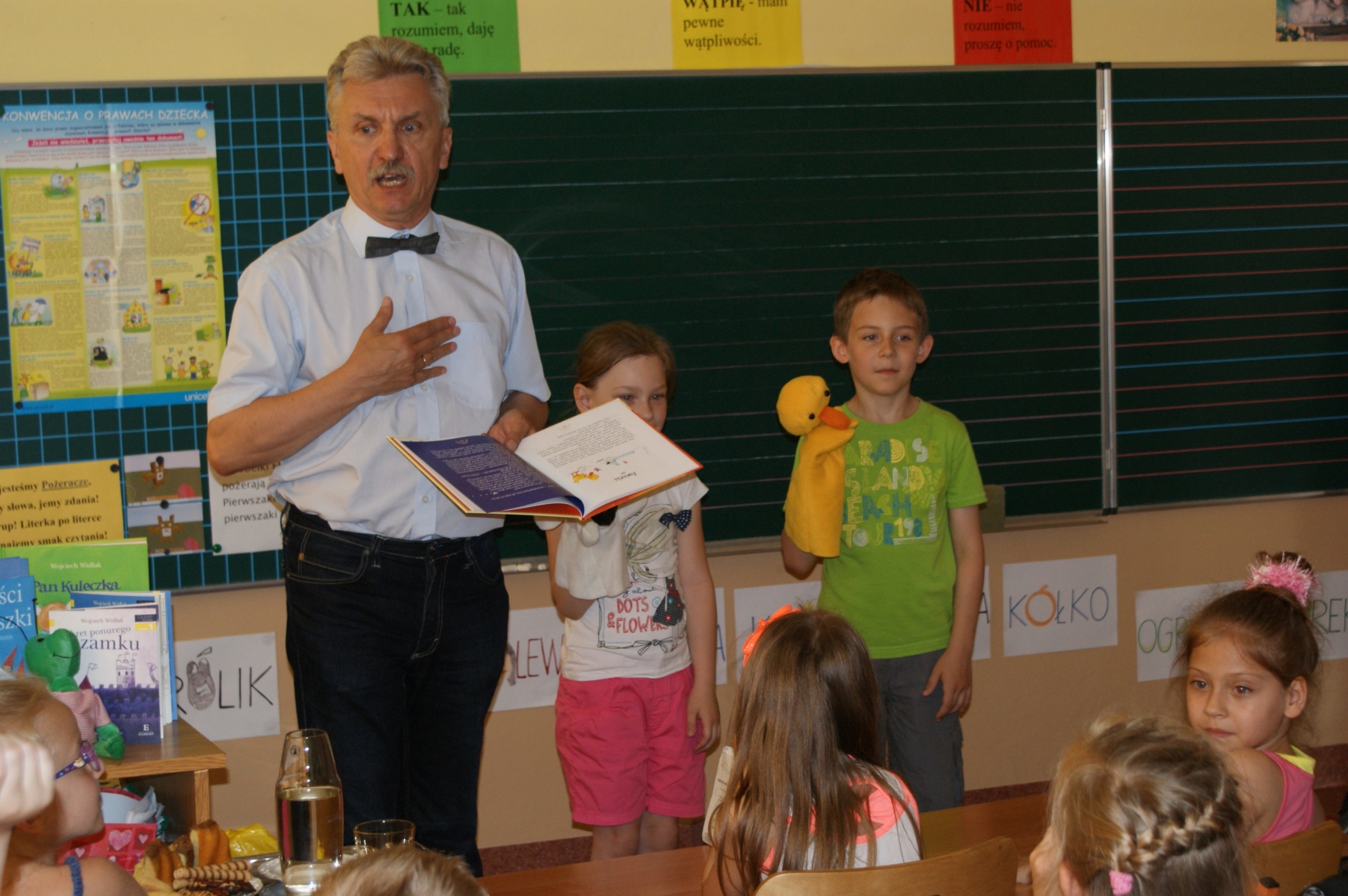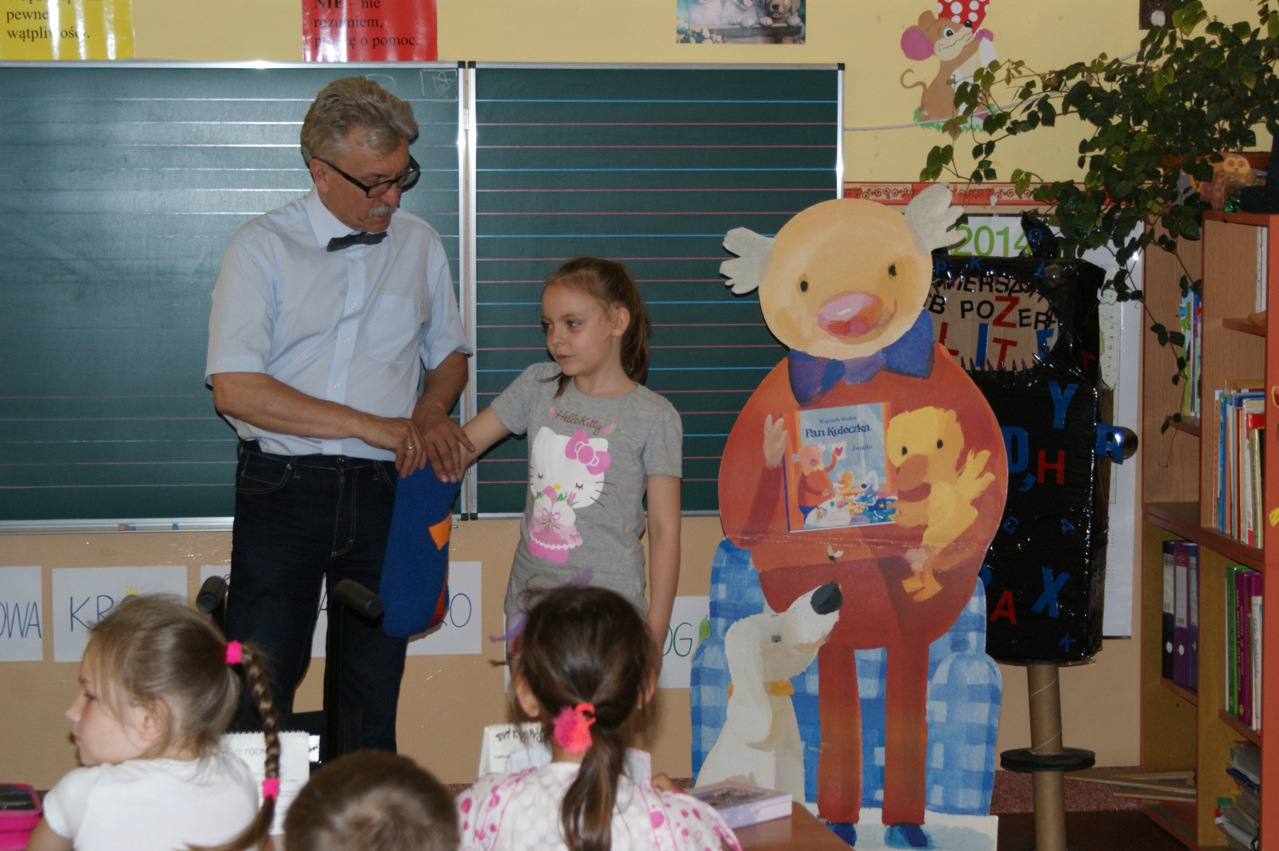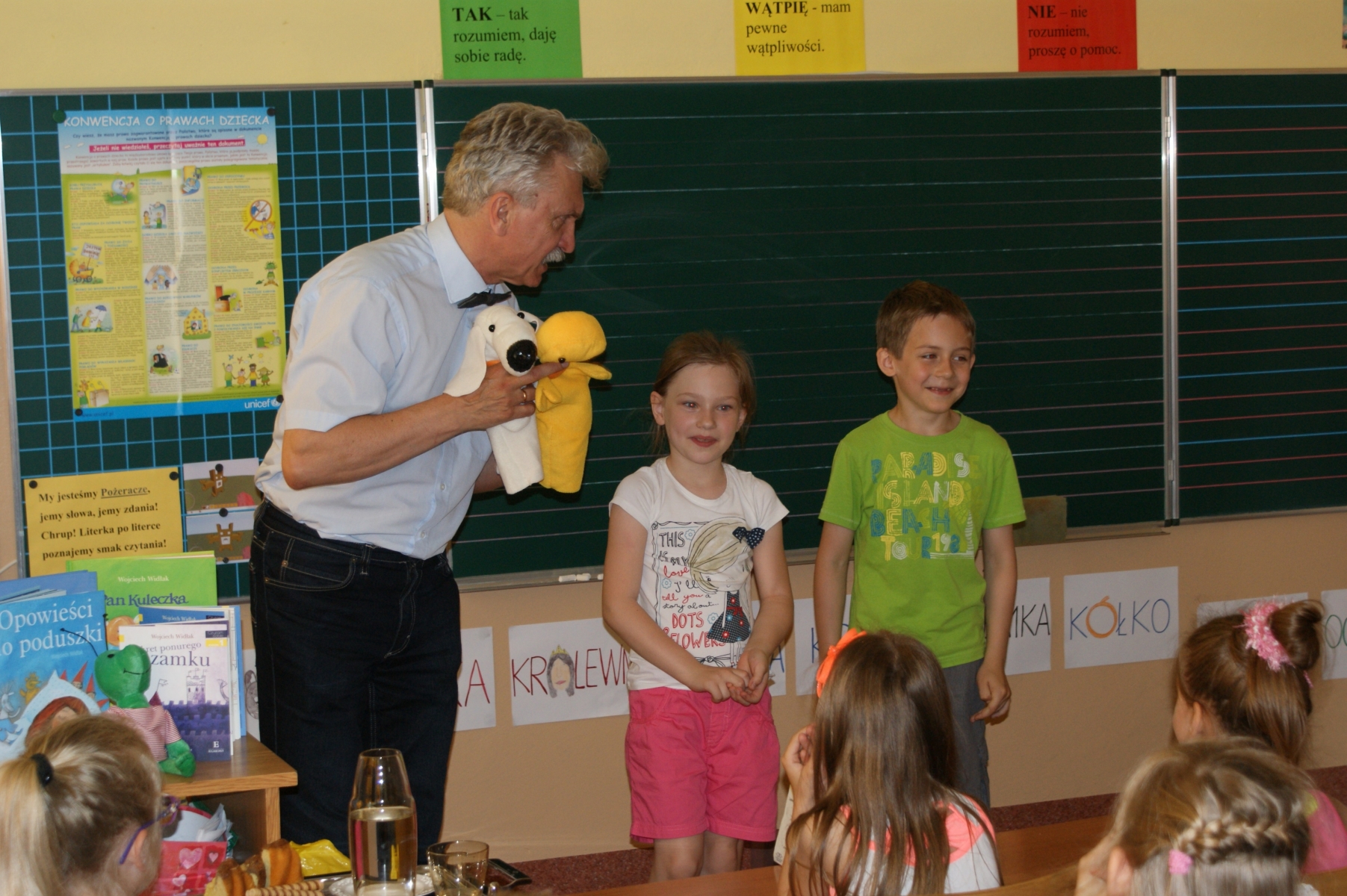 Uczniowie z niecierpliwością oczekiwali przyjazdu pisarza. Na początku spotkania dzieci mogły wysłuchać książki czytanej przez samego autora o Panu Kuleczce i jego zwierzątkach: kaczce Katastrofie, psu Pypciu i musze Bzyk-Bzyk, uczestnicząc w animacji bajki za pomocą pacynek. Dowiedziały się w jaki sposób powstawały książki pisarza „Od pomysłu do książki”, jakie są kolejne etapy ich powstawania i skąd autor czerpał pomysły oraz jak wyglądała współpraca pisarza z ilustratorką jego książek panią Elżbietą Wasiuczyńską. Bardzo spodobała się dzieciom zabawa pt. ”Co to może być?”. Zadaniem uczniów było odgadnąć ukryty w worku przedmiot za pomocą dotyku, a następnie powiedzieć co on może przedstawiać. Dzieci miały bardzo dużo ciekawych pomysłów na nazwanie skojarzeń związanych ze spinaczem