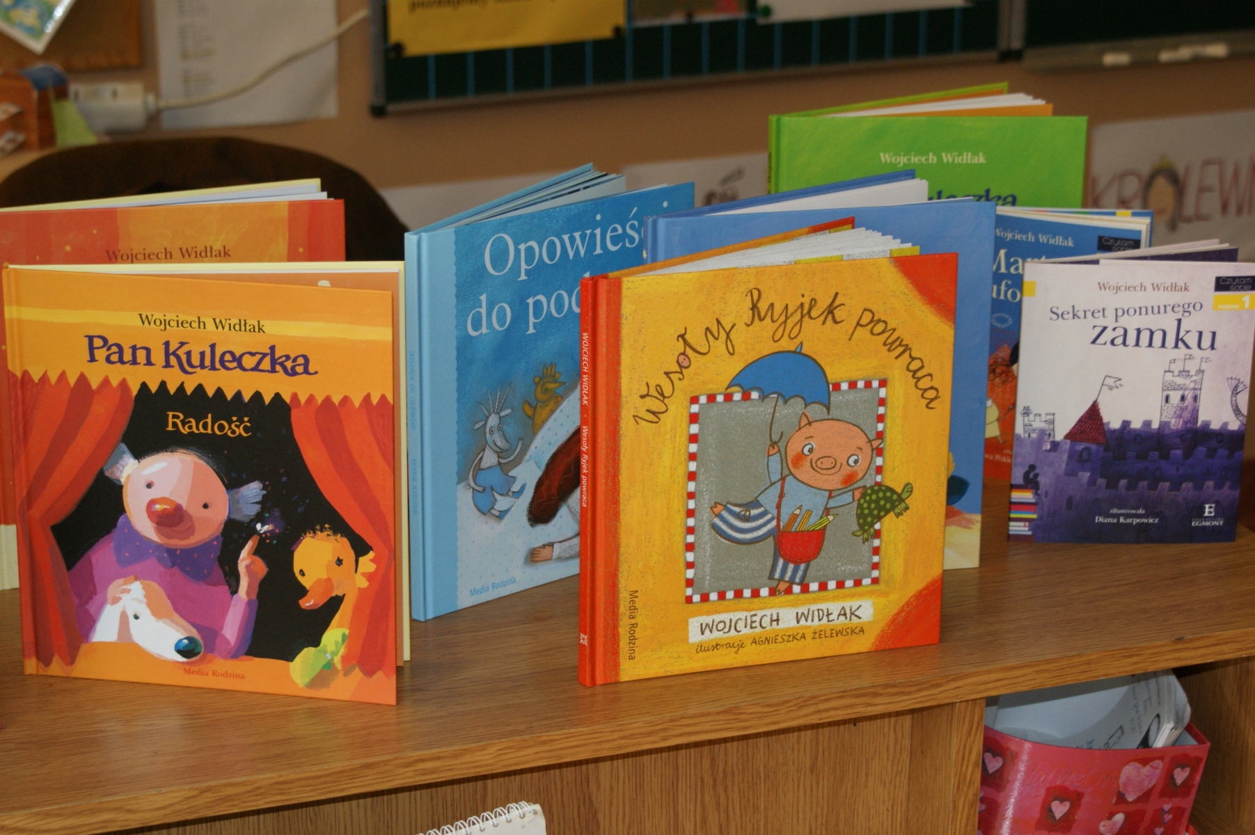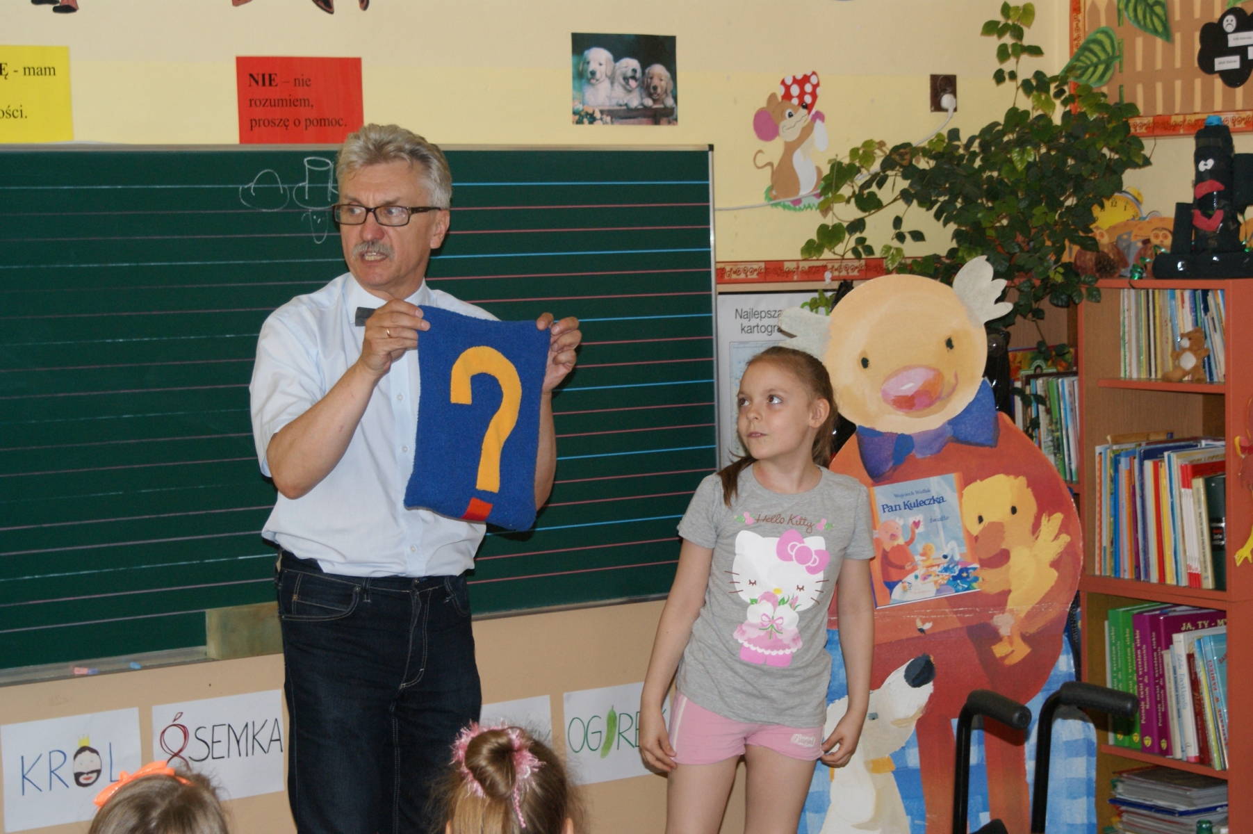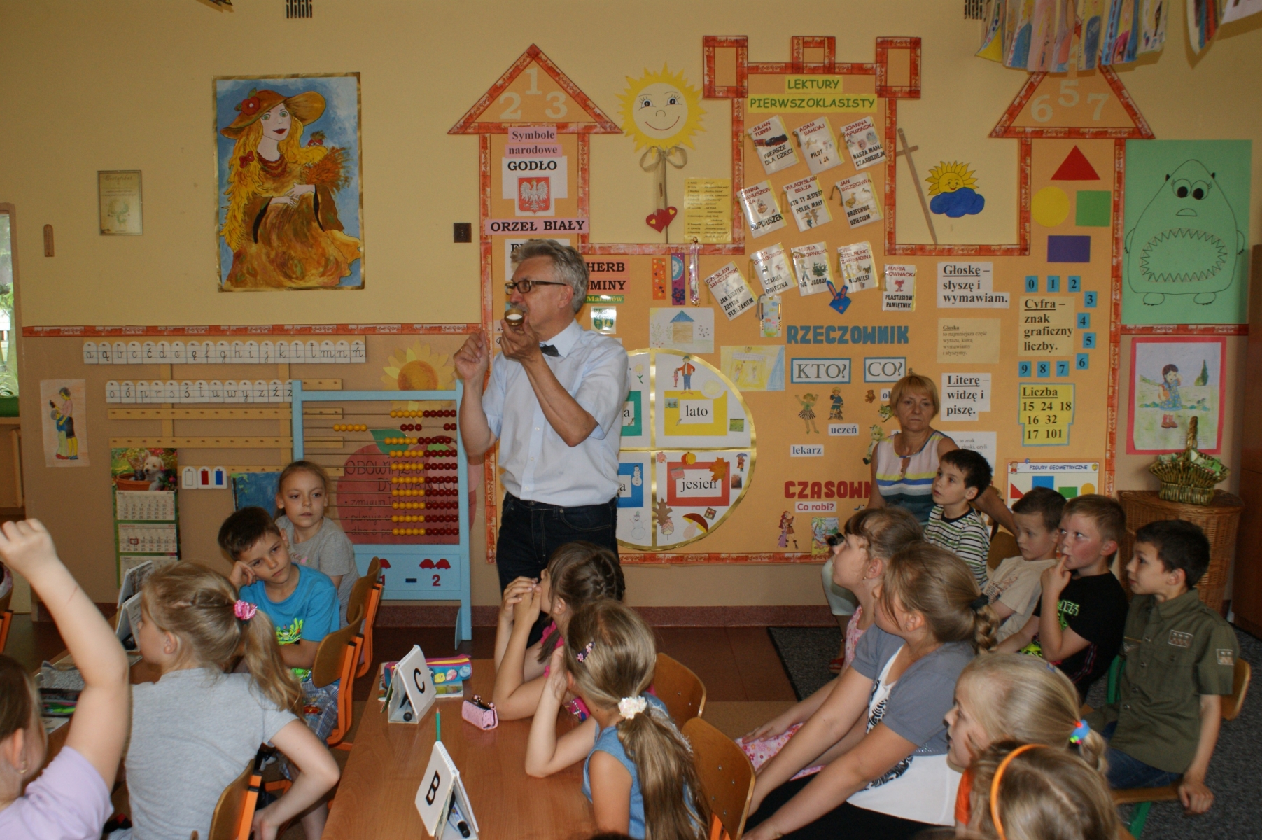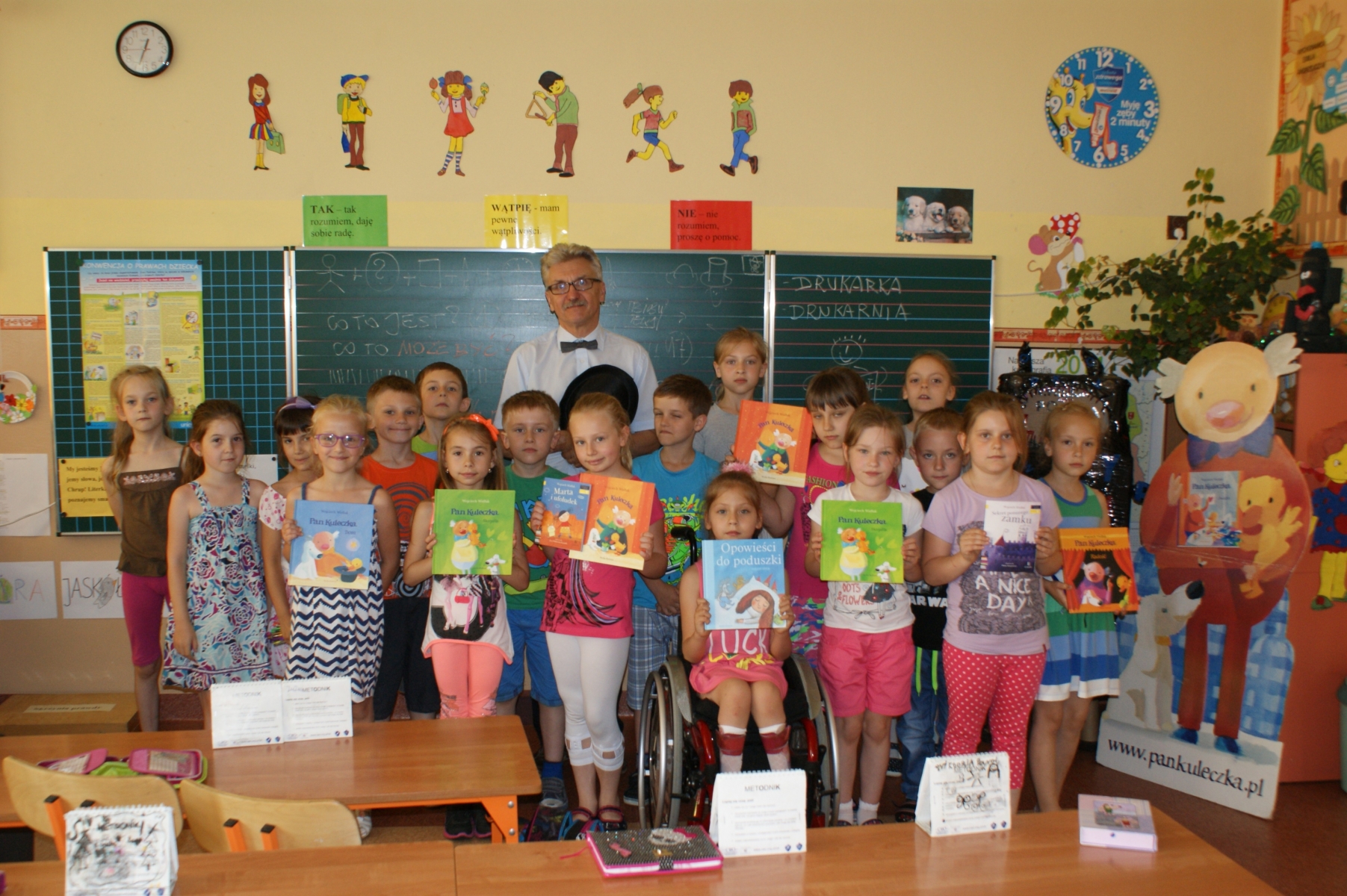 Uczniowie z niecierpliwością oczekiwali przyjazdu pisarza. Na początku spotkania dzieci mogły wysłuchać książki czytanej przez samego autora o Panu Kuleczce i jego zwierzątkach: kaczce Katastrofie, psu Pypciu i musze Bzyk-Bzyk, uczestnicząc w animacji bajki za pomocą pacynek. Dowiedziały się w jaki sposób powstawały książki pisarza „Od pomysłu do książki”, jakie są kolejne etapy ich powstawania i skąd autor czerpał pomysły oraz jak wyglądała współpraca pisarza z ilustratorką jego książek panią Elżbietą Wasiuczyńską. Bardzo spodobała się dzieciom zabawa pt. ”Co to może być?”. Zadaniem uczniów było odgadnąć ukryty w worku przedmiot za pomocą dotyku, a następnie powiedzieć co on może przedstawiać. Dzieci miały bardzo dużo ciekawych pomysłów na nazwanie skojarzeń związanych ze spinaczem