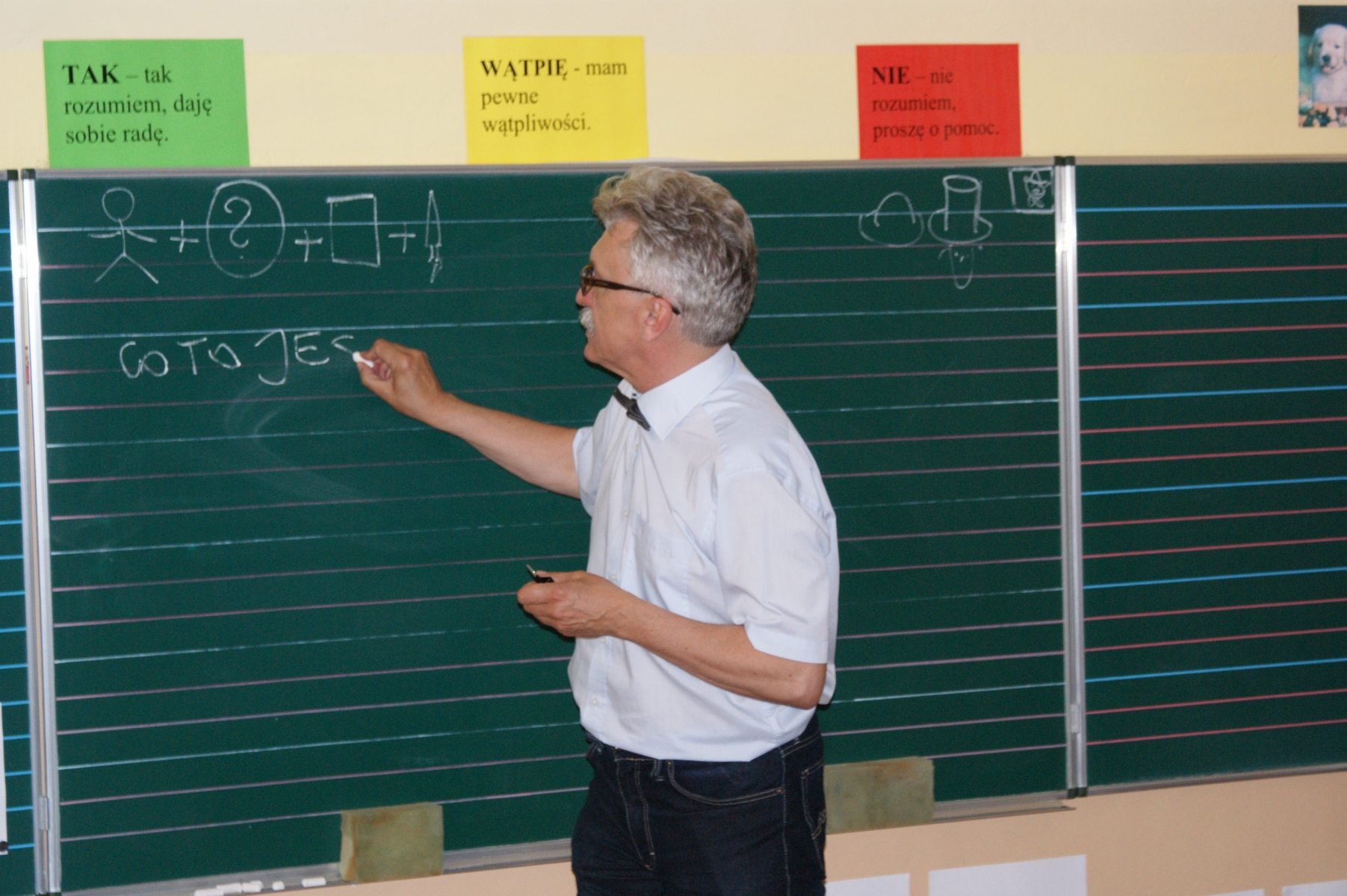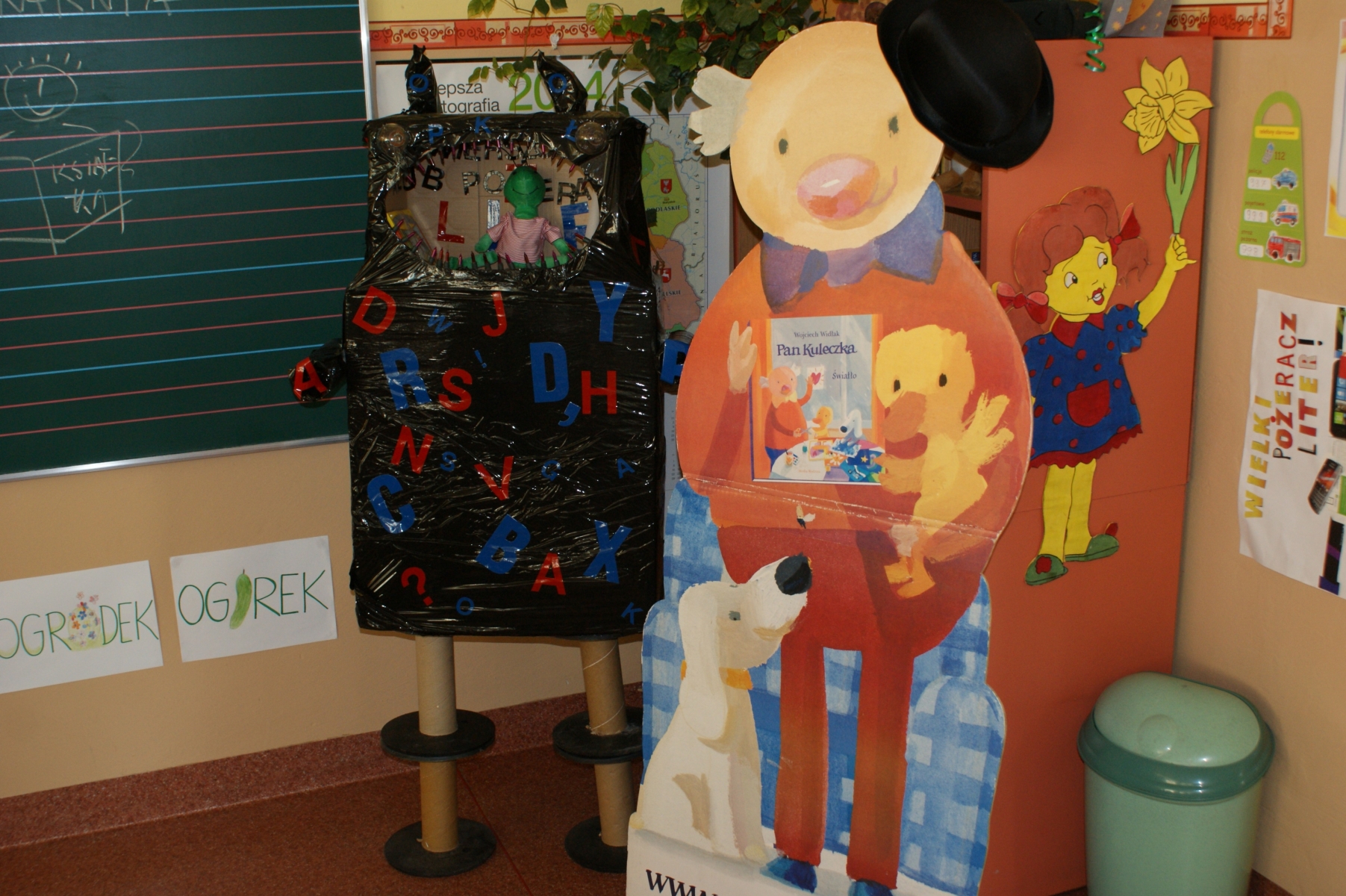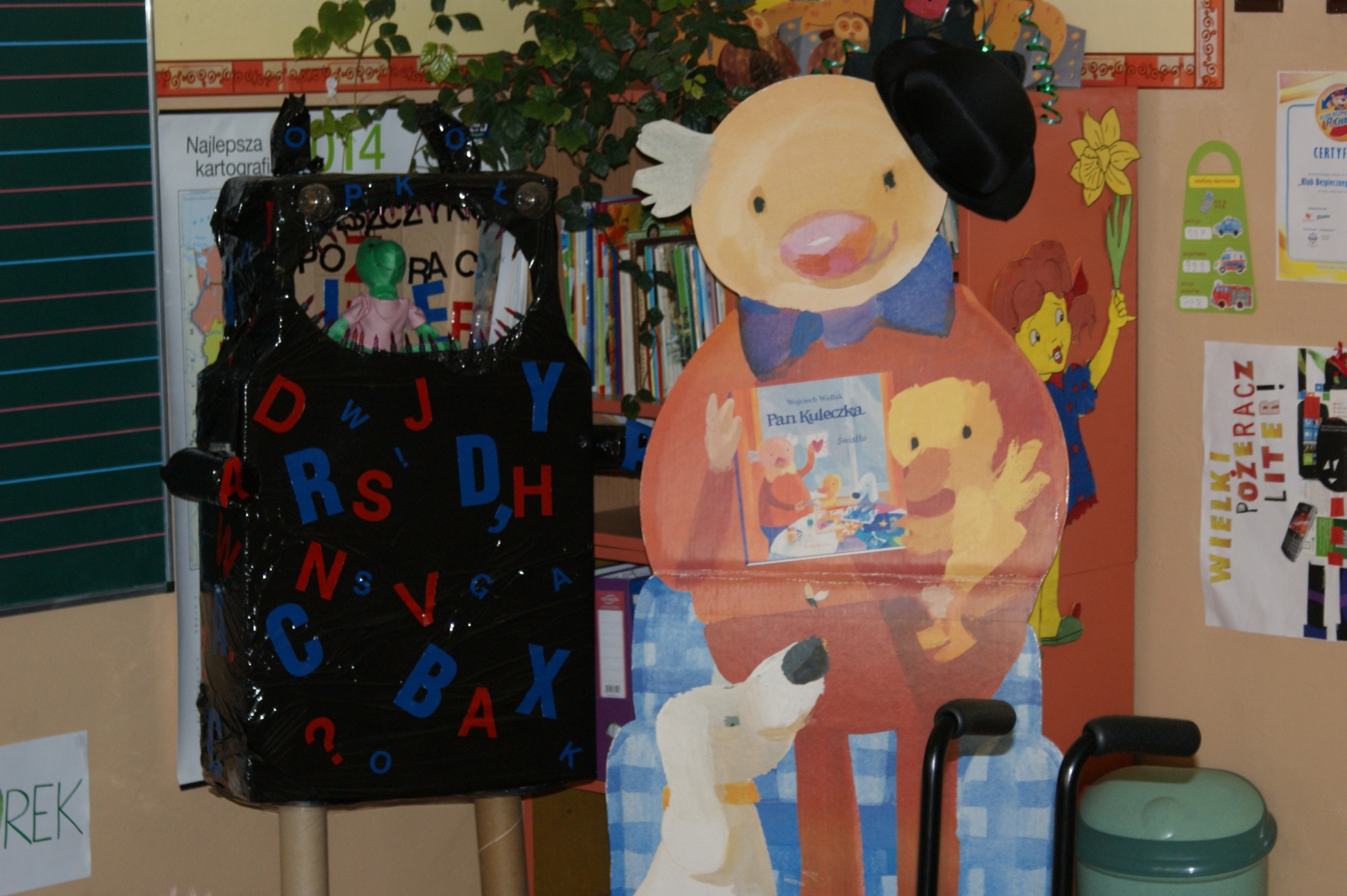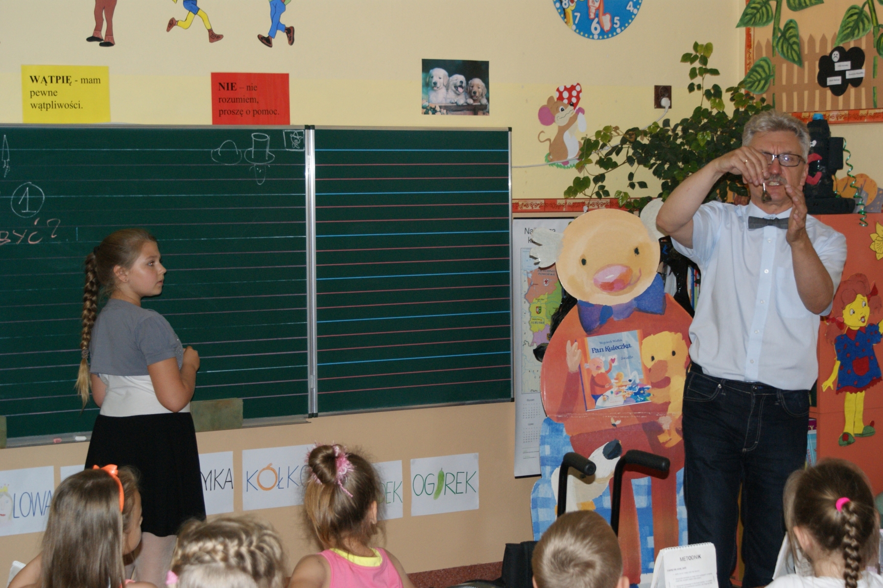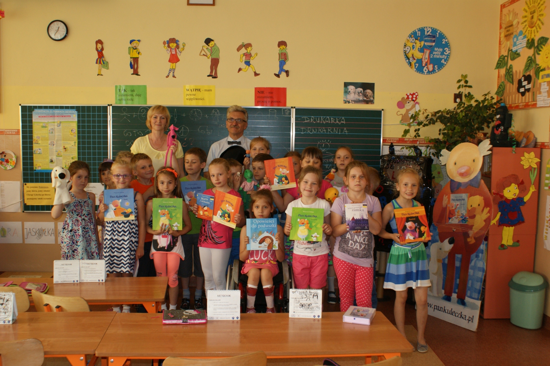Uczniowie z niecierpliwością oczekiwali przyjazdu pisarza. Na początku spotkania dzieci mogły wysłuchać książki czytanej przez samego autora o Panu Kuleczce i jego zwierzątkach: kaczce Katastrofie, psu Pypciu i musze Bzyk-Bzyk, uczestnicząc w animacji bajki za pomocą pacynek. Dowiedziały się w jaki sposób powstawały książki pisarza „Od pomysłu do książki”, jakie są kolejne etapy ich powstawania i skąd autor czerpał pomysły oraz jak wyglądała współpraca pisarza z ilustratorką jego książek panią Elżbietą Wasiuczyńską. Bardzo spodobała się dzieciom zabawa pt. ”Co to może być?”. Zadaniem uczniów było odgadnąć ukryty w worku przedmiot za pomocą dotyku, a następnie powiedzieć co on może przedstawiać. Dzieci miały bardzo dużo ciekawych pomysłów na nazwanie skojarzeń związanych ze spinaczem