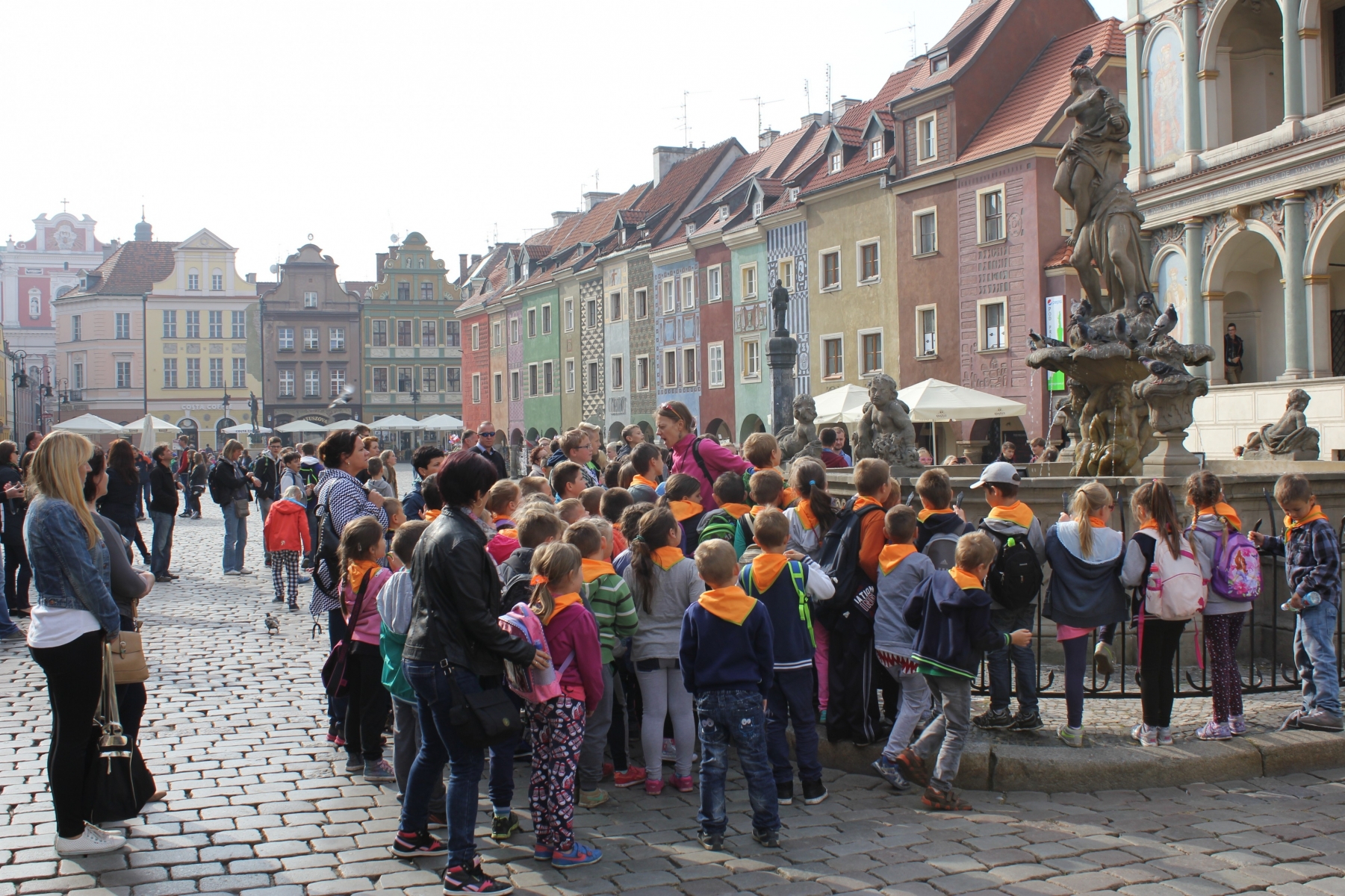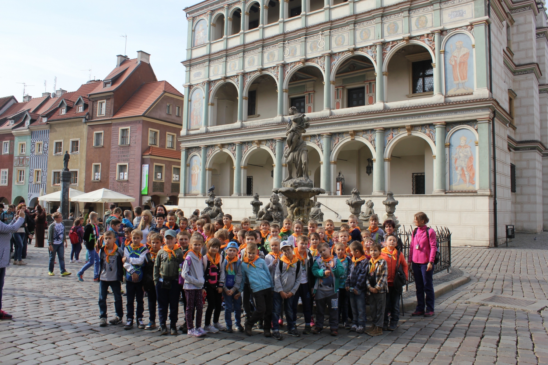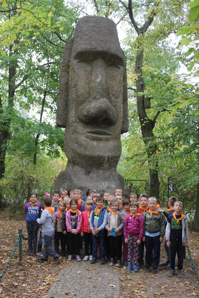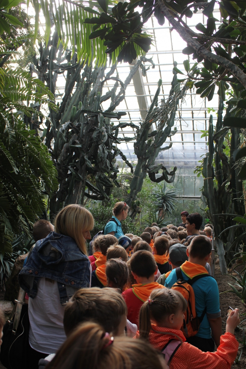Pierwszym punktem zwiedzania była Palmiarnia. Zobaczyliśmy drzewo cocacolowe, baobab, kiełbasiane, ogromne kaktusy, mnóstwo kwitnących storczyków i wiele innych egzotycznych roślin. Mogli samodzielnie nakarmić ryby w akwarium. Po tropikalnych roślinach kolejnym punktem wycieczki był spacer po Starym Mieście, mali turyści podziwiali architekturę dawnych kamienic i Ratusza. Tradycyjnie o godz. 12.00 obserwowali poznańskie koziołki, których historię przybliżyła nam pani przewodnik. Zaprowadziła również dzieci do Pomnika Koziołków, gdzie siadając na koziołku, każdy wymyślał życzenie i ściskał jego rogi, z nadzieją, że się spełni. Muzeum Powstania Wielkopolskiego to jeszcze trudny temat dla dzieci, ale przecież bliski – Powstańcy Wielkopolscy są przecież Patronem naszej szkoły. Dzieci z zainteresowaniem słuchały opowieści o tym jak nasi przodkowie walczyli o wolną i niepodległą Polskę i podziwiały powstańczy trud.