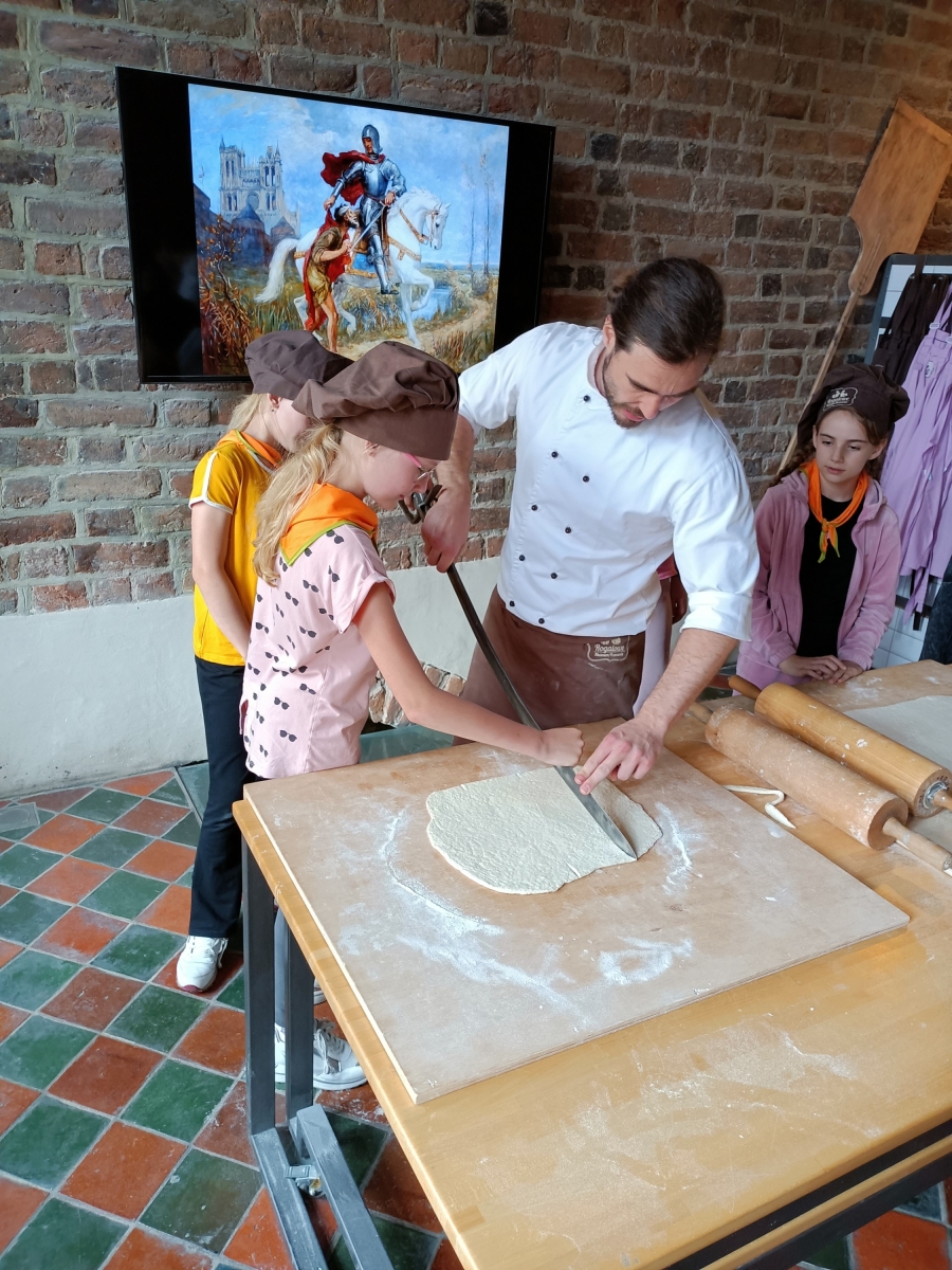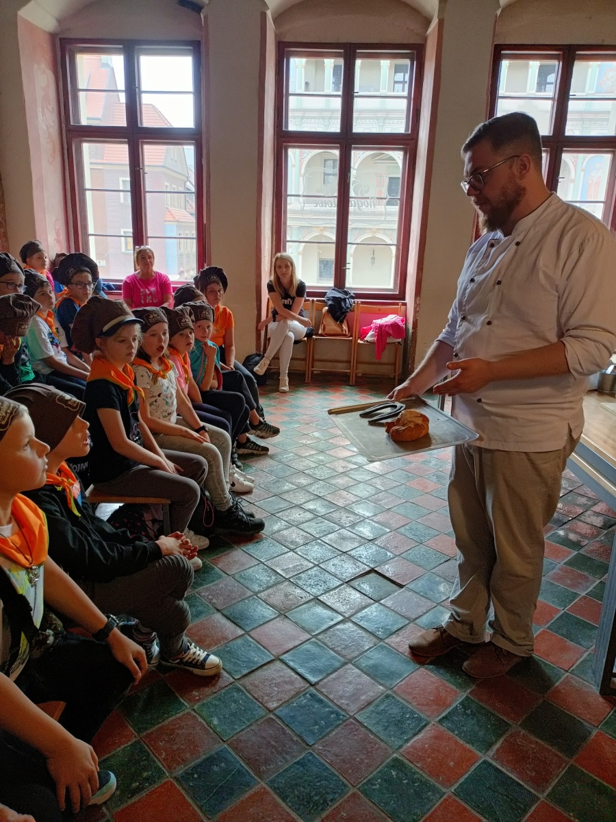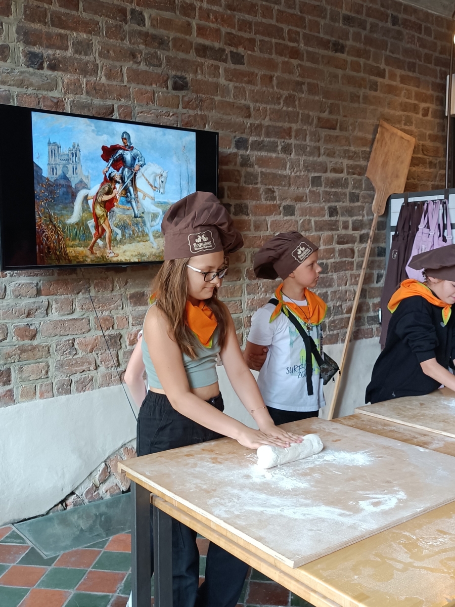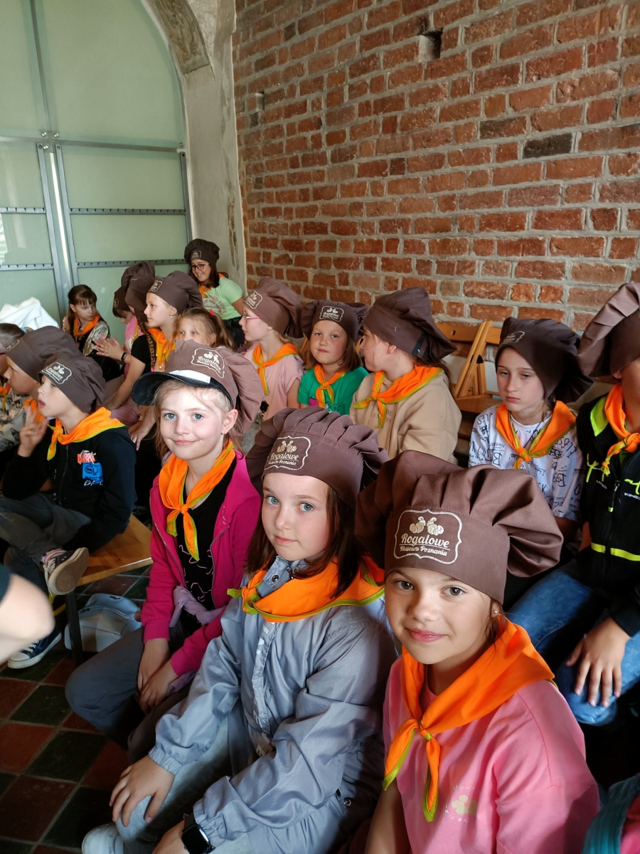 Potem wycieczka udała się do Rogalowego Muzeum na kulinarne odkrywanie Poznania. Rogal Świętomarciński to jeden z najsłynniejszych polskich wypieków, chroniony unijnym certyfikatem, pozwalającym wypiekać go według ścisłych wskazań, tylko w Wielkopolsce. Prawdziwą frajdą dla dzieci była możliwość poznania tajemnicy przepisu i własnoręcznego wyrobienia rogala. Przy okazji świetnej zabawy poznały również niektóre zwroty gwary czy historię miasta, ilustrowaną animacją „Rogalowa Historia Poznania”.