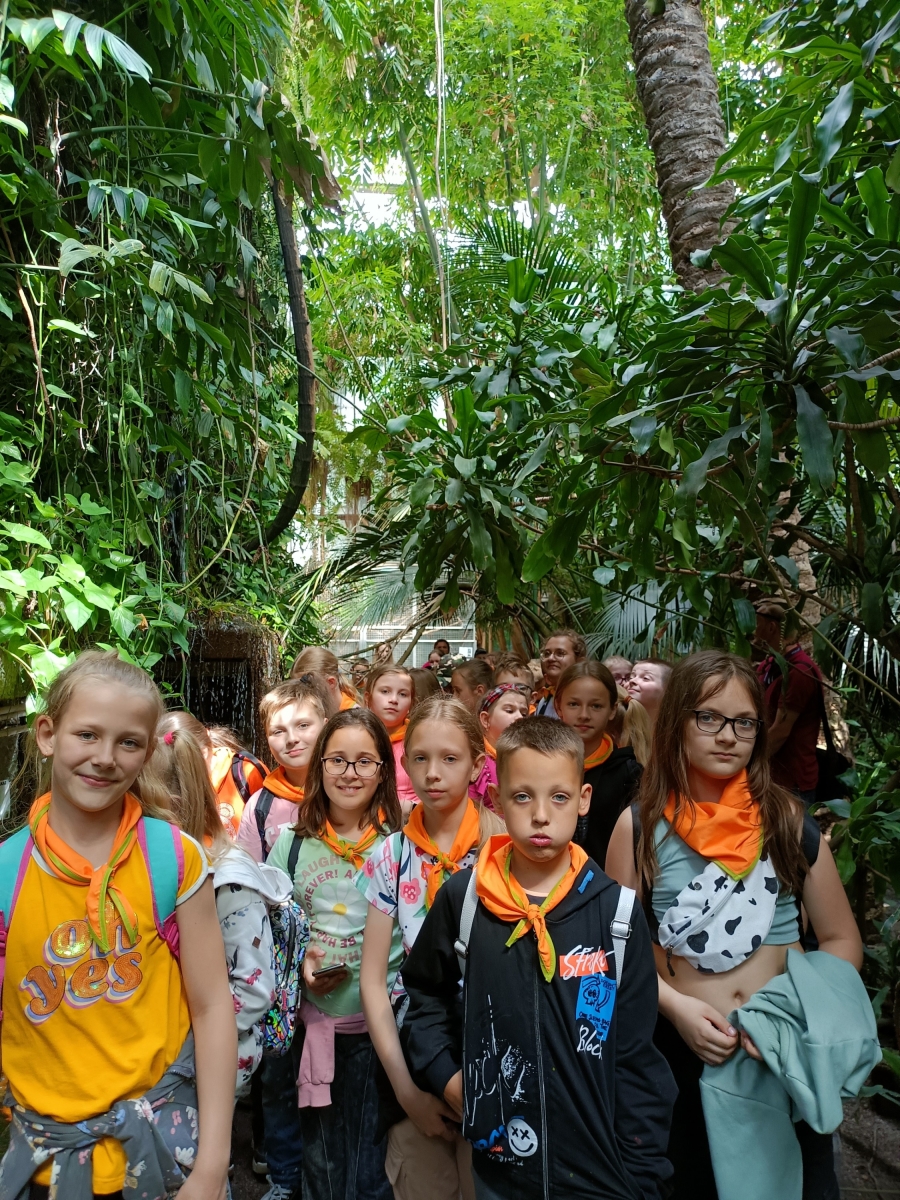 Po obiedzie autokar zawiózł trzeciaków do Palmiarnii, tam podziwiali odmienny klimat tropików, niezwykłą roślinność i egzotyczne ryby. Dużą atrakcją była kolorowa papuga Ara, która okazała dzieciom swoje zainteresowanie.