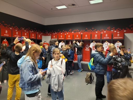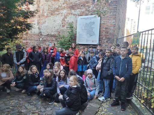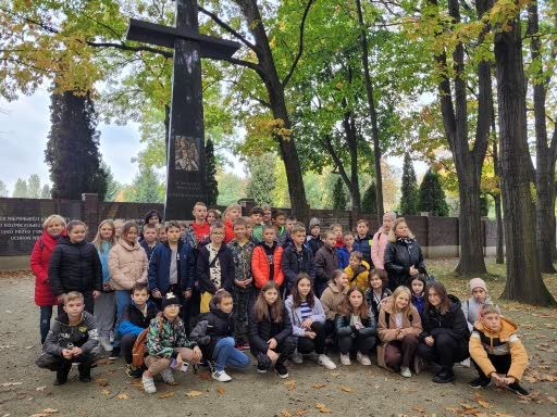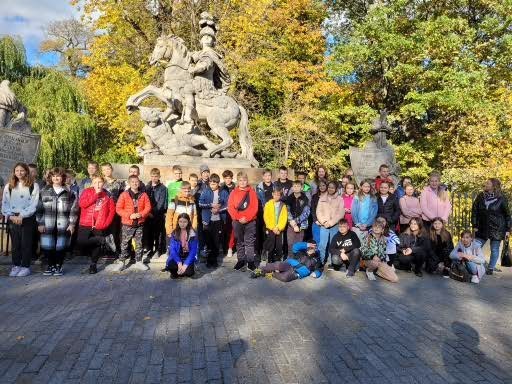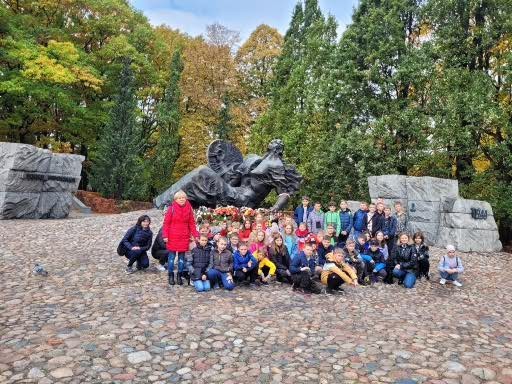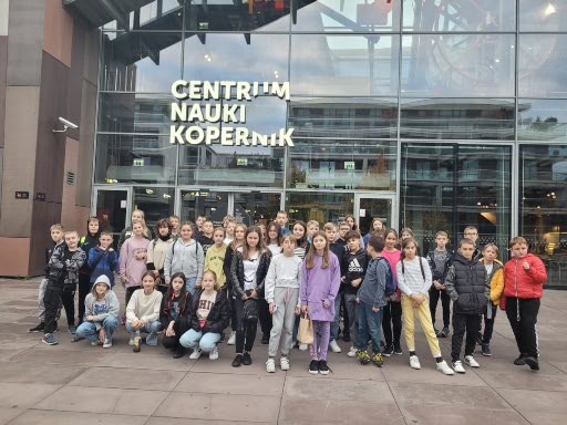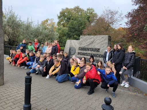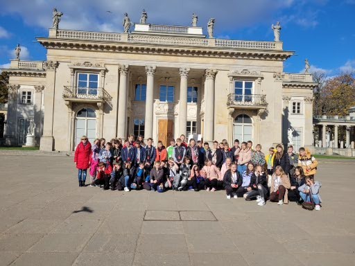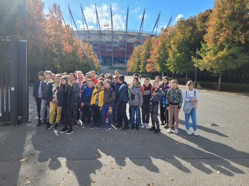 W dniach 11,12 października uczniowie klas VA i VB mieli okazję zwiedzić stolicę naszego kraju – Warszawę. Po szczęśliwej podróży około godz. 10-tej dotarliśmy do pierwszego punktu zwiedzania, Cmentarza Powstańców Warszawy, miejsca pochówku największej liczby mieszkańców Warszawy poległych w czasie powstania 1944 r. Uczniowie zobaczyli pomnik obrońcy Warszawy „Polegli Niepokonani”. Duże wrażenie zrobił tekst „modlitwy Bonawentury” czyli Jana Romockiego, którą napisał w wieku 17 lat. Była ona śpiewana przez powstańców warszawskich. Kolejnym punktem programu były Łazienki Królewskie i piękny Pałac Na Wodzie rozbudowany na życzenie króla Stanisława Augusta Poniatowskiego. Podziwialiśmy piękne wnętrza i rzeźby. W sali jadalnej, która dawnej pełniła funkcję sypialni, odbywały się organizowane przez władcę obiady czwartkowe. Wszelkie większe przyjęcia, zwłaszcza tańce i bale, organizowano w sali balowej. Była to letnia rezydencja króla. Piękna pogoda zachęciła nas do jesiennego spaceru po ogrodzie łazienkowskim. Wszędobylskie wiewiórki chętnie podchodziły do rąk dzieci po orzechy. Ruszyliśmy dalej ulicami Warszawy podziwiając wysokie wieżowce i nowoczesną architekturę miasta na kolejną lekcję historii walk Warszawiaków o wolność, tym razem w stronę warszawskiego getta. Pod jego murami usłyszeliśmy o ciężkim losie ludności pochodzenia żydowskiego podczas II wojny światowej. Stamtąd znowu wsiedliśmy do autokaru i pokonując Wisłę mostem Poniatowskiego dotarliśmy do Stadionu Narodowego. Jak prawdziwi kibice uczniowie zasiedli na krzesłach, mogli zwiedzić szatnie i wyjść na płytę stadionu. Wysłuchali kilku ciekawostek o sportowcach i gwiazdach koncertujących na stadionie. Na zakończenie pełnego wrażeń dnia mogliśmy spojrzeć na całą panoramę Warszawy z XXX piętra Pałacu Kultury i Nauki. Nieco zmęczeni udaliśmy się do zajazdu „Karczma pod bażantem”, gdzie czekała pyszna obiadokolacja i zakwaterowanie w wygodnych pokojach.