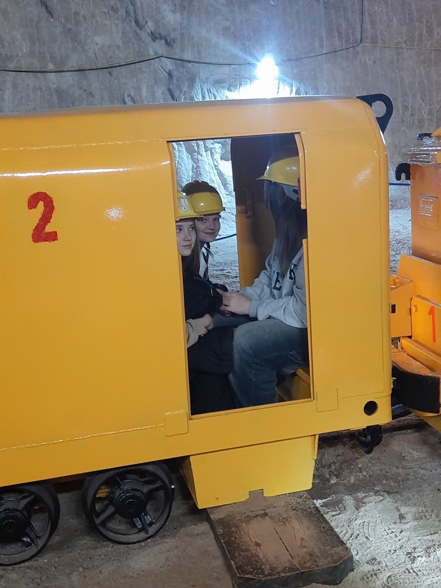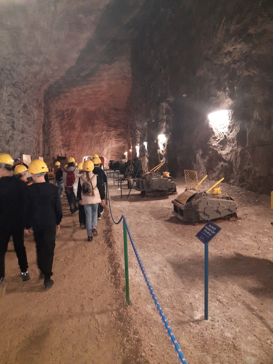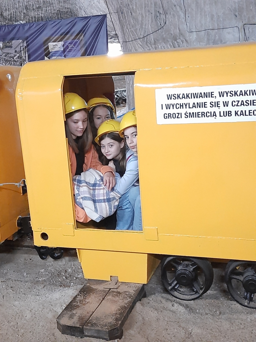 Po dotarciu na miejsce spotkaliśmy się z naszymi przewodnikami. Ze względów bezpieczeństwa wszyscy otrzymaliśmy górnicze kaski, a przewodnicy poinstruowali nas jak należy zachować się w kopalni. Zwiedzanie rozpoczęło się od zjazdu windą z prędkością 6 m/s. Było to niezapomniane przeżycie. Znaleźliśmy się 600 metrów pod ziemią na najgłębszej na świecie trasie turystycznej. Pod nami na głębokości 750 metrów pracowali górnicy. Rozpoczęliśmy wędrówkę solnymi korytarzowymi do kaplicy św. Kingi – patronki górników, gdzie wysłuchaliśmy legendy o św. Kindze i jej magicznym pierścieniu, który wskazał pokłady soli w Polsce. Zwiedzając wyeksploatowane komory solne poznaliśmy historię powstania kłodawskich złóż. Zobaczyliśmy maszyny używane w podziemnym górnictwie solnym. Byliśmy świadkami inscenizowanego wybuchu kruszącego solne skały. Dowiedzieliśmy się wiele o ciężkiej pracy górnika i różnych metodach pozyskiwania soli. Podziwialiśmy liczne solne rzeźby i witraże z soli. W jednej z potężnych sal odbywają się obchody górniczych świąt, a także inne uroczystości. Pobito tu rekord Guinnessa w kategorii – najniżej odbywający się koncert muzyczny na świecie wykonany przez orkiestrę kaliską. Kopalnia soli w Kłodawie wywarła na nas niesamowite wrażenie. Była to fascynująca i niezapomniana wyprawa do wnętrza Ziemi. Na pamiątkę każdy uczeń dostał bryłkę soli o pięknej barwie. Był także czas na kupienie pamiątek.