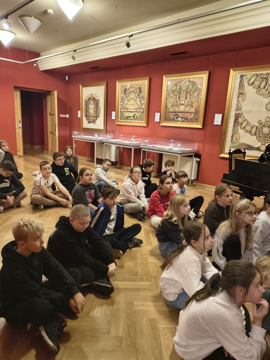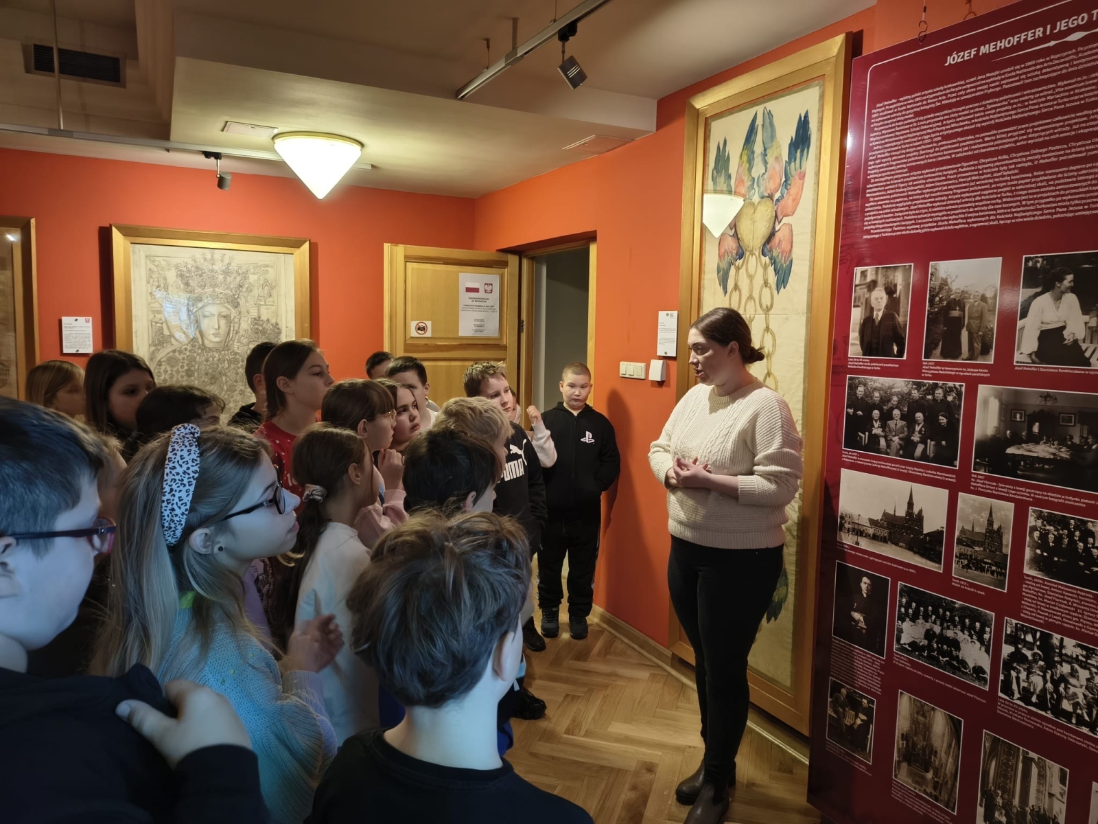 Pierwszym punktem programu było zwiedzanie Muzeum Miasta Turku ścieżką poświęconą Józefowi Mehofferowi – jednemu z najważniejszych artystów Młodej Polski. Pani przewodnik Marta w ciekawy, przystępny sposób opowiadała o życiu twórcy oraz jego najbardziej znanych dziełach. Dzieci dowiedziały się, że Mehoffer jest autorem wybitnych polichromii, m.in. w słynnym Kościele Mariackim w Krakowie oraz w kościele Najświętszego Serca Pana Jezusa w Turku, do którego został zaproszony przez księdza Józefa Florczaka. Dzięki temu mogły zobaczyć, jak ogromne znaczenie miała jego praca zarówno dla sztuki polskiej, jak i lokalnej historii.