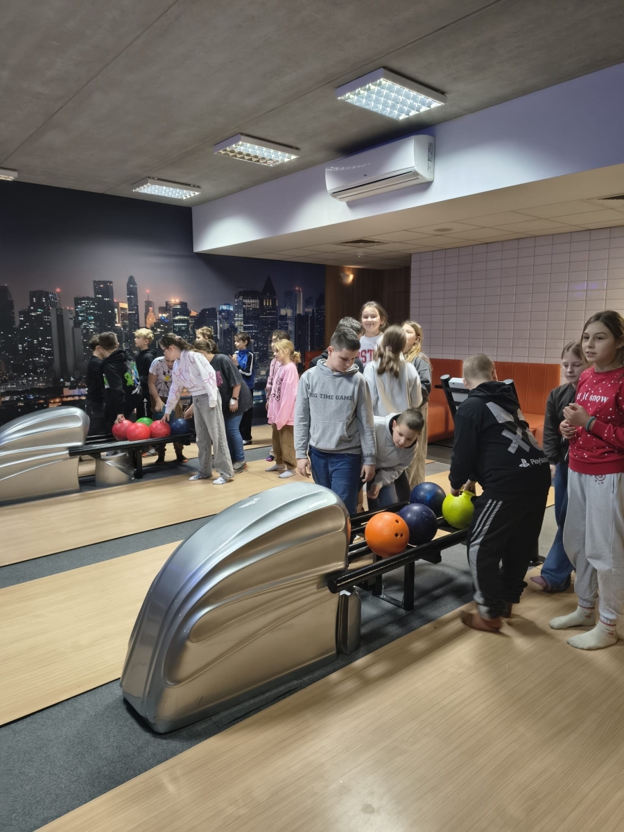 Po części edukacyjnej nastąpiła ta pełna radości. Uczniowie udali się do kręgielni w Turkovii, gdzie w ramach mikołajkowej atrakcji świetnie się bawili. Gra w kręgle wywołała wiele śmiechu, zdrowej rywalizacji i integracji. Warto podkreślić, że cała grupa była bardzo grzeczna, zdyscyplinowana, a wycieczka odbyła się bez telefonów, co sprzyjało wspólnej zabawie.