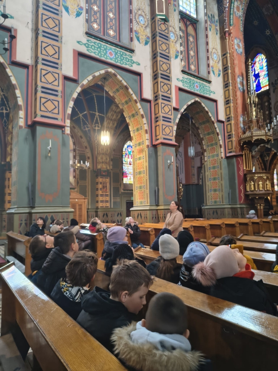 Kolejnym etapem wyjazdu było odwiedzenie kościoła NSPJ w Turku, gdzie dzieci mogły na własne oczy podziwiać polichromie i witraże Mehoffera – te same, o których chwilę wcześniej słyszały w muzeum.