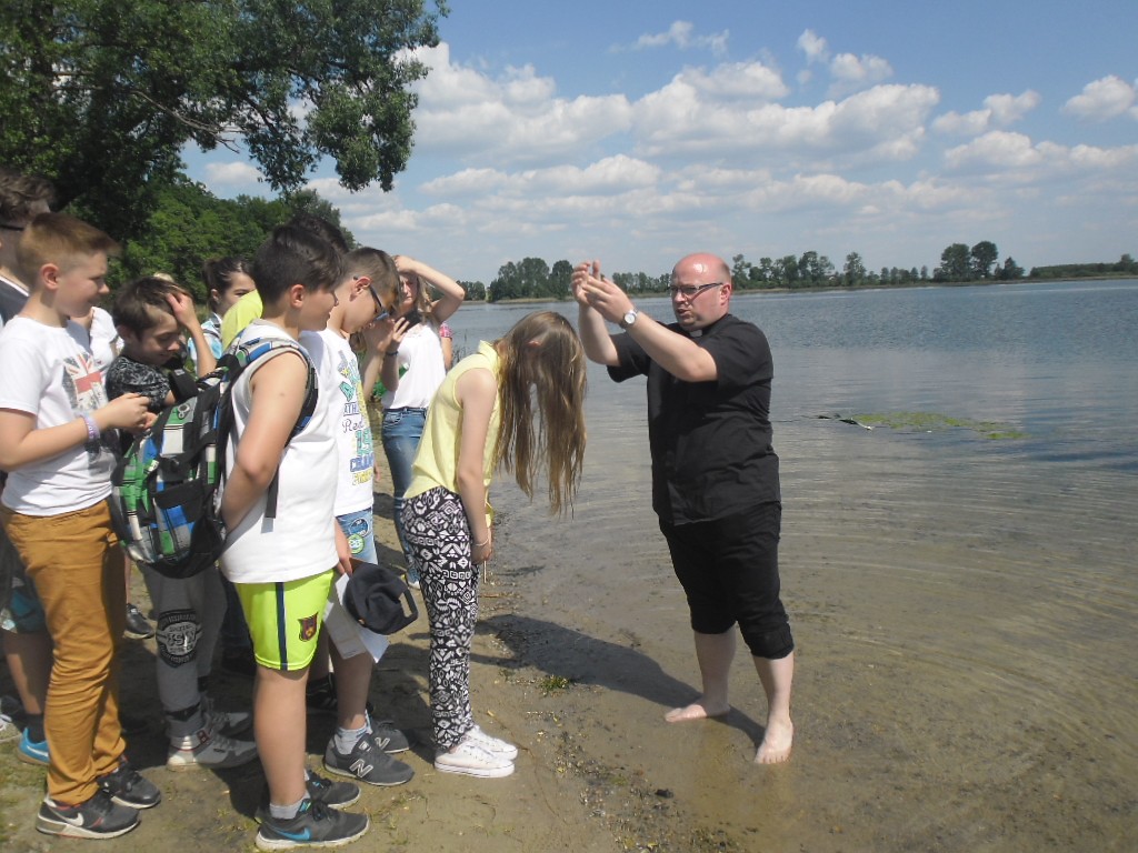 I tak też się stało. Nad brzegiem jeziora lednickiego w godzinie miłosierdzia (15.00) stanęliśmy jak przed wiekami nasi praojcowie i najpierw wyznaliśmy naszą wiarę w Jezu Chrysta, a potem symbolicznie każdy pochylając się na wodą otrzymał krople wody z „Pierwszej Chrzcielnicy Polski” na swoją głowę.