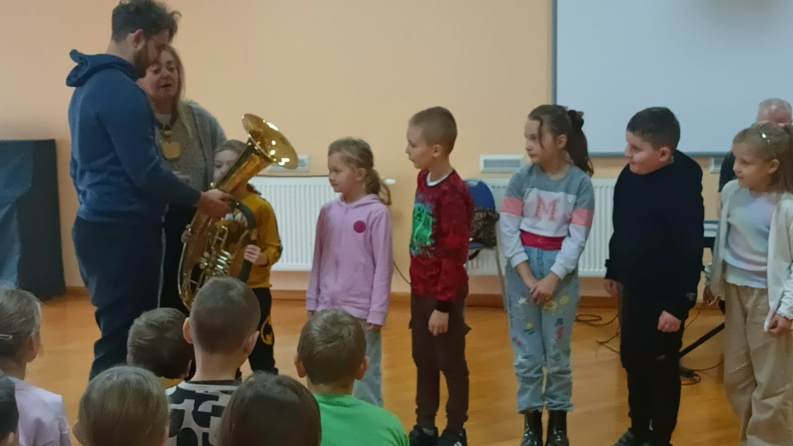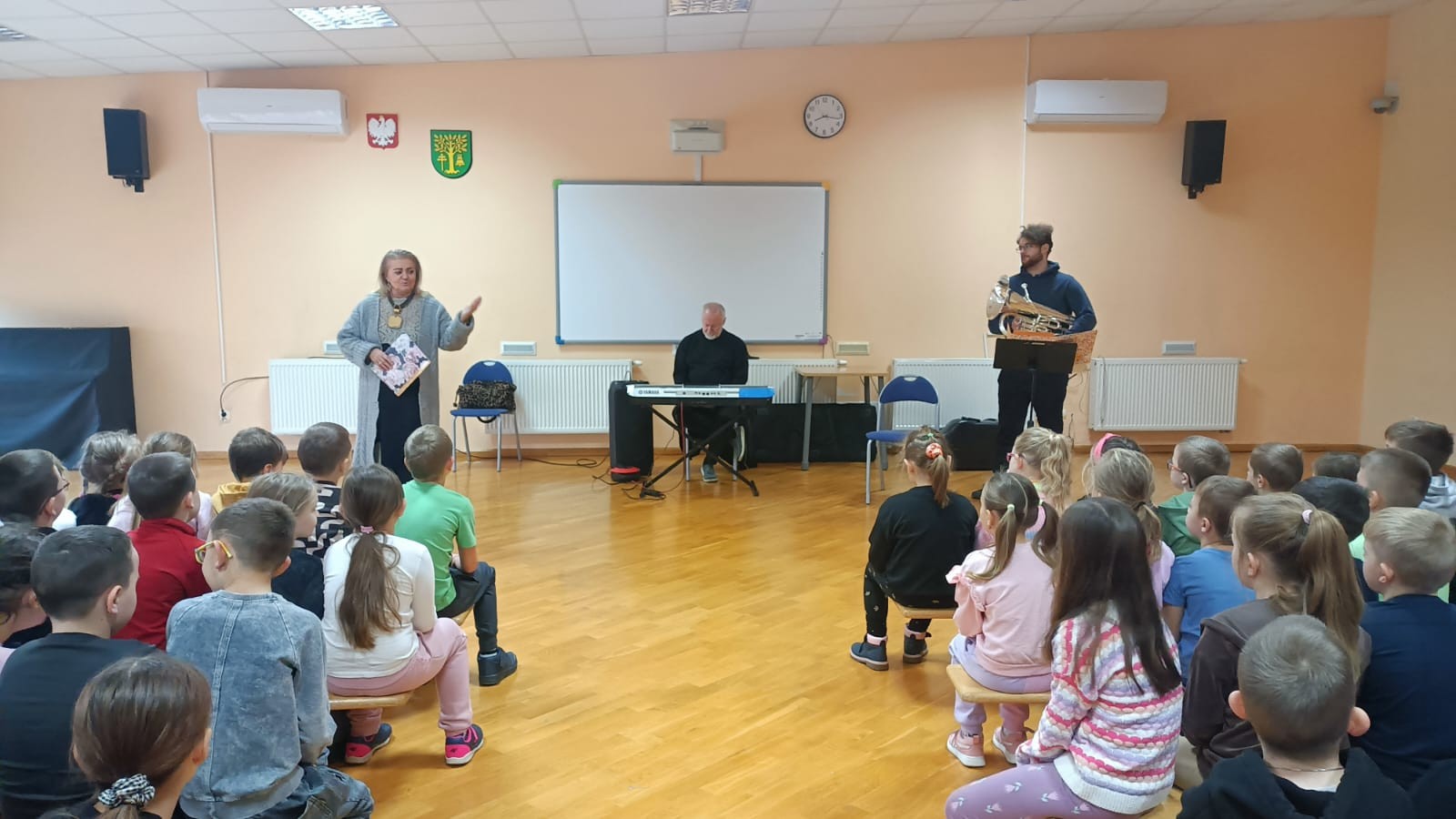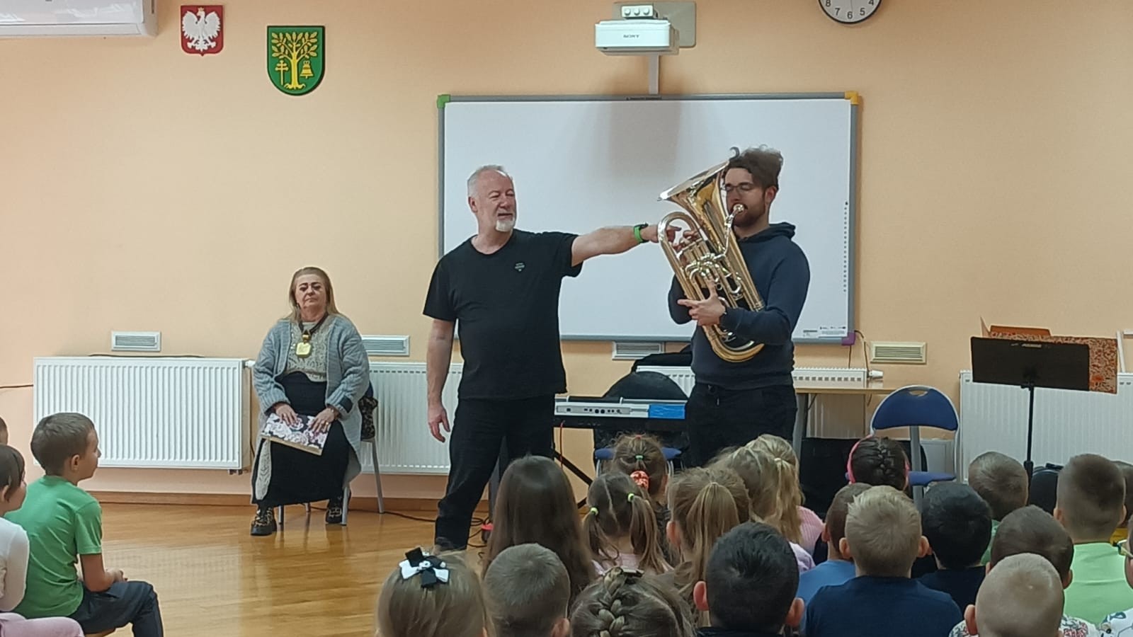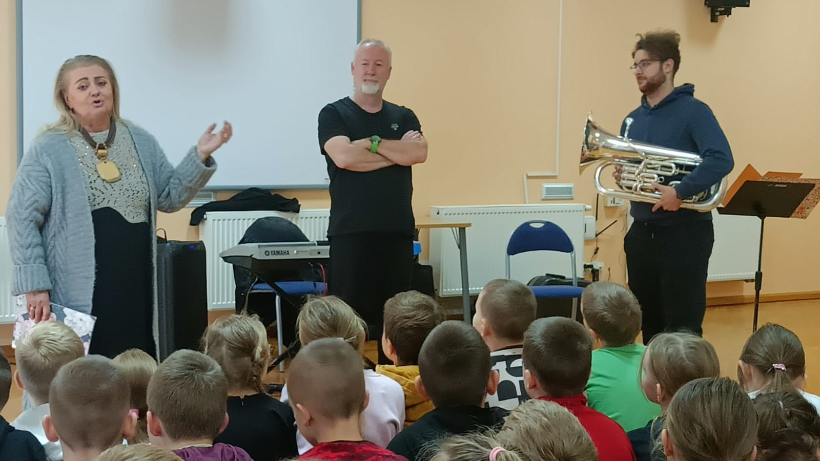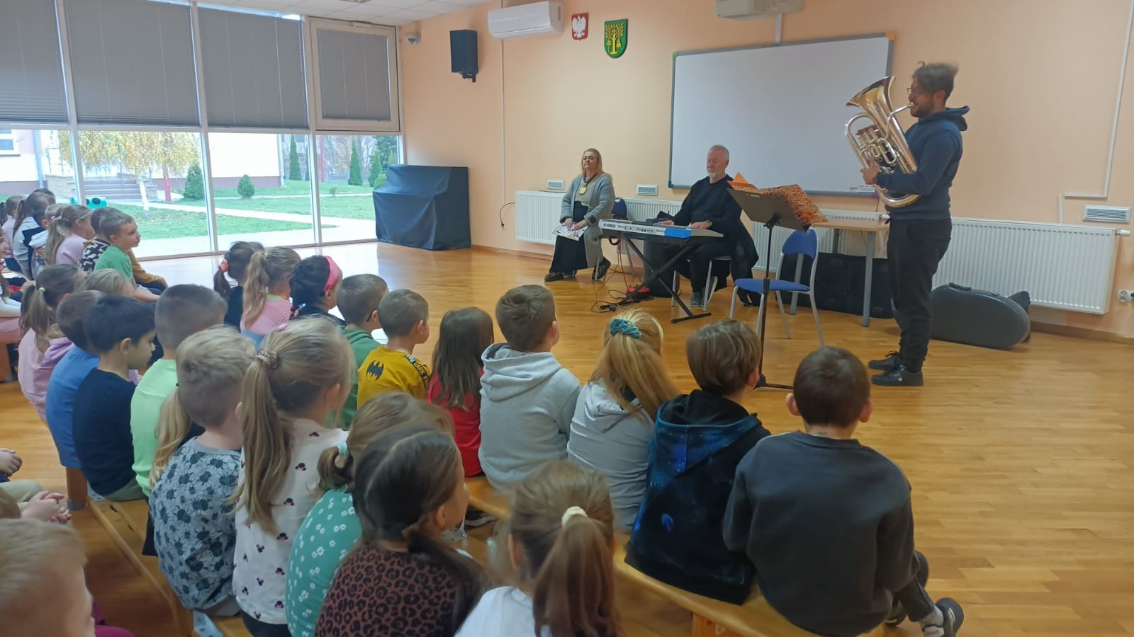 W dniu 14 listopada 2025r. w Szkole Podstawowej w Malanowie odbyła się kolejna z zaplanowanych audycji muzycznych pt. „Z nutką patriotyzmu”. Jak na miesiąc listopad przystało tematem przewodnim były polskie pieśni i utwory patriotyczne, które są nieodłącznym elementem naszej historii i kultury, wyrażają uczucia i emocje związane z Ojczyzną. Bohaterem muzycznym był jednak bardzo rzadko spotykany instrument - eufonium, należący do grupy instrumentów dętych blaszanych. Jego ciepłe i bogate brzmienie o szerokim zakresie tonalnym, czyni go popularnym zarówno w orkiestrach dętych, jak i w muzyce solowej. W kontekście technicznym eufonium działa na zasadzie wytwarzania dźwięku poprzez wibracje warg muzyka w ustniku. Instrument wyposażony jest w cztery wentyle, a specyfiki brzmienia dodaje mu sam muzyk. Pan Michał Wójcik, zaproszony muzyk wraz z panem Sławomirem zaprezentowali zebranym budowę instrumentu, a wybrani uczniowie mieli okazję zagrać dźwięki, które udało się im wydobyć. Nasz „biało-czerwony repertuar” jest piękny, bardzo różnorodny oraz symboliczny. Pierwszym zaprezentowanym utworem, który w swoim charakterze przypisany jest do kanonu pieśni patriotycznych był „Marsz pierwszej brygady”. Utwór o bogatej i ciekawej historii powstania, napisany około 1905r. Śpiewany przez I Brygadę Legionów Polskich Józefa Piłsudskiego, a melodycznie znany jako „Marsz Kielecki nr. 10. Pan Sławomir interesująco opowiadał dzieciom ciekawostki związane z jego powstaniem. Przy tej okazji, przypomniane zostały nazwy wszystkich polskich tańców narodowych (krakowiak, polonez, mazur, oberek i kujawiak), które uczniowie doskonale i bezbłędnie wymienili. Pieśń pt.: „O mój rozmarynie „ grana i śpiewana wspólnie przez prowadzących i dzieci dała okazję do przypomnienia kim byli Ułani. Dzieci poznały także specyfikę gry instrumentów wykorzystywanych przez orkiestry dęte, które to najczęściej obserwować można w czasie defilad i marszów patriotycznych. Polskie pieśni patriotyczne wciąż są żywe. Śpiewa się je podczas uroczystości państwowych, koncertów i apeli szkolnych, a także czasem w rodzinnych domach. Wszyscy bardzo chętnie i aktywnie uczestniczyli w tej audycji.