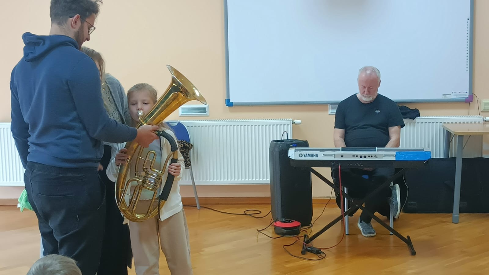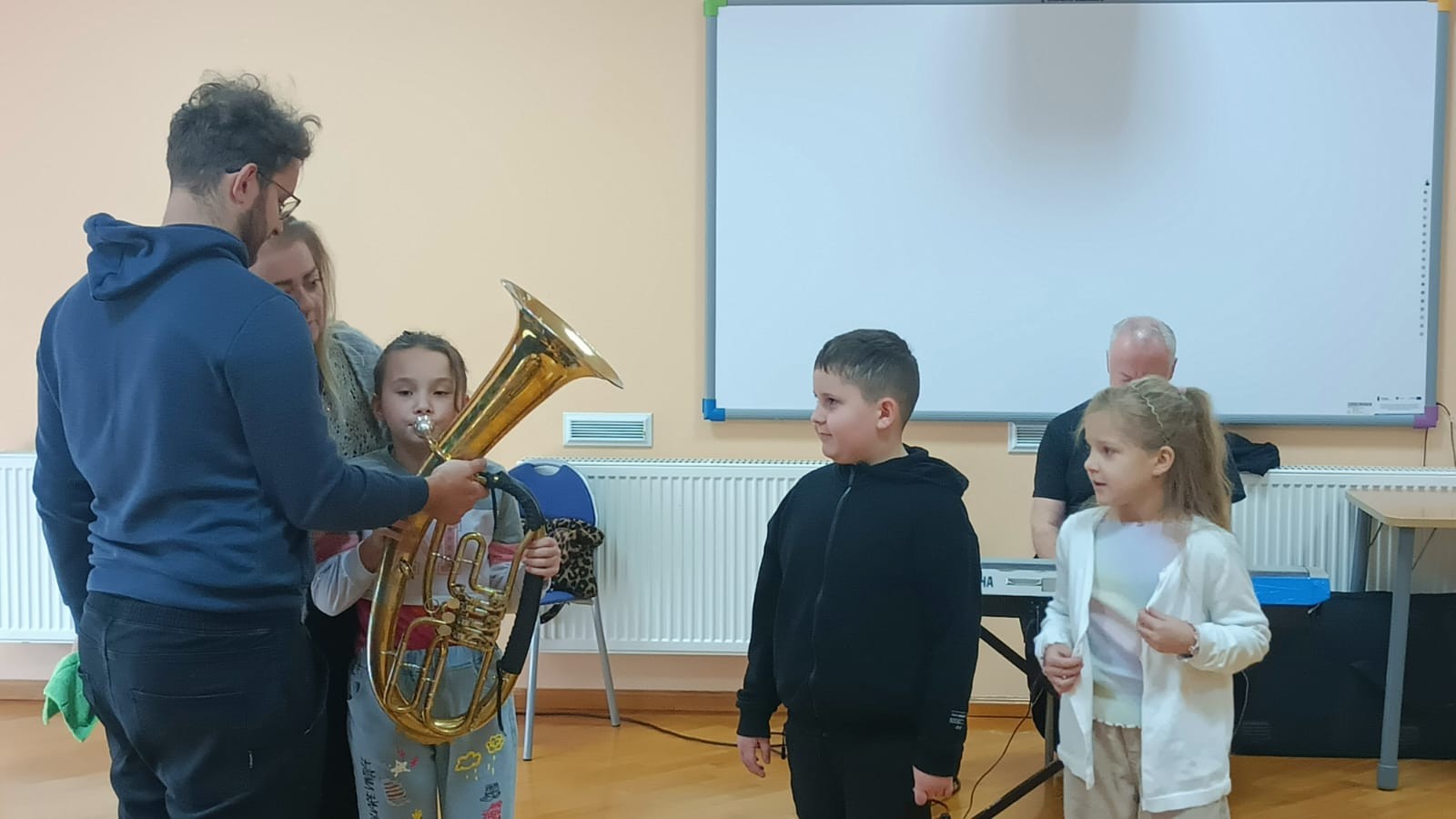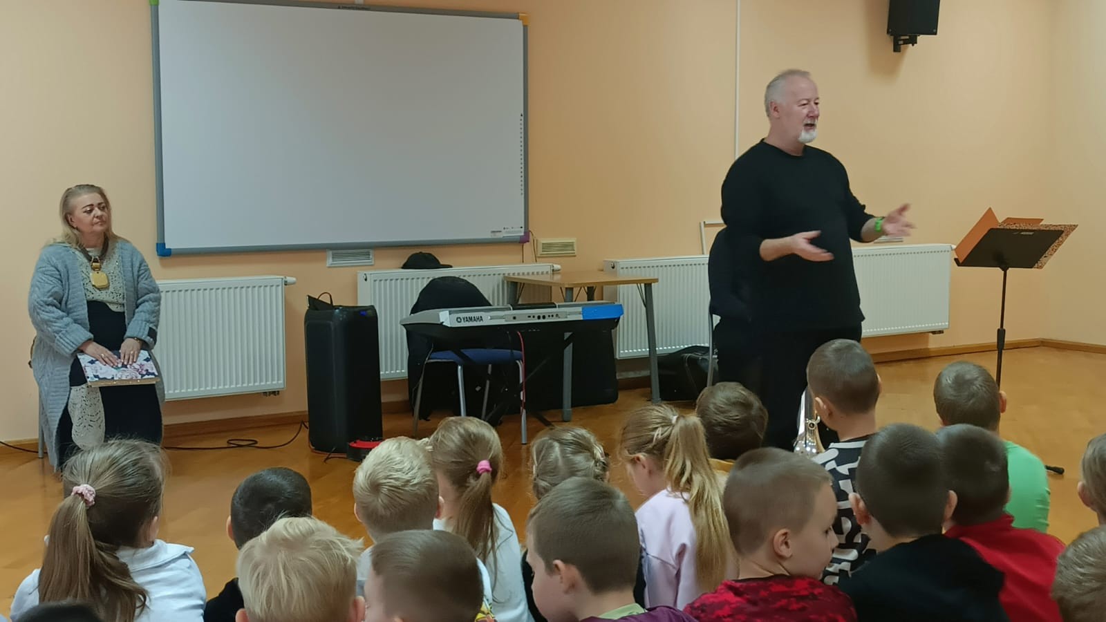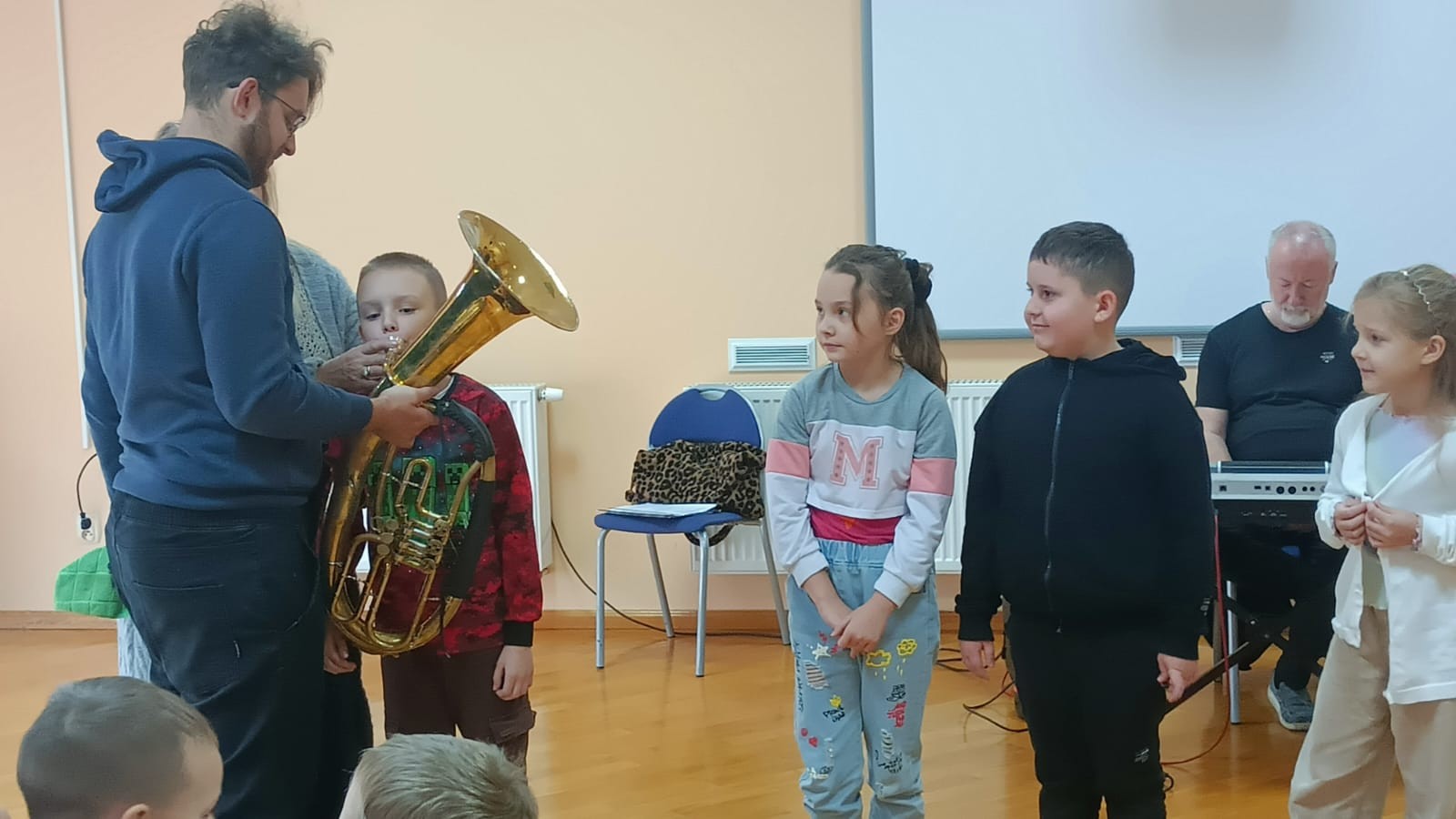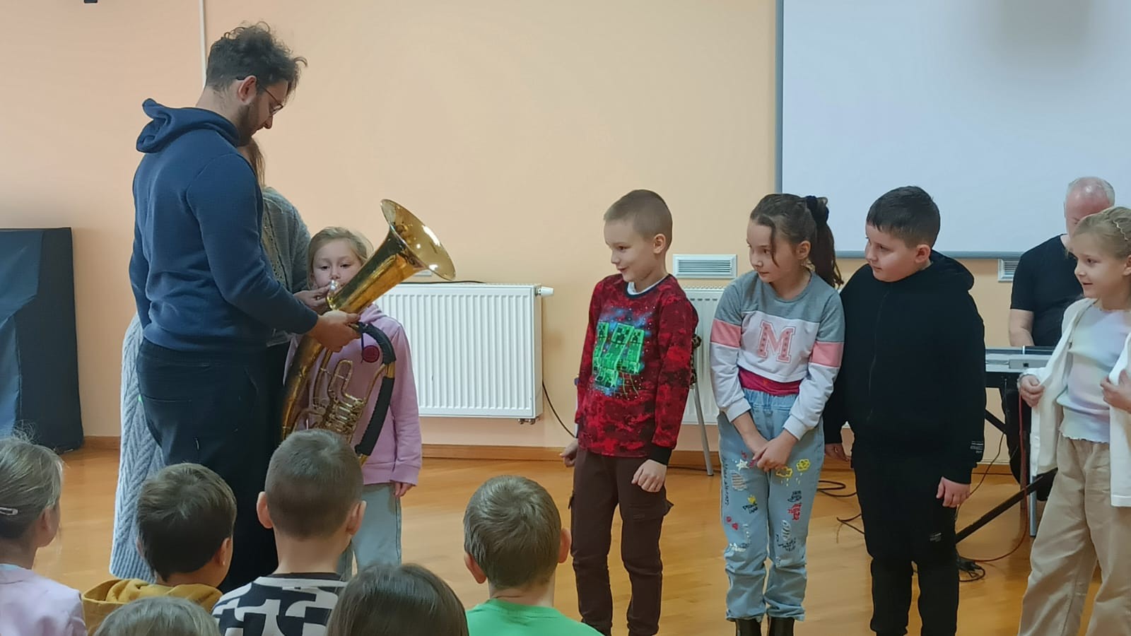 W dniu 14 listopada 2025r. w Szkole Podstawowej w Malanowie odbyła się kolejna z zaplanowanych audycji muzycznych pt. „Z nutką patriotyzmu”. Jak na miesiąc listopad przystało tematem przewodnim były polskie pieśni i utwory patriotyczne, które są nieodłącznym elementem naszej historii i kultury, wyrażają uczucia i emocje związane z Ojczyzną. Bohaterem muzycznym był jednak bardzo rzadko spotykany instrument - eufonium, należący do grupy instrumentów dętych blaszanych. Jego ciepłe i bogate brzmienie o szerokim zakresie tonalnym, czyni go popularnym zarówno w orkiestrach dętych, jak i w muzyce solowej. W kontekście technicznym eufonium działa na zasadzie wytwarzania dźwięku poprzez wibracje warg muzyka w ustniku. Instrument wyposażony jest w cztery wentyle, a specyfiki brzmienia dodaje mu sam muzyk. Pan Michał Wójcik, zaproszony muzyk wraz z panem Sławomirem zaprezentowali zebranym budowę instrumentu, a wybrani uczniowie mieli okazję zagrać dźwięki, które udało się im wydobyć. Nasz „biało-czerwony repertuar” jest piękny, bardzo różnorodny oraz symboliczny. Pierwszym zaprezentowanym utworem, który w swoim charakterze przypisany jest do kanonu pieśni patriotycznych był „Marsz pierwszej brygady”. Utwór o bogatej i ciekawej historii powstania, napisany około 1905r. Śpiewany przez I Brygadę Legionów Polskich Józefa Piłsudskiego, a melodycznie znany jako „Marsz Kielecki nr. 10. Pan Sławomir interesująco opowiadał dzieciom ciekawostki związane z jego powstaniem. Przy tej okazji, przypomniane zostały nazwy wszystkich polskich tańców narodowych (krakowiak, polonez, mazur, oberek i kujawiak), które uczniowie doskonale i bezbłędnie wymienili. Pieśń pt.: „O mój rozmarynie „ grana i śpiewana wspólnie przez prowadzących i dzieci dała okazję do przypomnienia kim byli Ułani. Dzieci poznały także specyfikę gry instrumentów wykorzystywanych przez orkiestry dęte, które to najczęściej obserwować można w czasie defilad i marszów patriotycznych. Polskie pieśni patriotyczne wciąż są żywe. Śpiewa się je podczas uroczystości państwowych, koncertów i apeli szkolnych, a także czasem w rodzinnych domach. Wszyscy bardzo chętnie i aktywnie uczestniczyli w tej audycji.