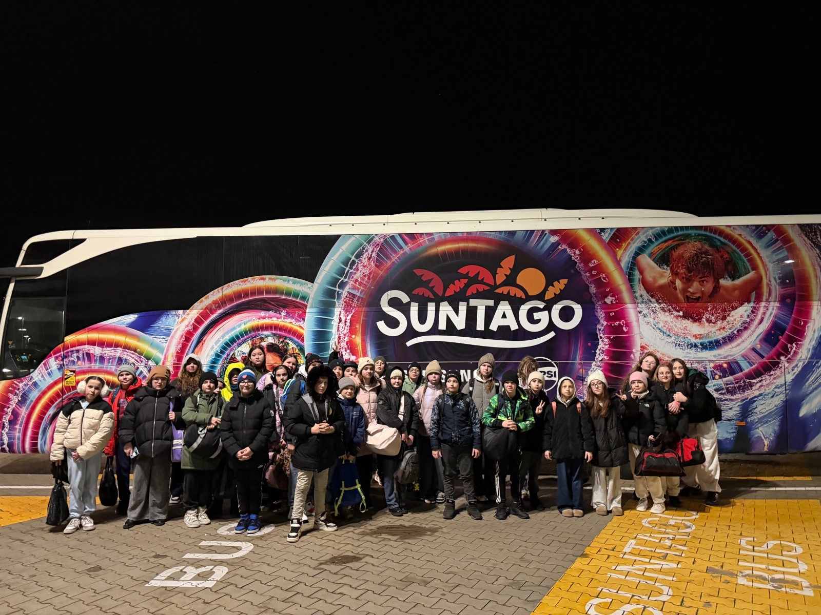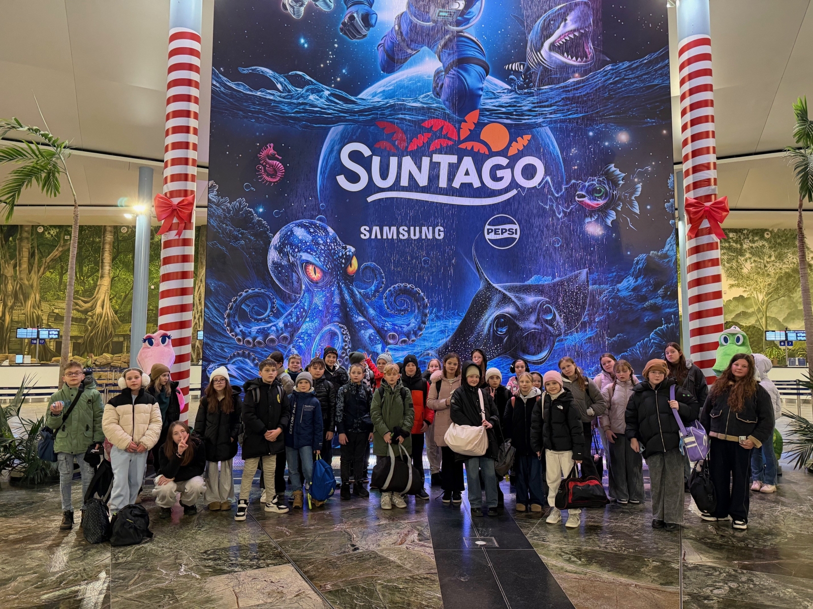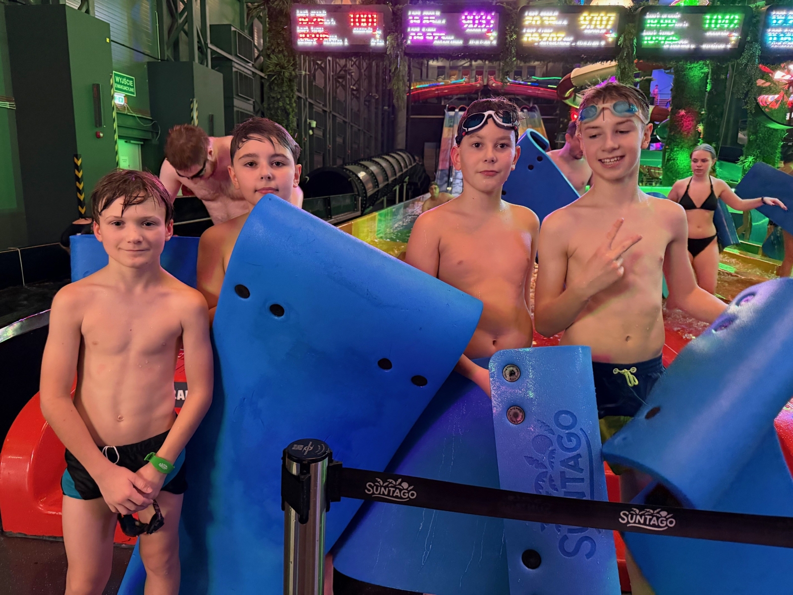 10 grudnia 2025 r uczniowie klas V a i b wraz z opiekunami panią Dorotą Cyran Małgorzata Przybylak i Milena Dewicka Glapa oraz Panem Arkadiuszem Musialkiewiczem i Tata Sebastiana Panem Krzysztofem Sieradzanem wybrali się do Aquaparku Suntago. Celem wyjazdu było zapoznanie z formami aktywnego spędzania czasu wolnego na basenie, bezpieczne gry i zabawy w wodzie, zgłębienie wiedzy o technikach pływania, kształtowanie właściwych zachowań w miejscach publicznych. Na basenie uczestnicy wycieczki korzystali z jacuzzi, zjeżdżalni, brodzika, basenu z biczami wodnymi,